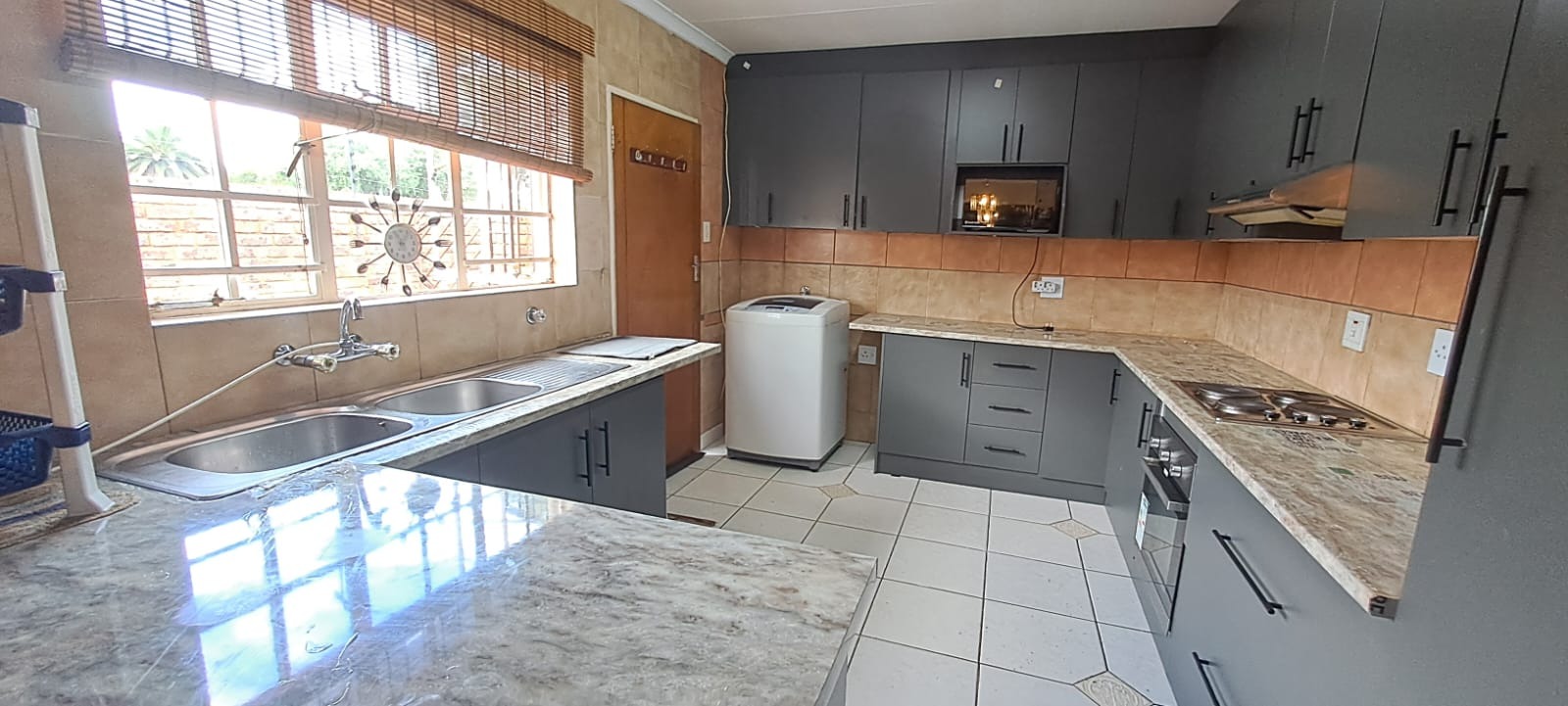 A welcoming entrance leads into generous living areas, including a spacious lounge and separate dining room, ideal for both everyday family living and effortless entertaining. The kitchen is well-appointed with granite countertops, a hob, and extractor fan, creating a functional and stylish workspace.