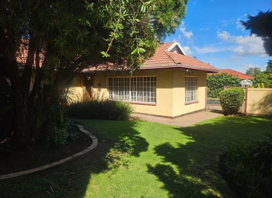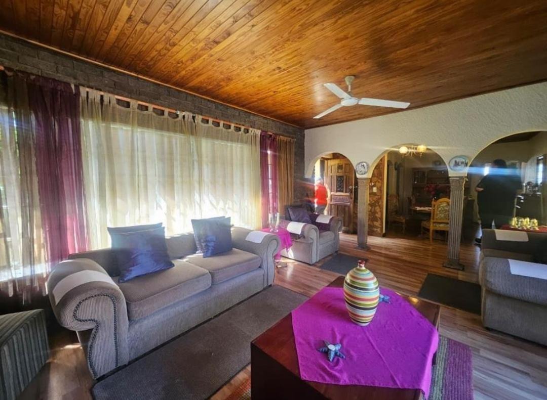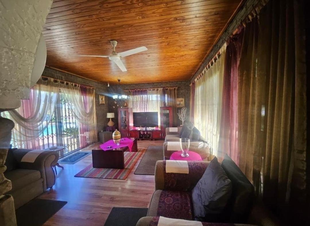 Inside, discover an inviting open-plan lounge and dining room, creating a fluid and sociable living environment. The main kitchen is thoughtfully designed and includes a convenient pantry. Additional living space is provided by a dedicated family TV room. The home benefits from charming wood ceilings and a cozy fireplace, adding character and warmth. The exterior is equally appealing, designed for enjoyment and functionality. A sparkling swimming pool offers a refreshing escape, complemented by a lapa and a built-in braai, ideal for outdoor gatherings. The established garden provides a serene backdrop, while paving ensures neat pathways. Practical amenities include two garages and ample additional parking, along with water tanks. Security is enhanced with an access gate and burglar bars.