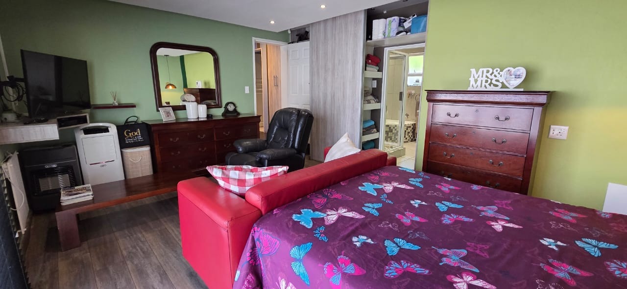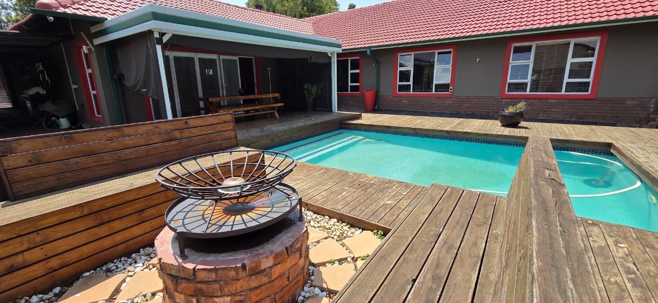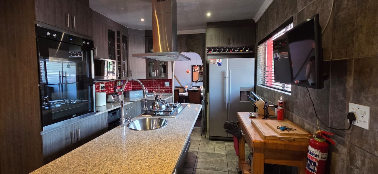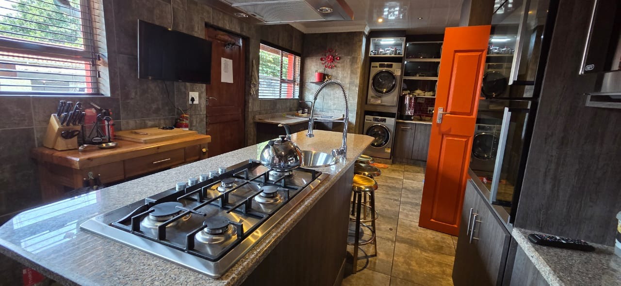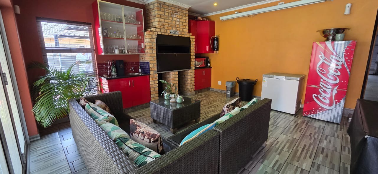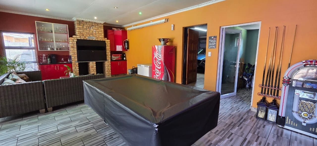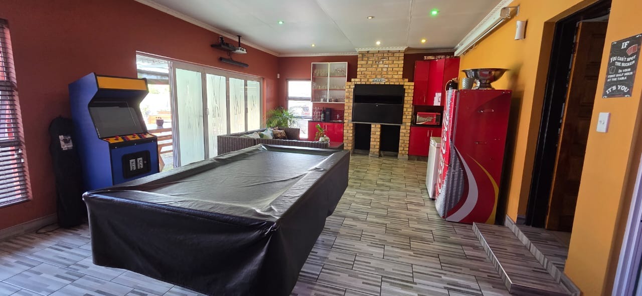 Step inside to a bright and airy open-plan lounge with a welcoming fireplace, flowing seamlessly into a family and entertainment area complete with a built-in braai and pool table—ideal for social gatherings or relaxed family time. A separate dining area connects to a sleek, modern kitchen featuring granite countertops, a centre island with gas hob, ample storage, a breakfast nook, and high-quality appliances, perfect for culinary enthusiasts.