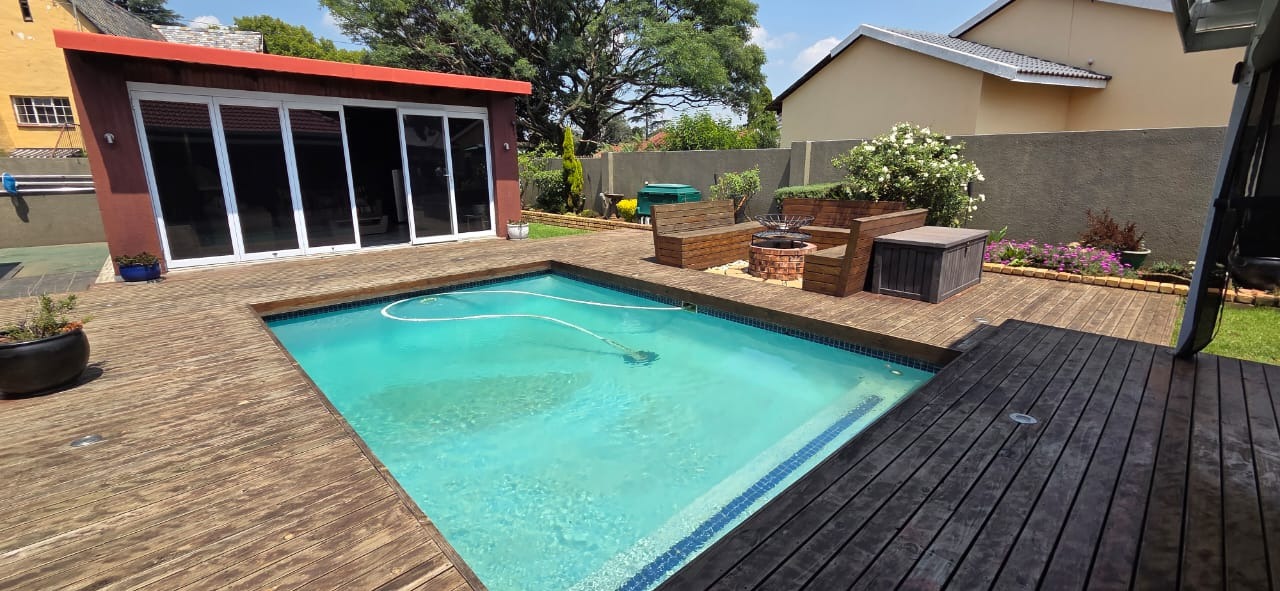 The property offers four spacious, sun-filled bedrooms, including a luxurious main suite with a double shower en-suite. Two stylish bathrooms service the home, while additional spaces such as a private study and a sunken cinema room provide versatility for work and leisure. The family room opens via aluminium stacker doors onto a covered entertainment deck overlooking the sparkling pool and firepit boma, complemented by a poolside entertainment room with wood decking.