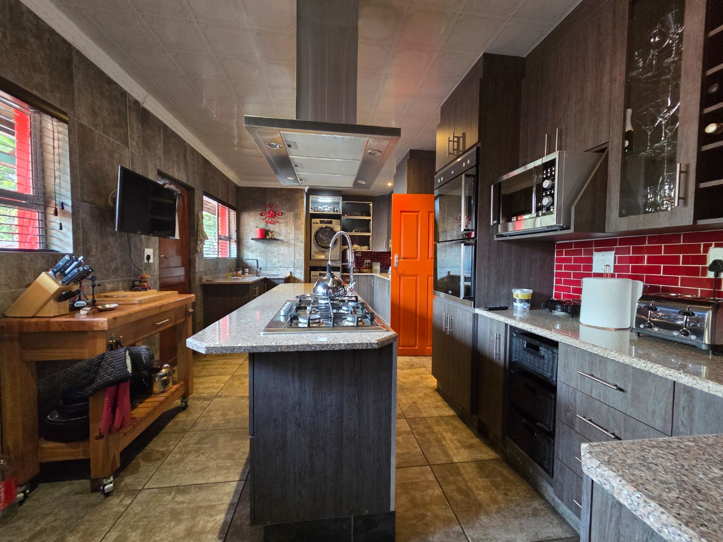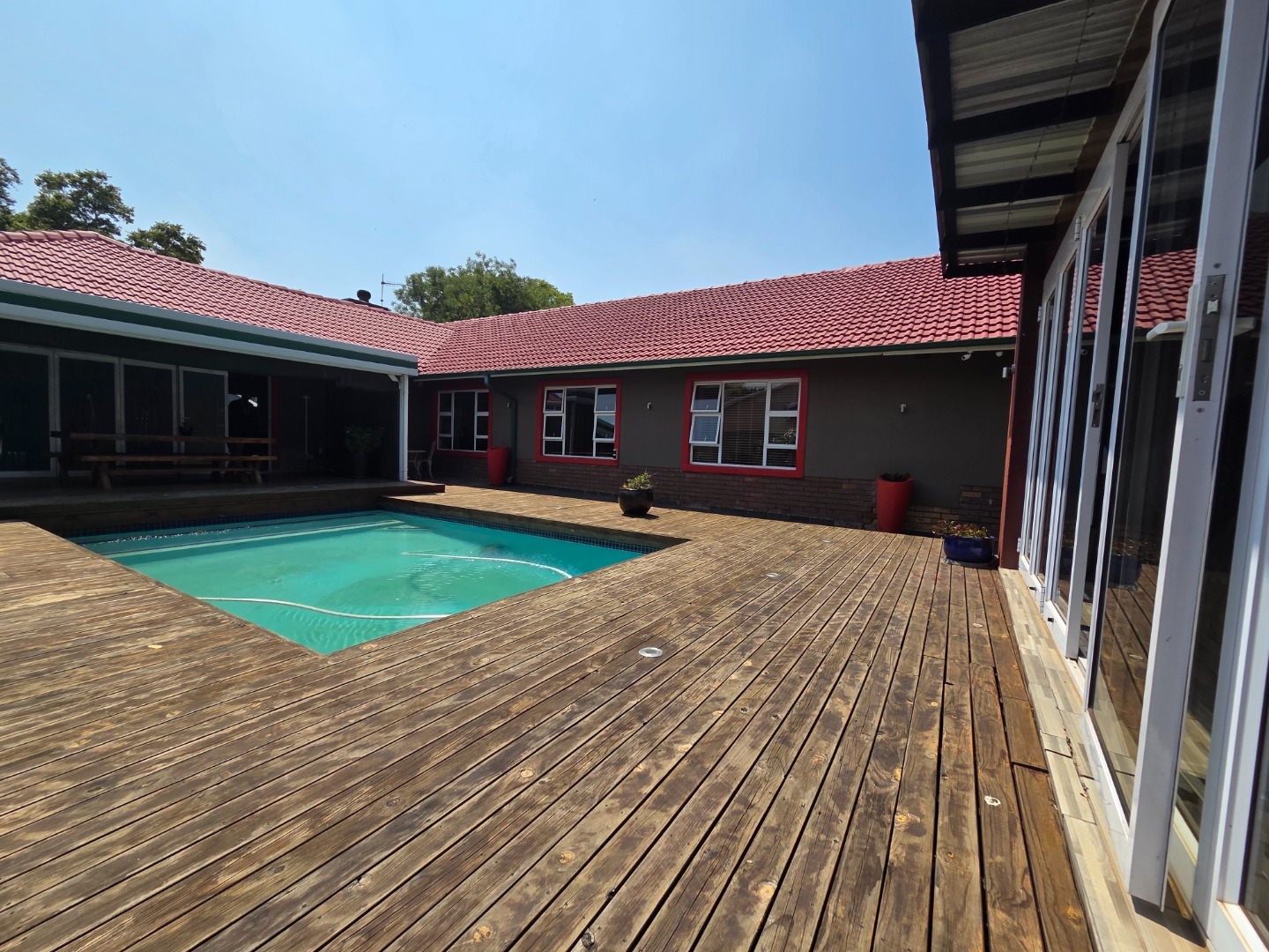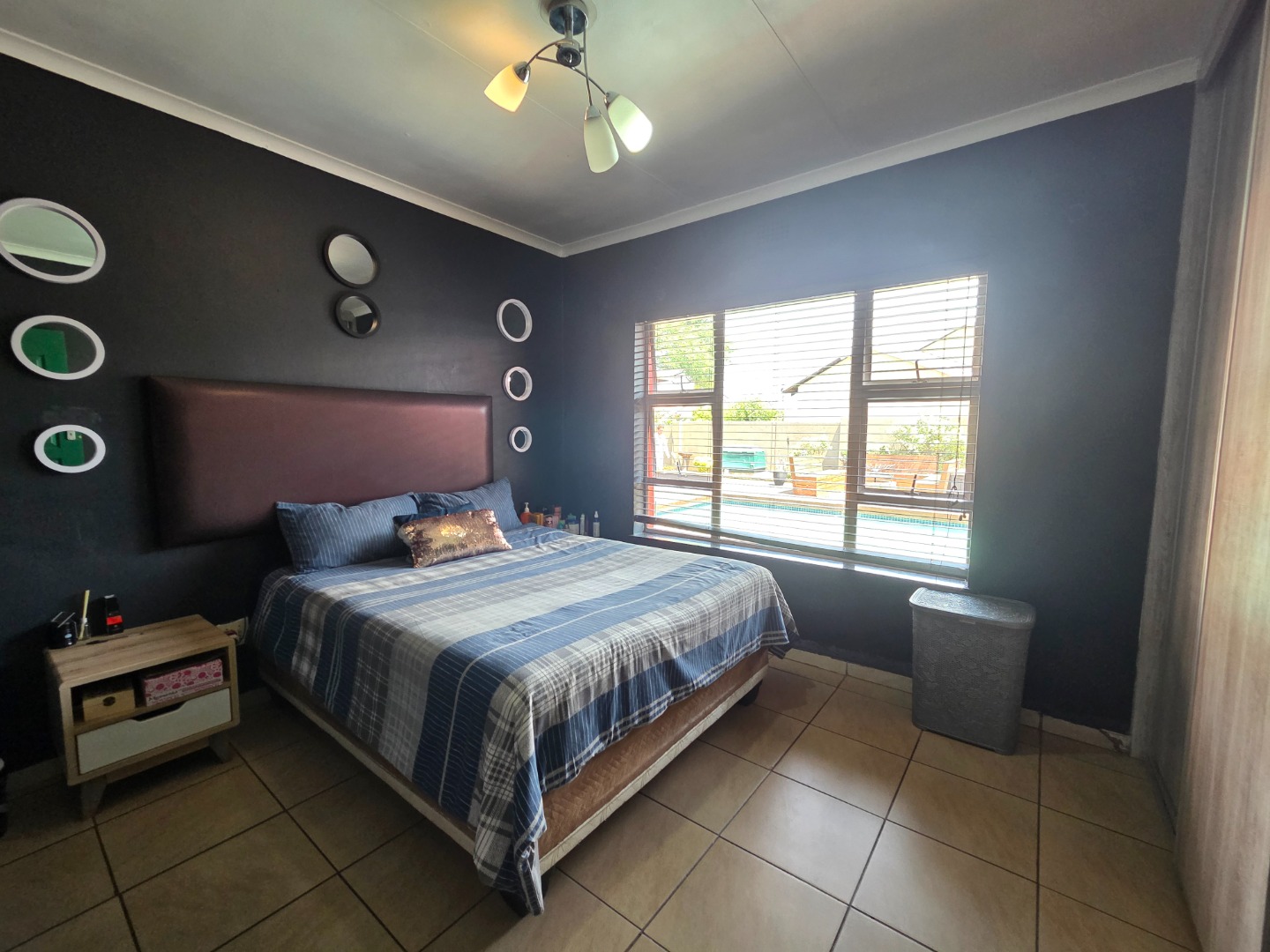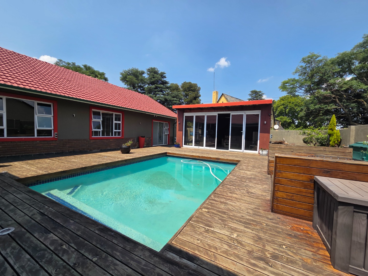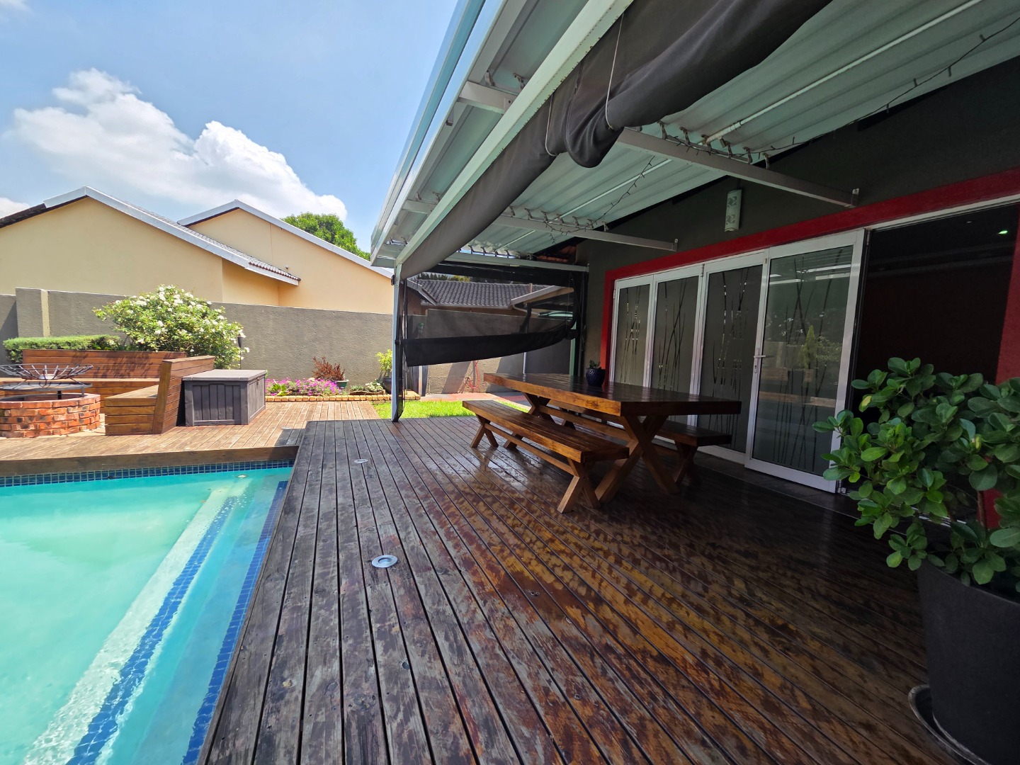 A dedicated dining room and study—which can easily be converted into a cinema room or private office—add versatility to the layout. The entertainment room features a built-in braai and sliding doors that open onto a patio overlooking the swimming pool and garden, ideal for relaxed gatherings.