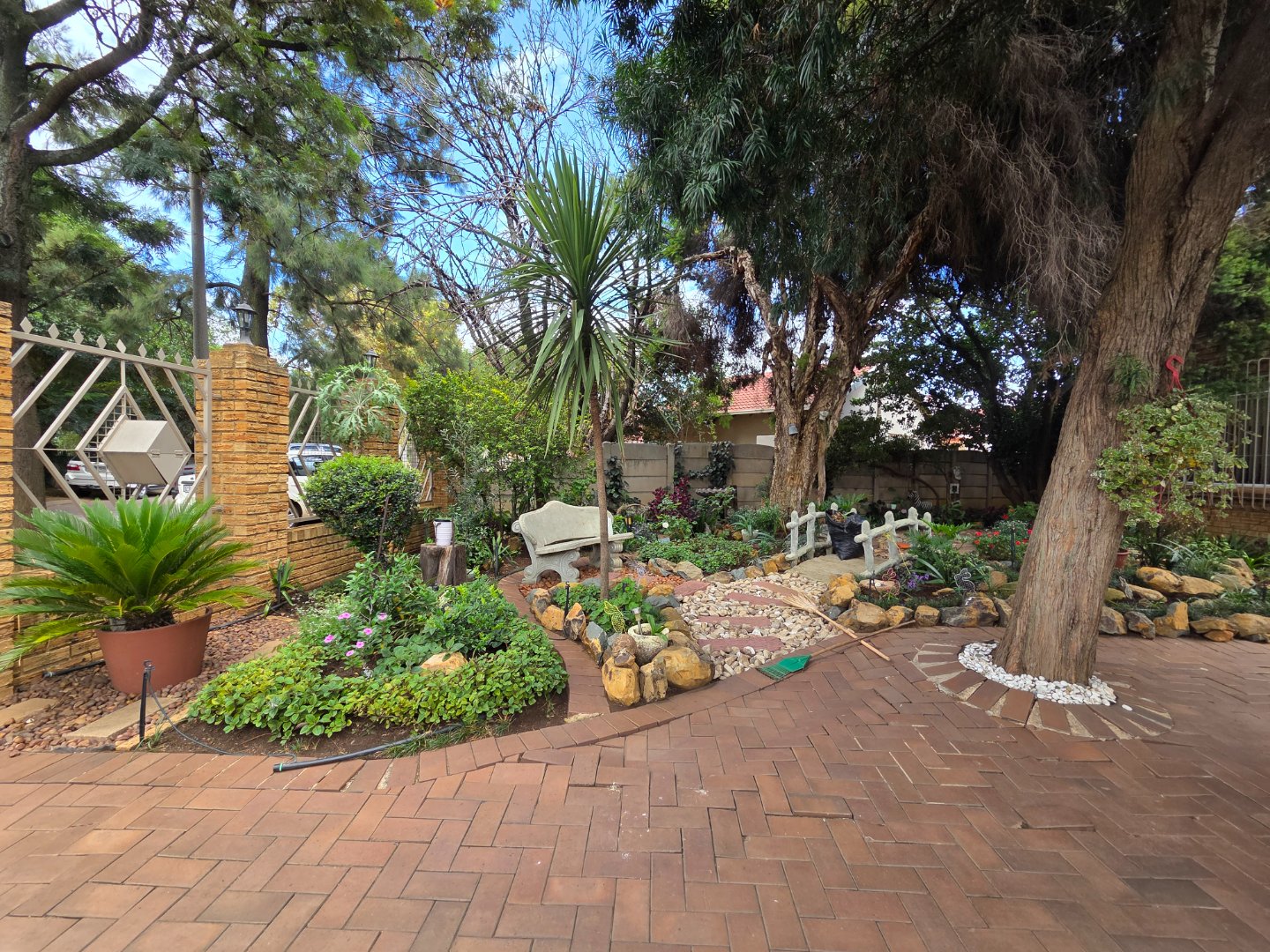 A beautifully maintained front garden, complete with a mature tree, charming bench, and paved pathway, welcomes you home and creates an immediate sense of warmth and tranquility.