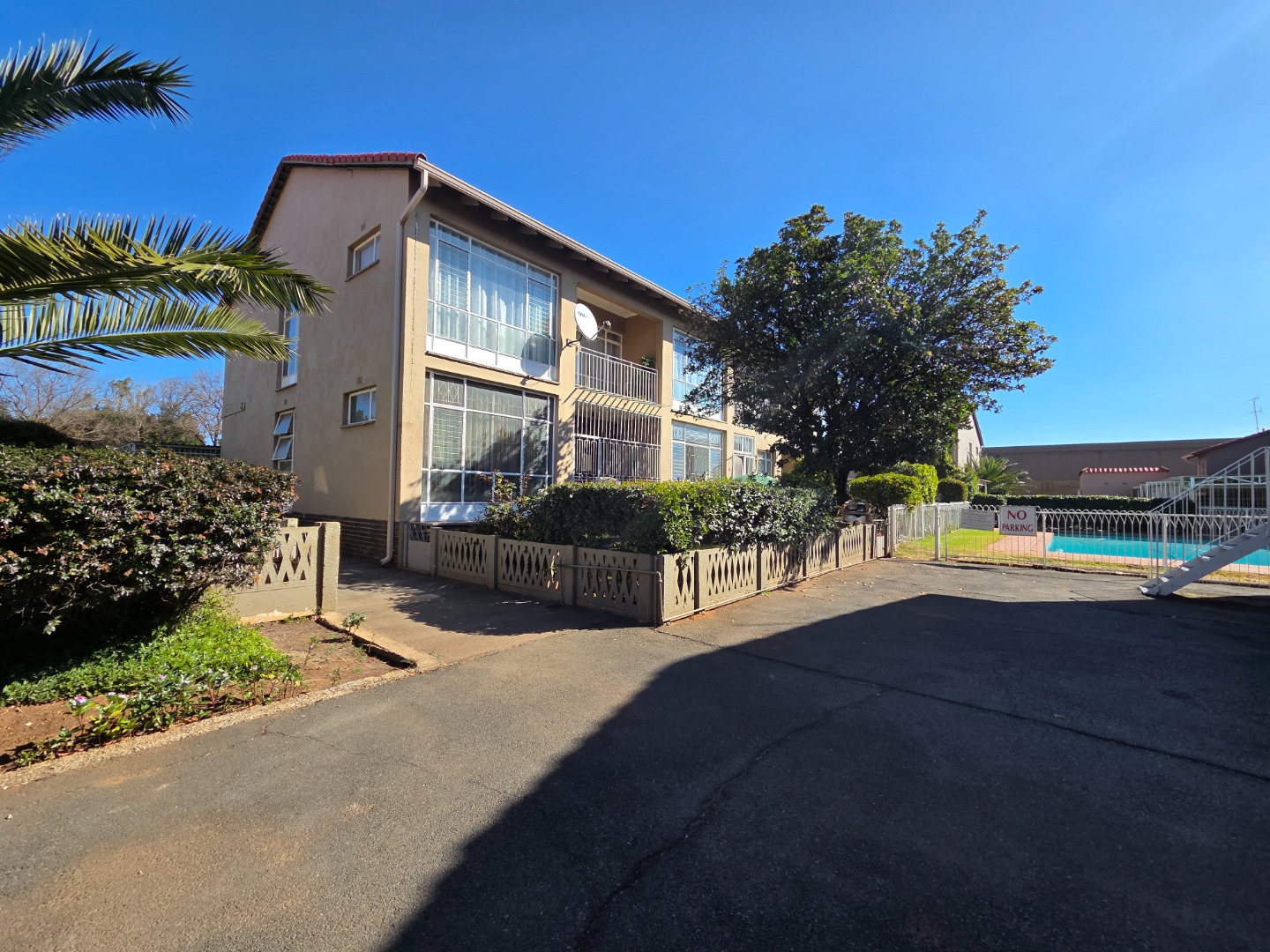 Communal swimming pool and garden for leisure and relaxation on warm days