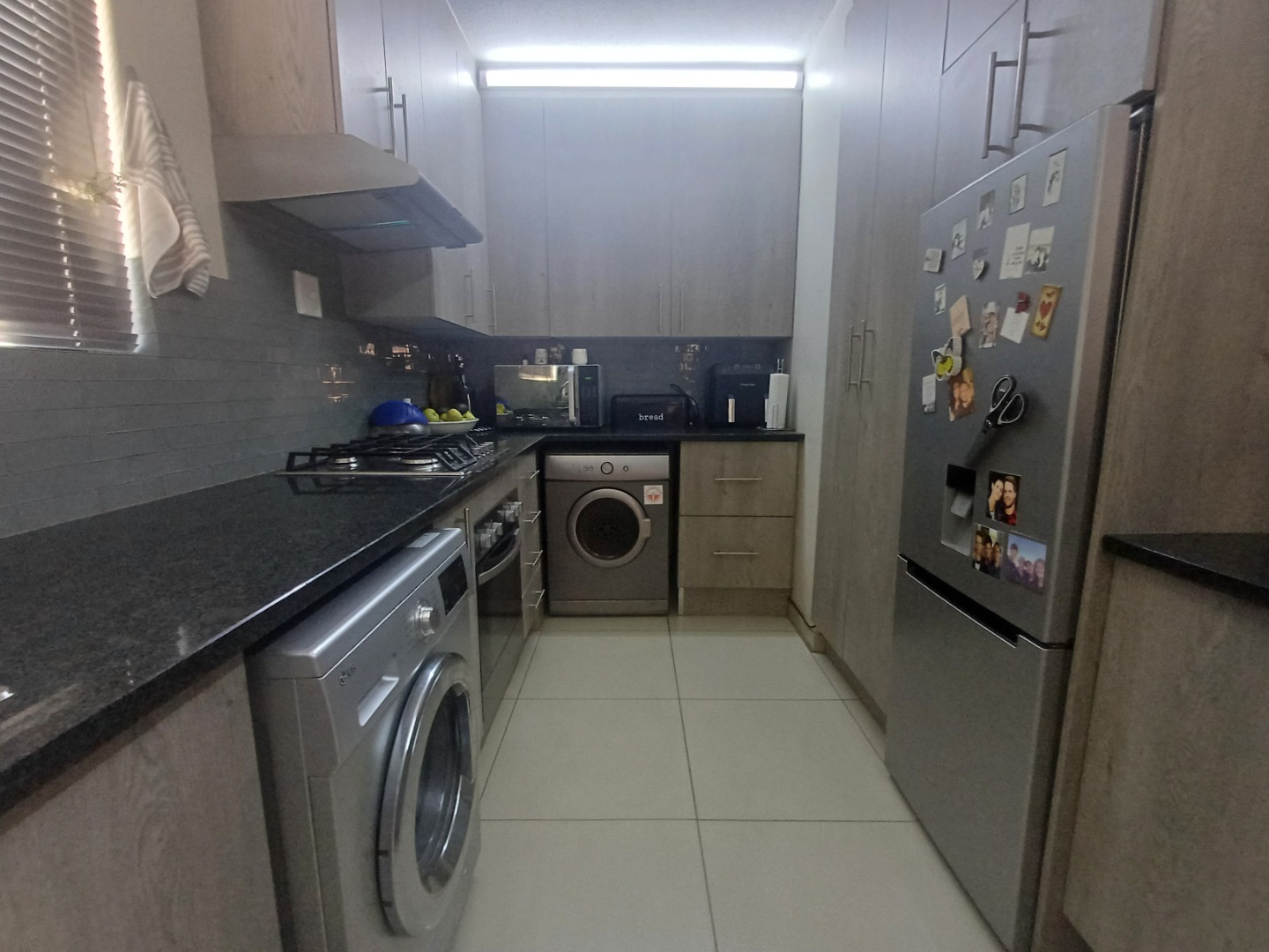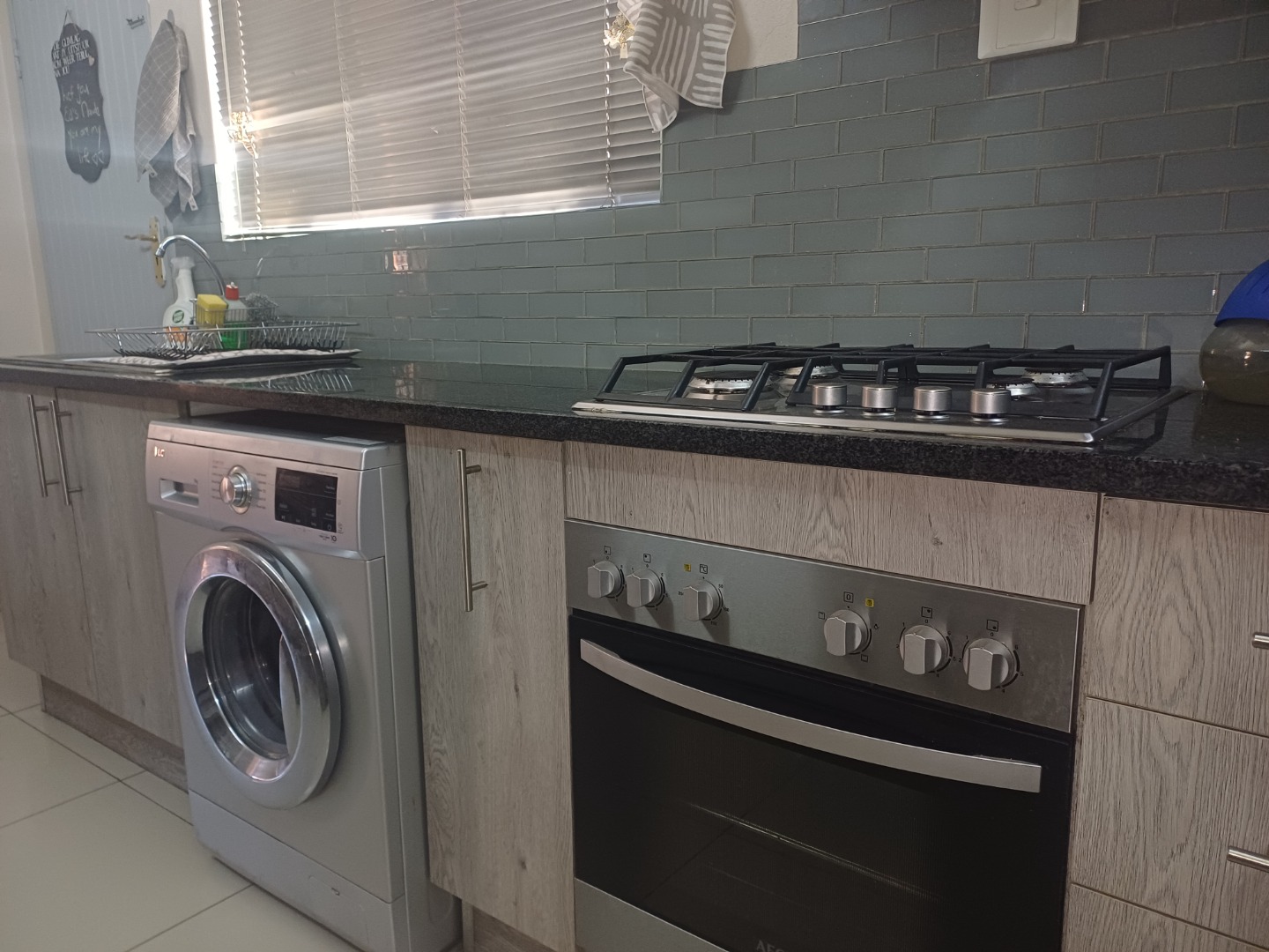 The heart of the home is its modern, compact galley kitchen, meticulously designed with wood-look cabinetry, sleek dark granite countertops, and a stylish grey subway tile backsplash. This culinary space is fully equipped with integrated appliances, including a gas hob, oven, extractor hood, washing machine, tumble dryer, and a large stainless steel refrigerator, offering both functionality and ample storage. The living and dining areas provide comfortable spaces for relaxation and entertaining.