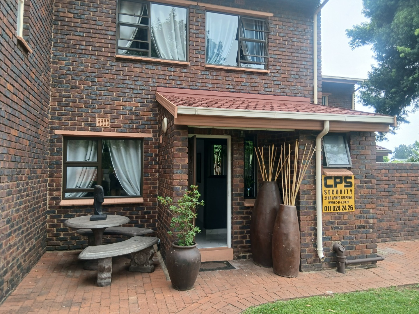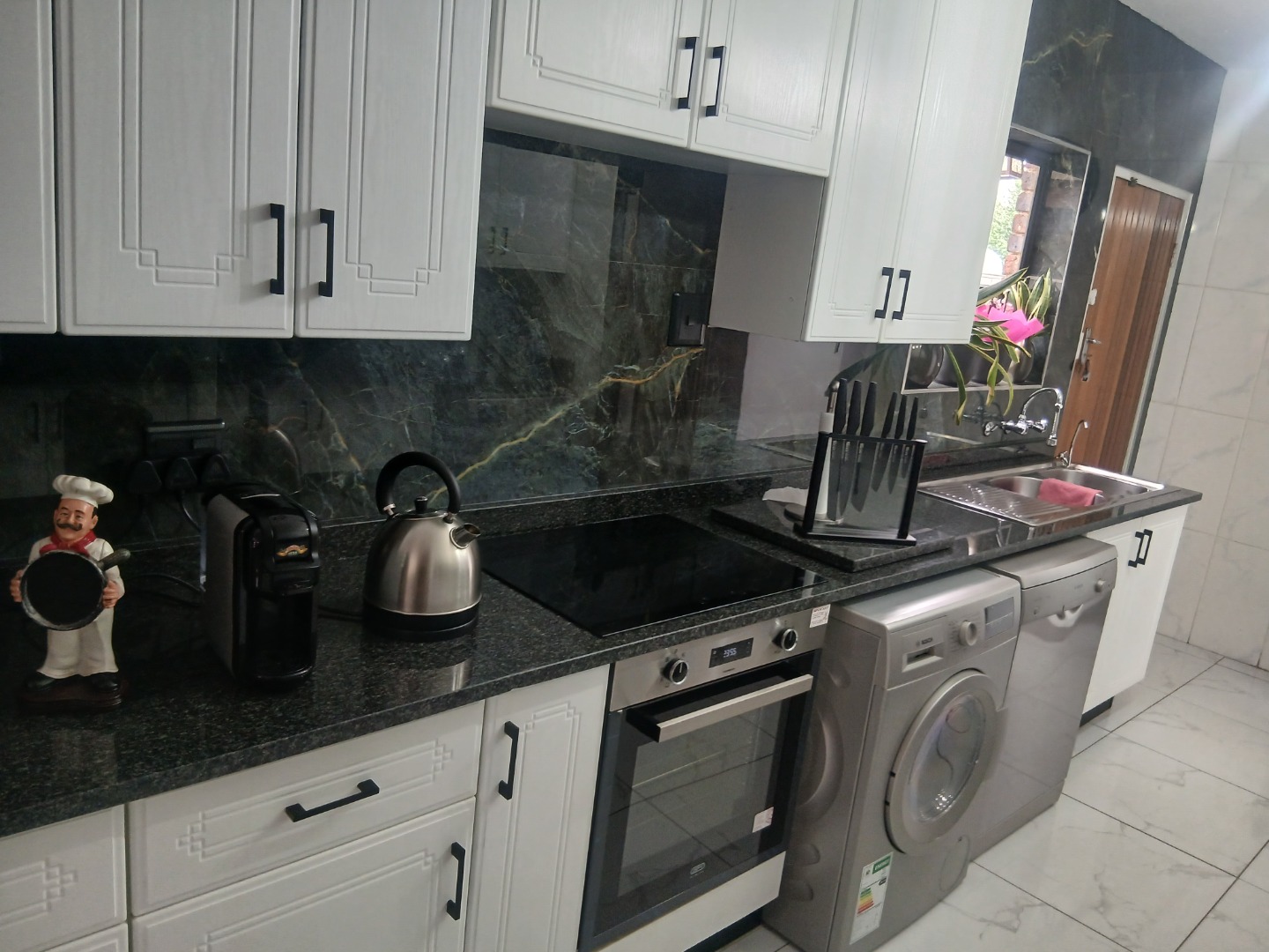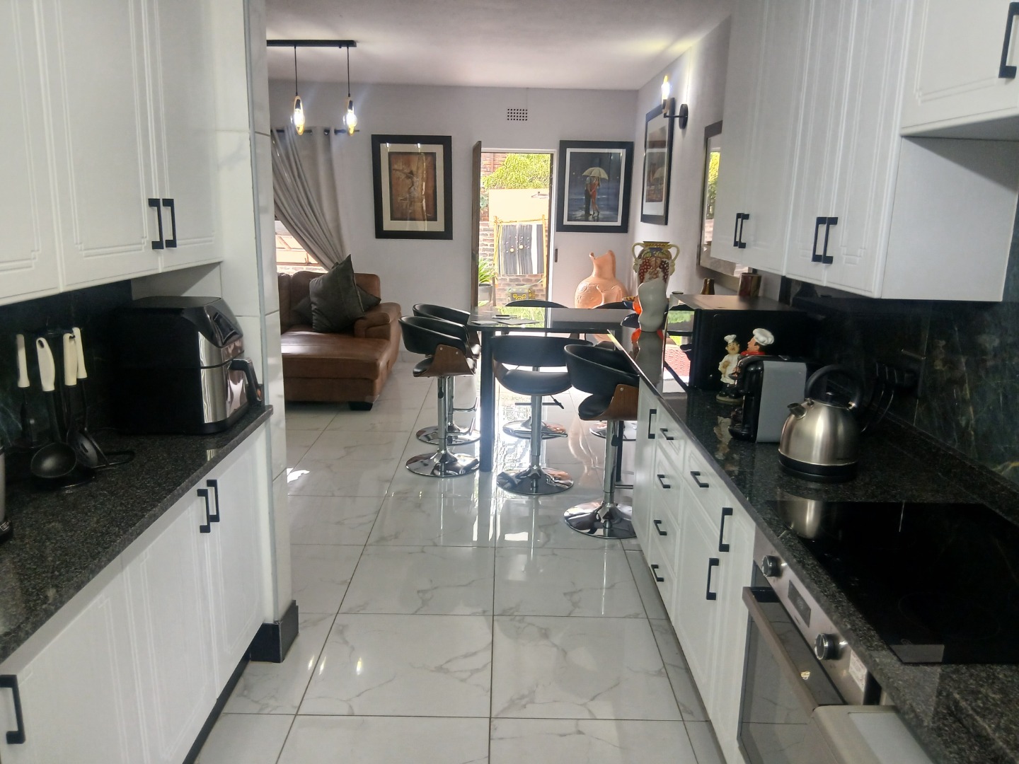 Downstairs has a welcoming guest toilet, spacious tiled dining room with modern lighting, open-plan kitchen featuring granite countertops, a breakfast nook, ample cupboard space, and room for all your appliances — perfect for the gourmet chef, the lounge leads seamlessly to a neat private garden, ideal for relaxation or entertaining.