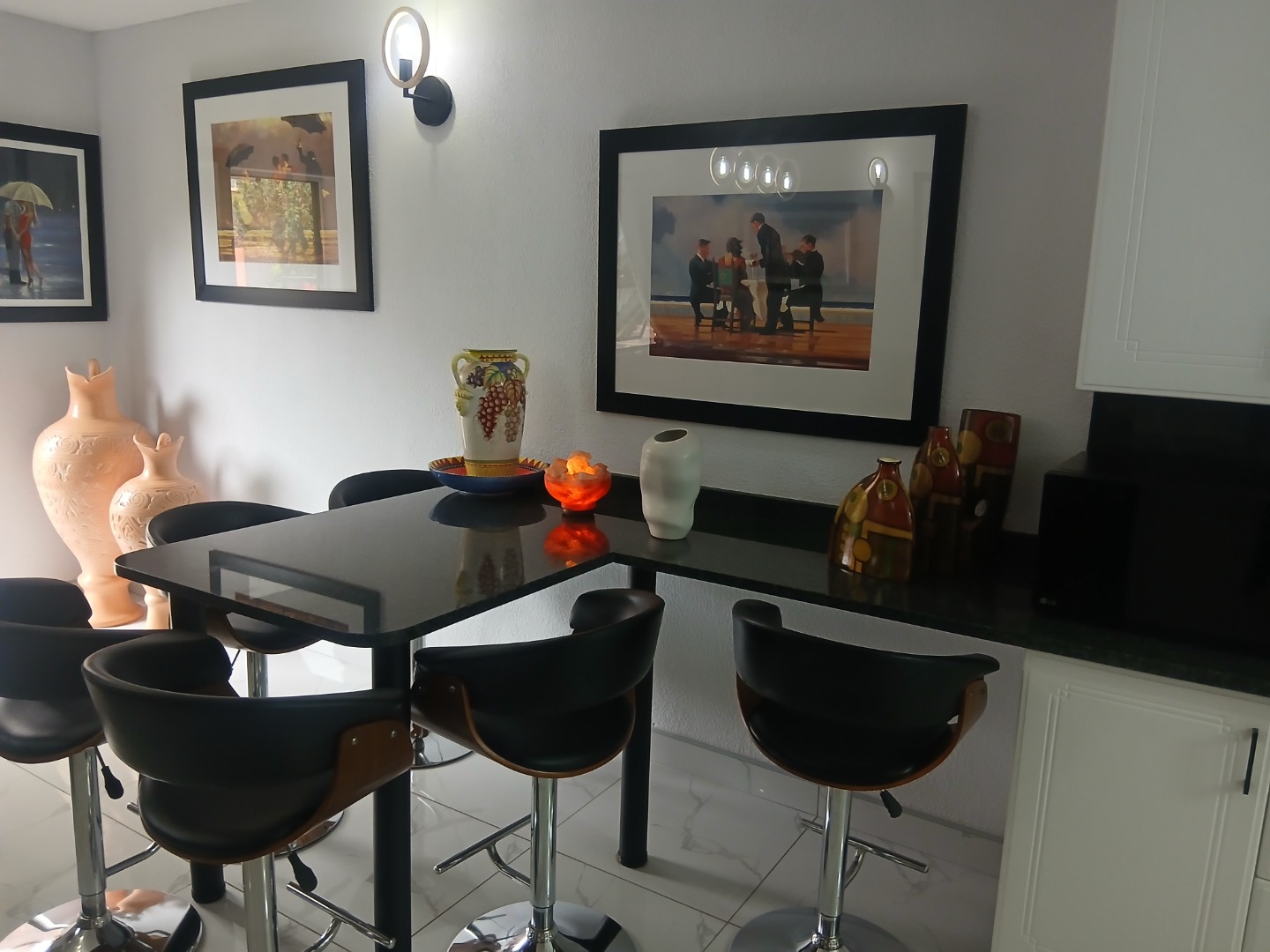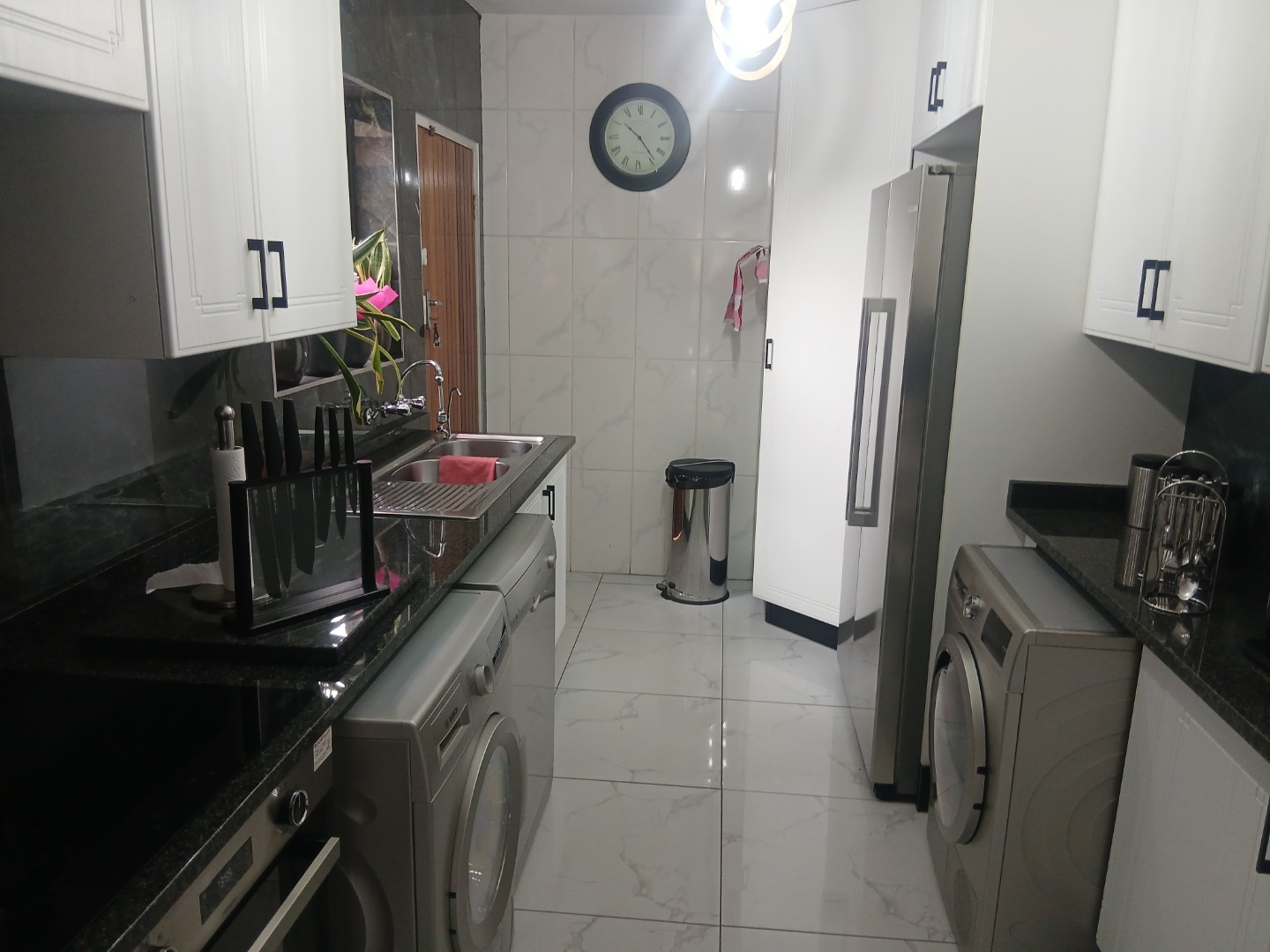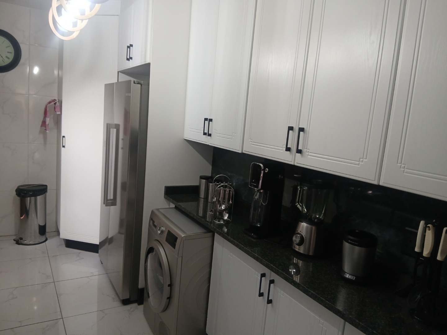 Downstairs has a welcoming guest toilet, spacious tiled dining room with modern lighting, open-plan kitchen featuring granite countertops, a breakfast nook, ample cupboard space, and room for all your appliances — perfect for the gourmet chef, the lounge leads seamlessly to a neat private garden, ideal for relaxation or entertaining.
