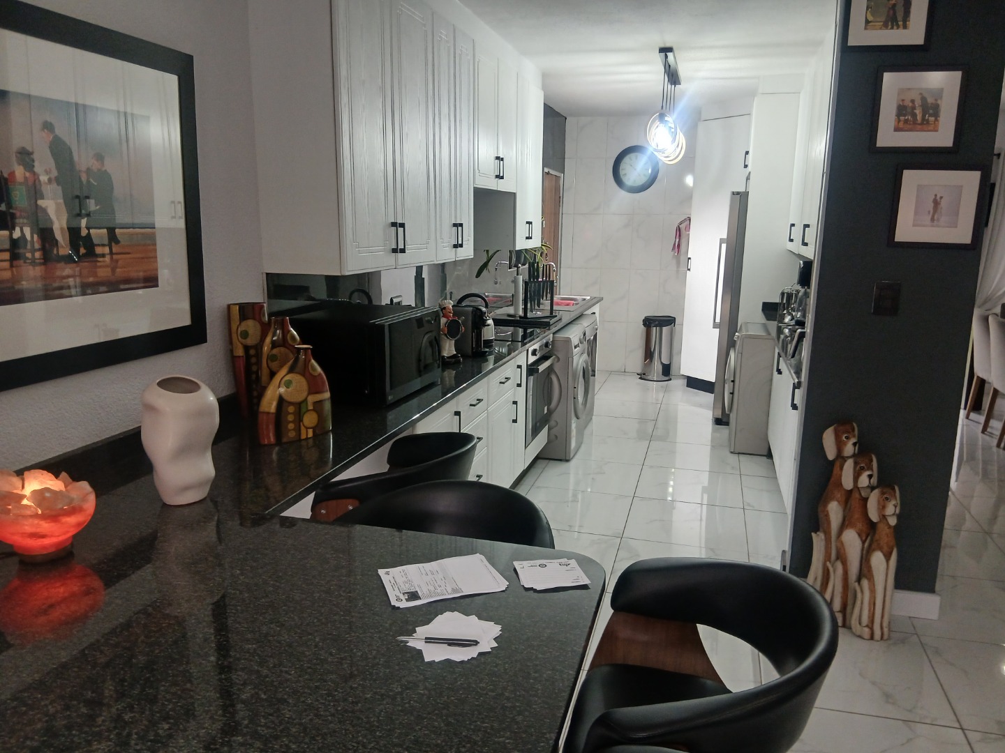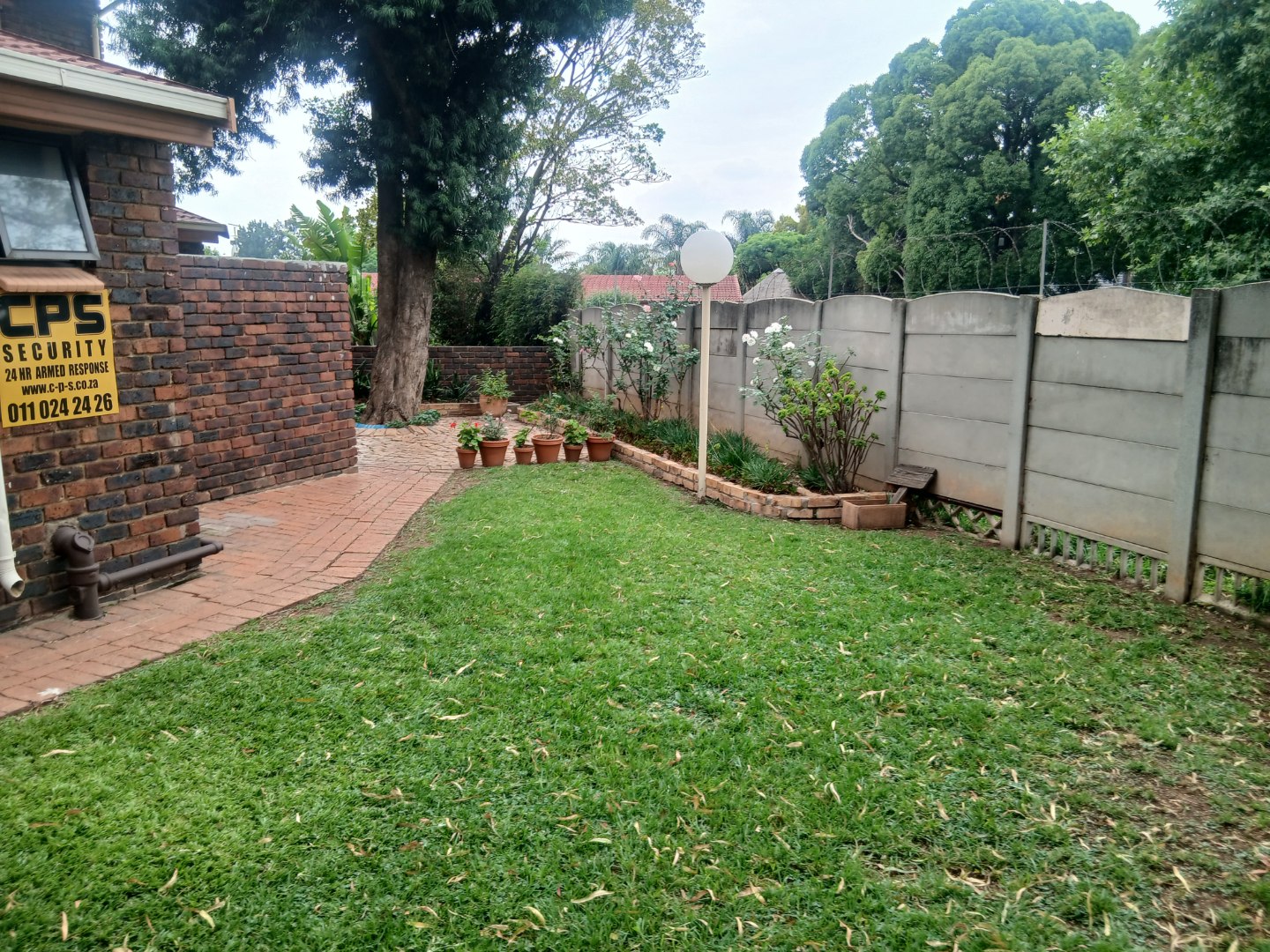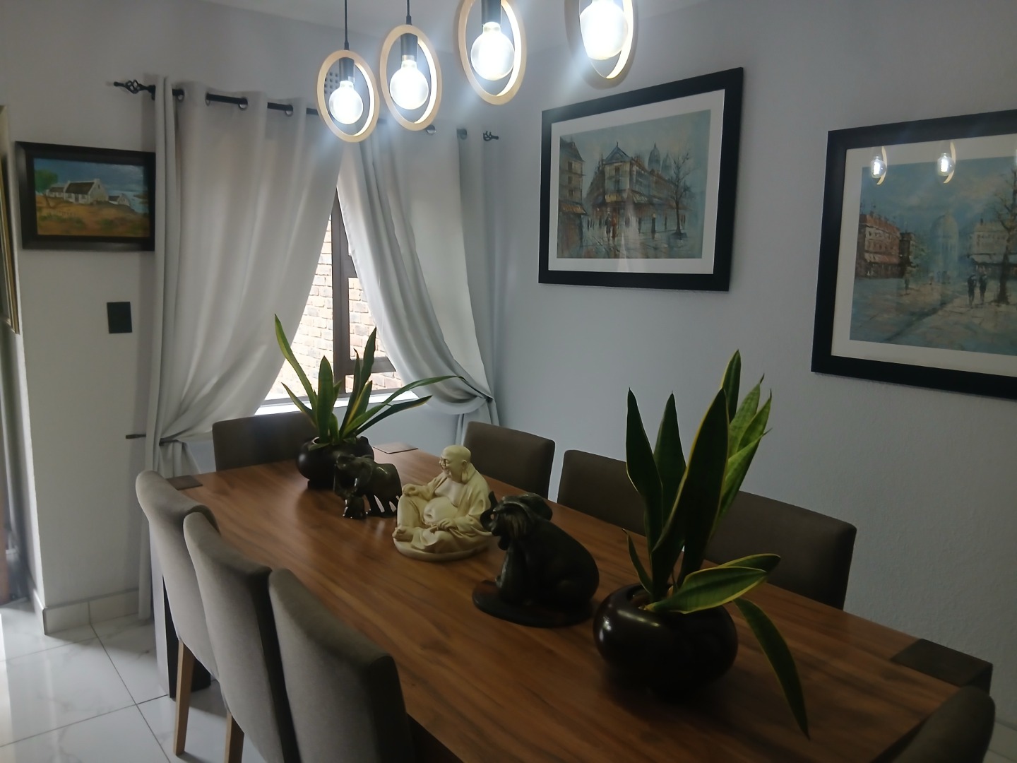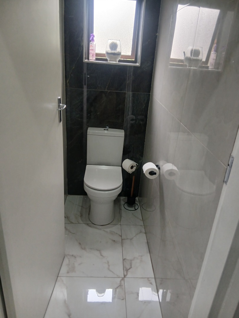 Downstairs has a welcoming guest toilet, spacious tiled dining room with modern lighting, open-plan kitchen featuring granite countertops, a breakfast nook, ample cupboard space, and room for all your appliances — perfect for the gourmet chef, the lounge leads seamlessly to a neat private garden, ideal for relaxation or entertaining.
