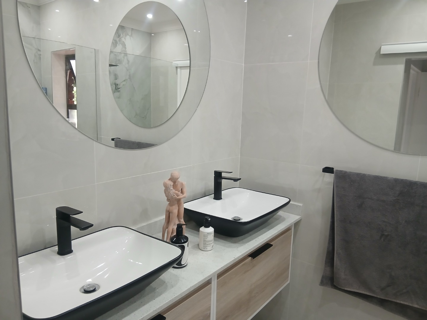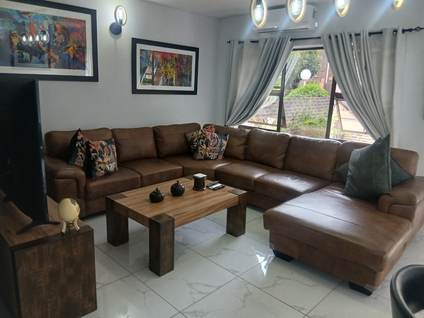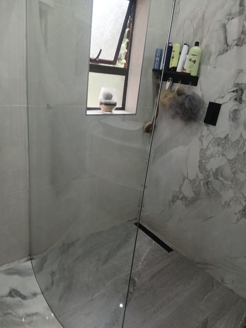 A stylish staircase with aluminium handrails adds a modern touch and leads to the main bedroom with built-in cupboards and a luxurious en-suite bathroom complete with a modern soaking tub, two additional bedrooms with laminated floors and built-in cupboards, separate toilet and a second bathroom with a walk-in shower and basin.