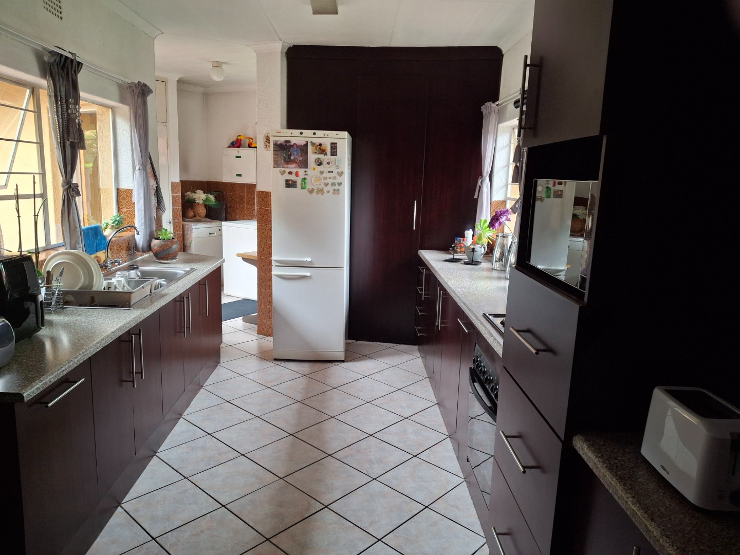 Step inside to discover three generously proportioned bedrooms, each bathed in natural light and offering ample bespoke cabinetry. The two luxurious bathrooms include a master en-suite, a truly expansive and contemporary haven adorned with modern tiling, inviting moments of serene indulgence. The heart of this home is undoubtedly the magnificent farm-style kitchen, a culinary masterpiece offering an abundance of space and amenities, perfect for convivial gatherings and cherished family moments. Adjacent, the open-plan lounge and dining areas, resplendent with elegant tiling, flow effortlessly, creating an ideal setting for both grand entertaining and quiet evenings.