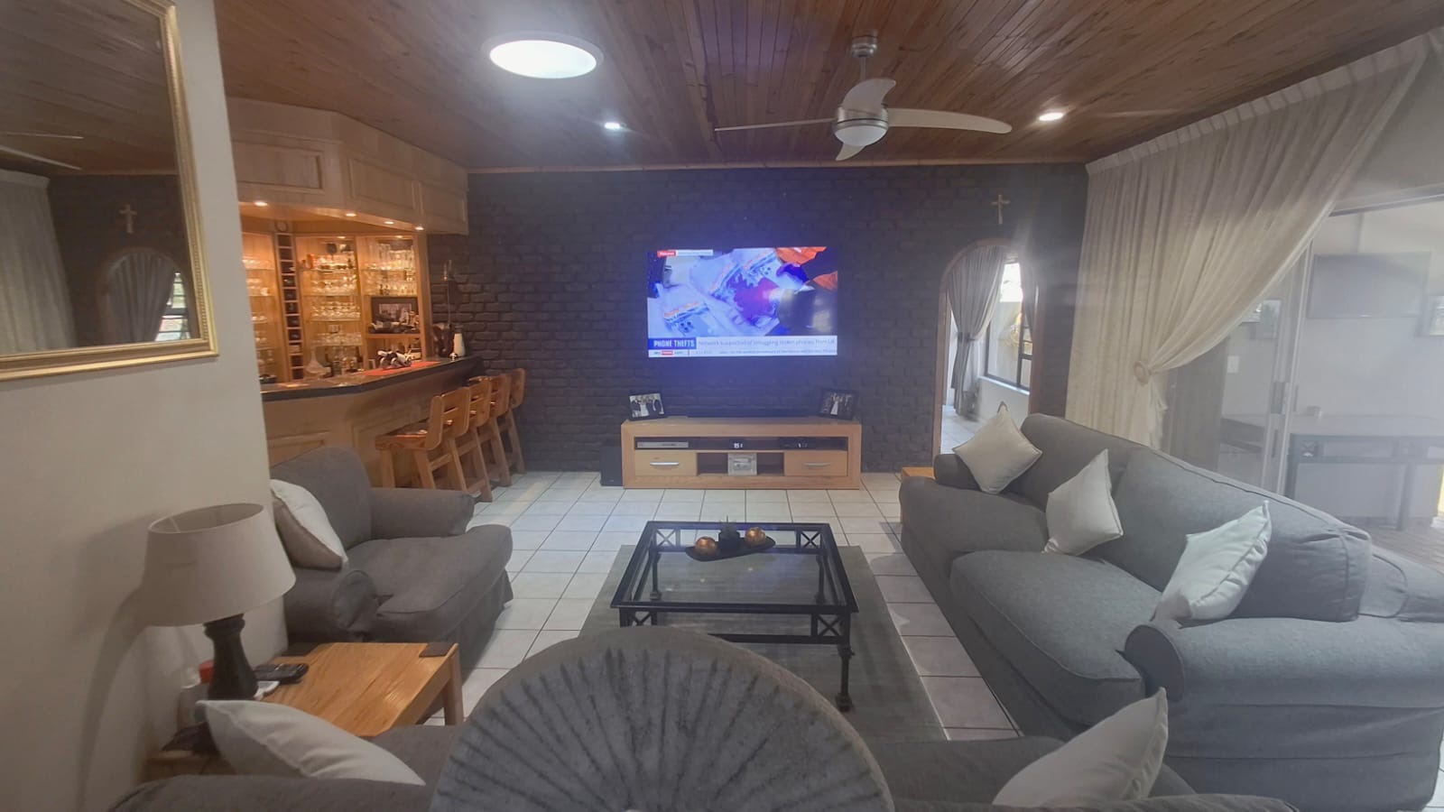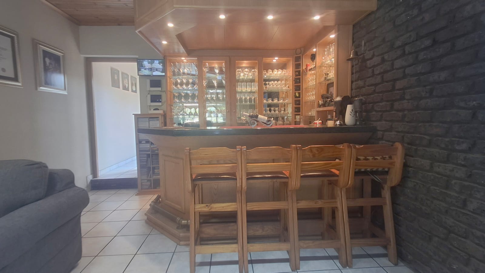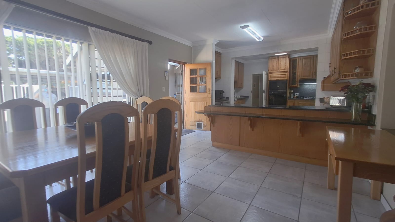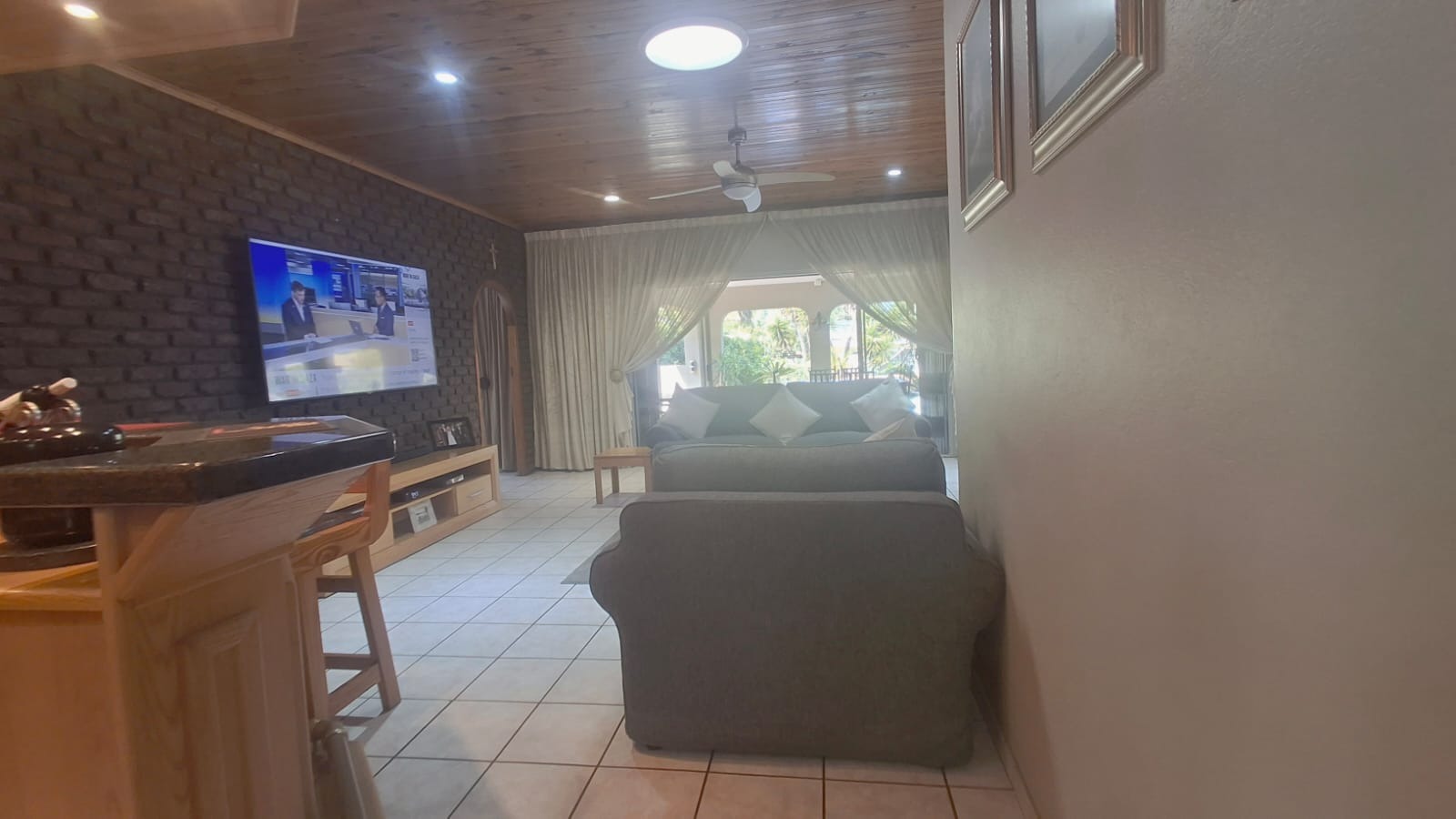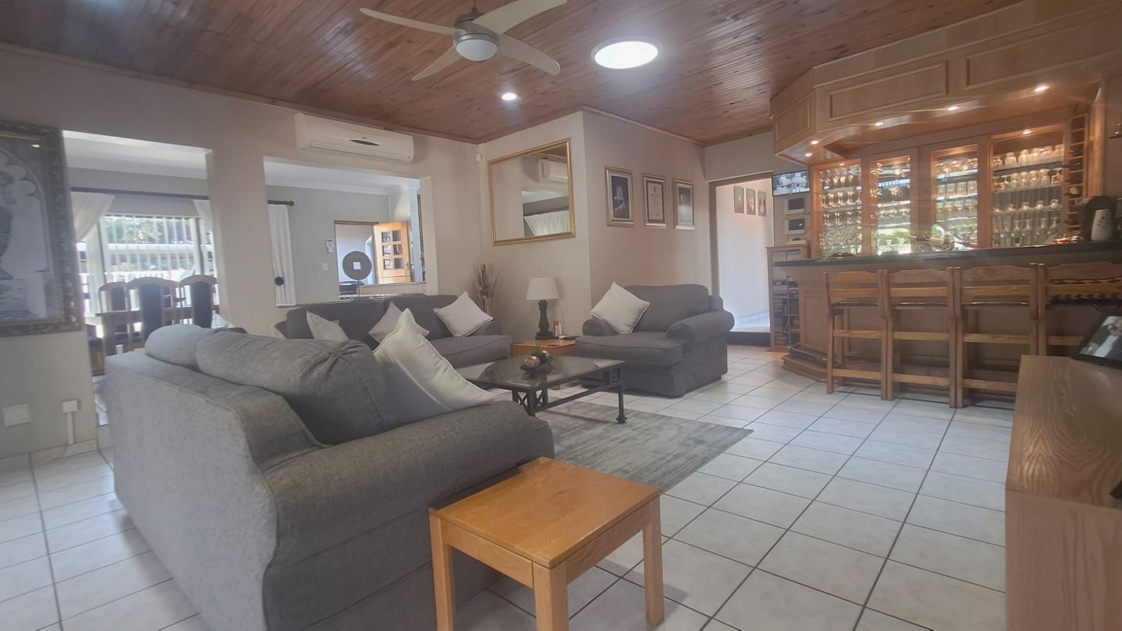 - Family Room with solid oak bar, flowing to covered patio and built-in braai