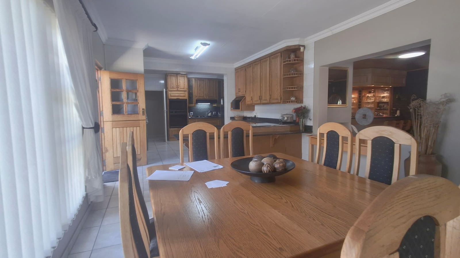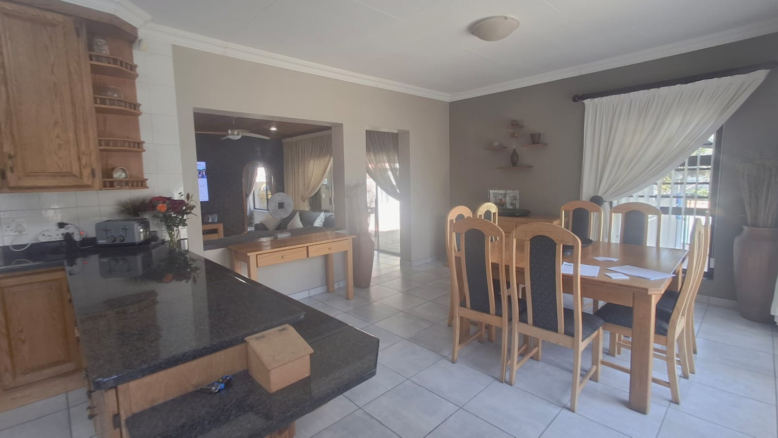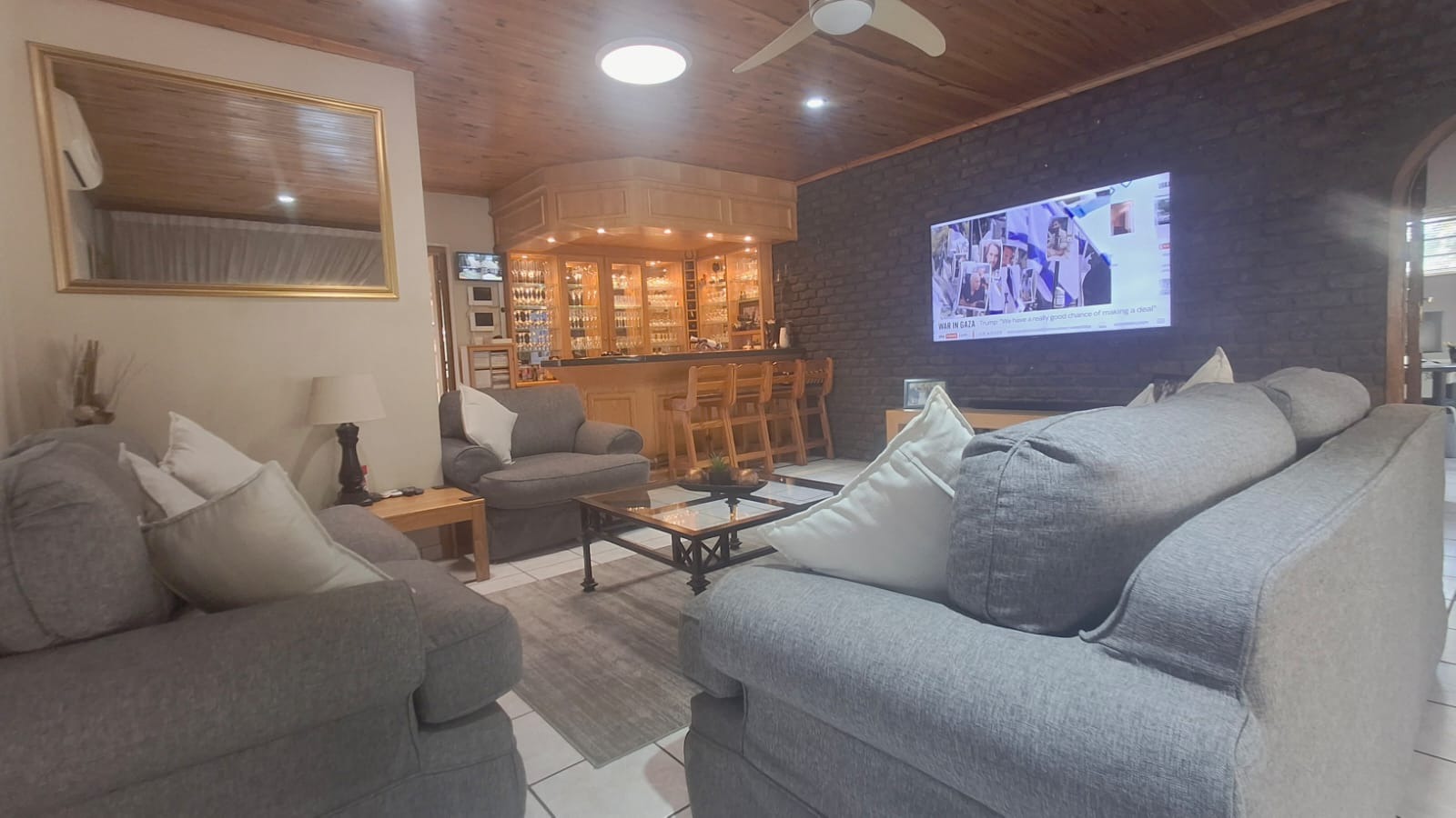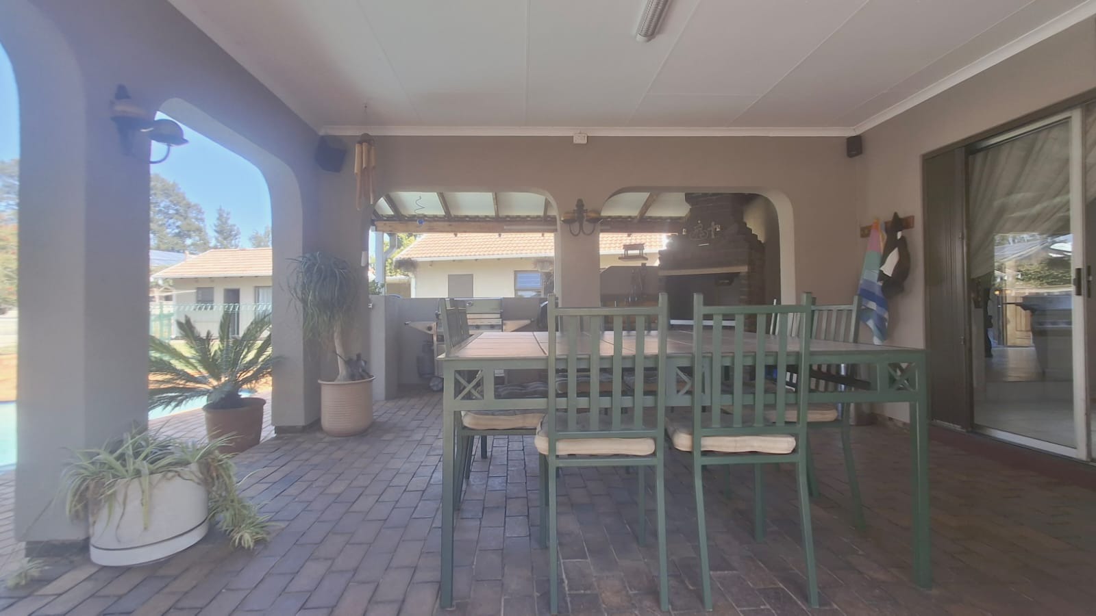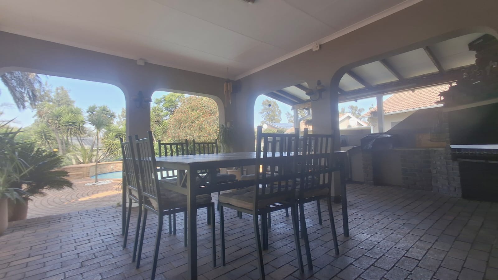 - Family Room with solid oak bar, flowing to covered patio and built-in braai