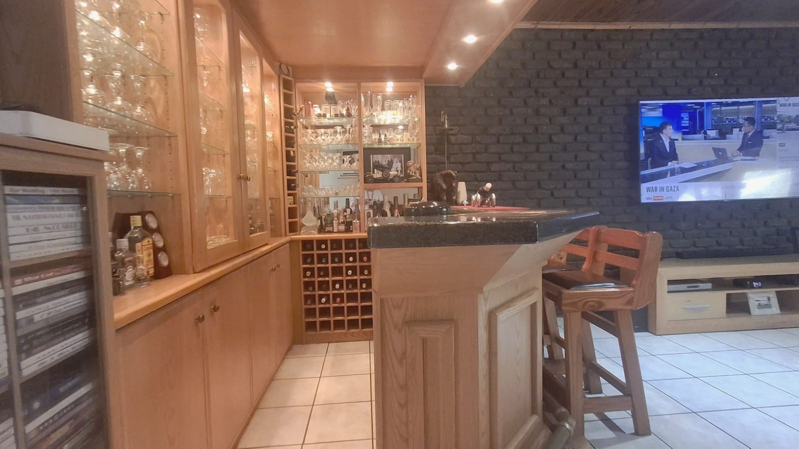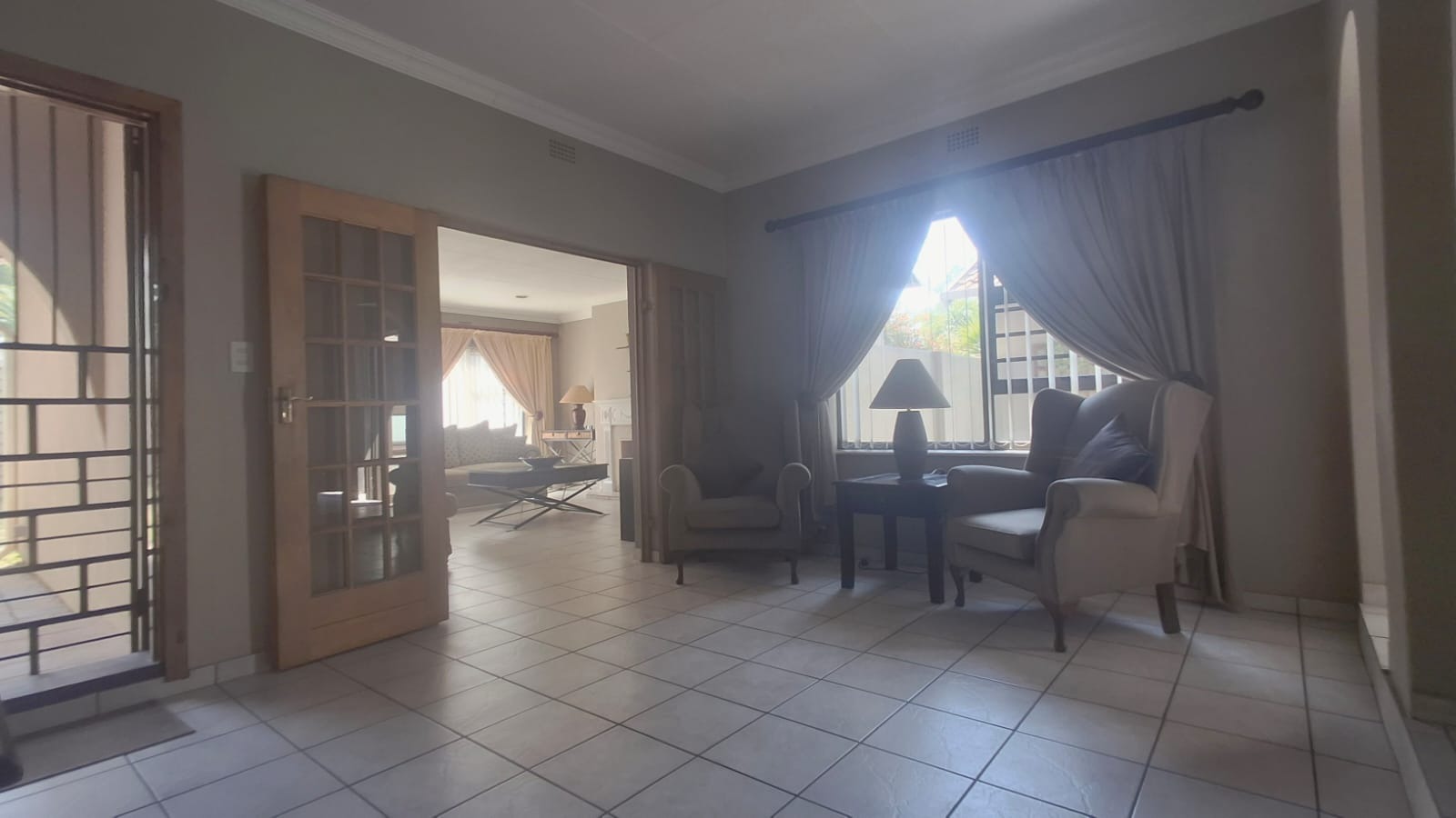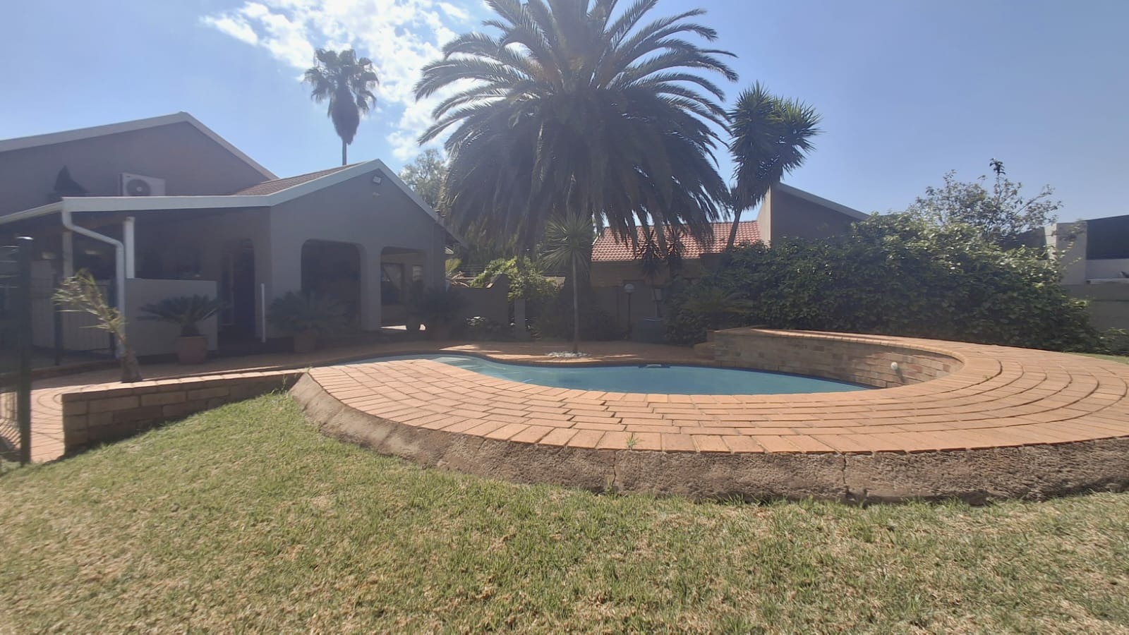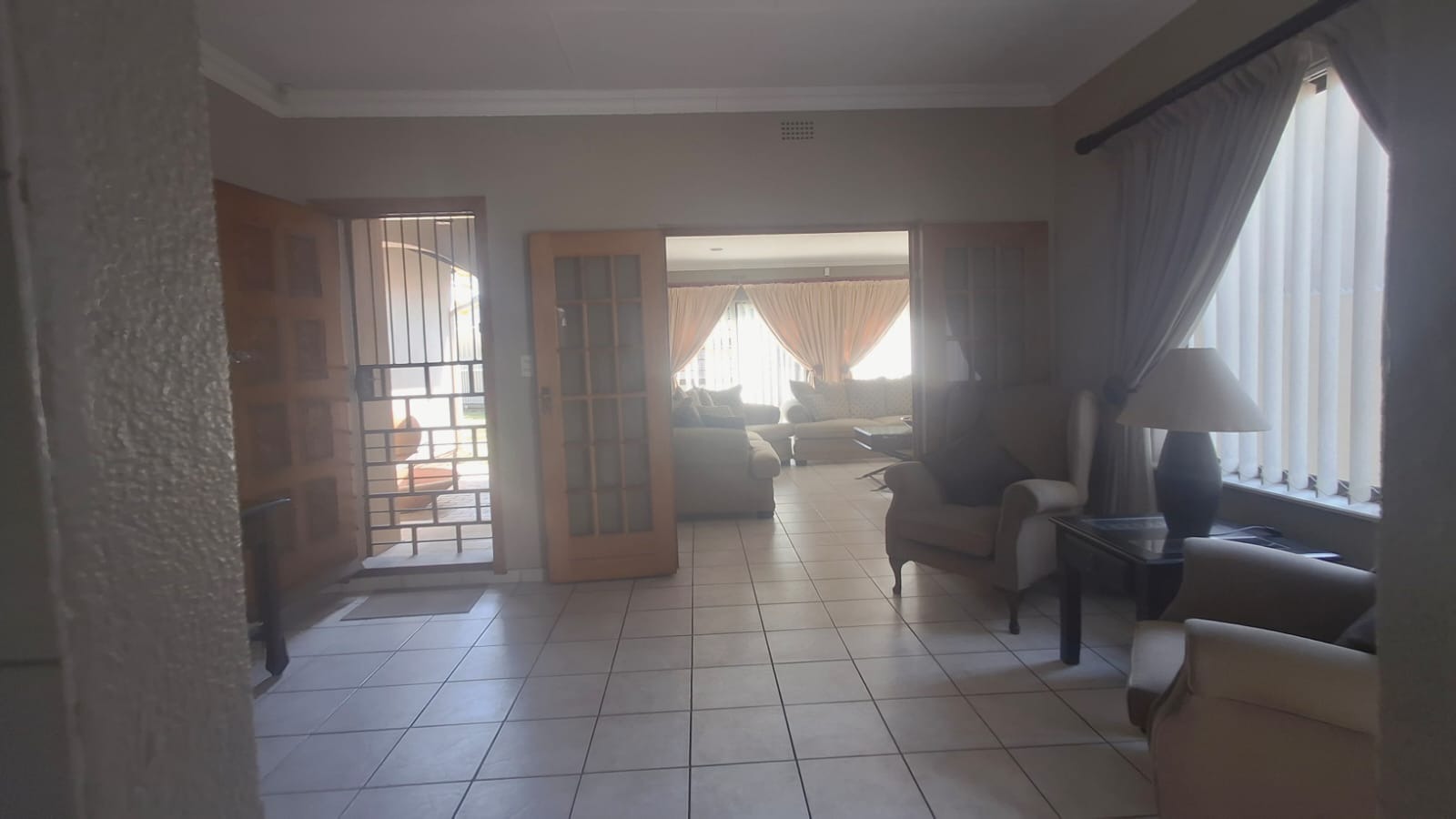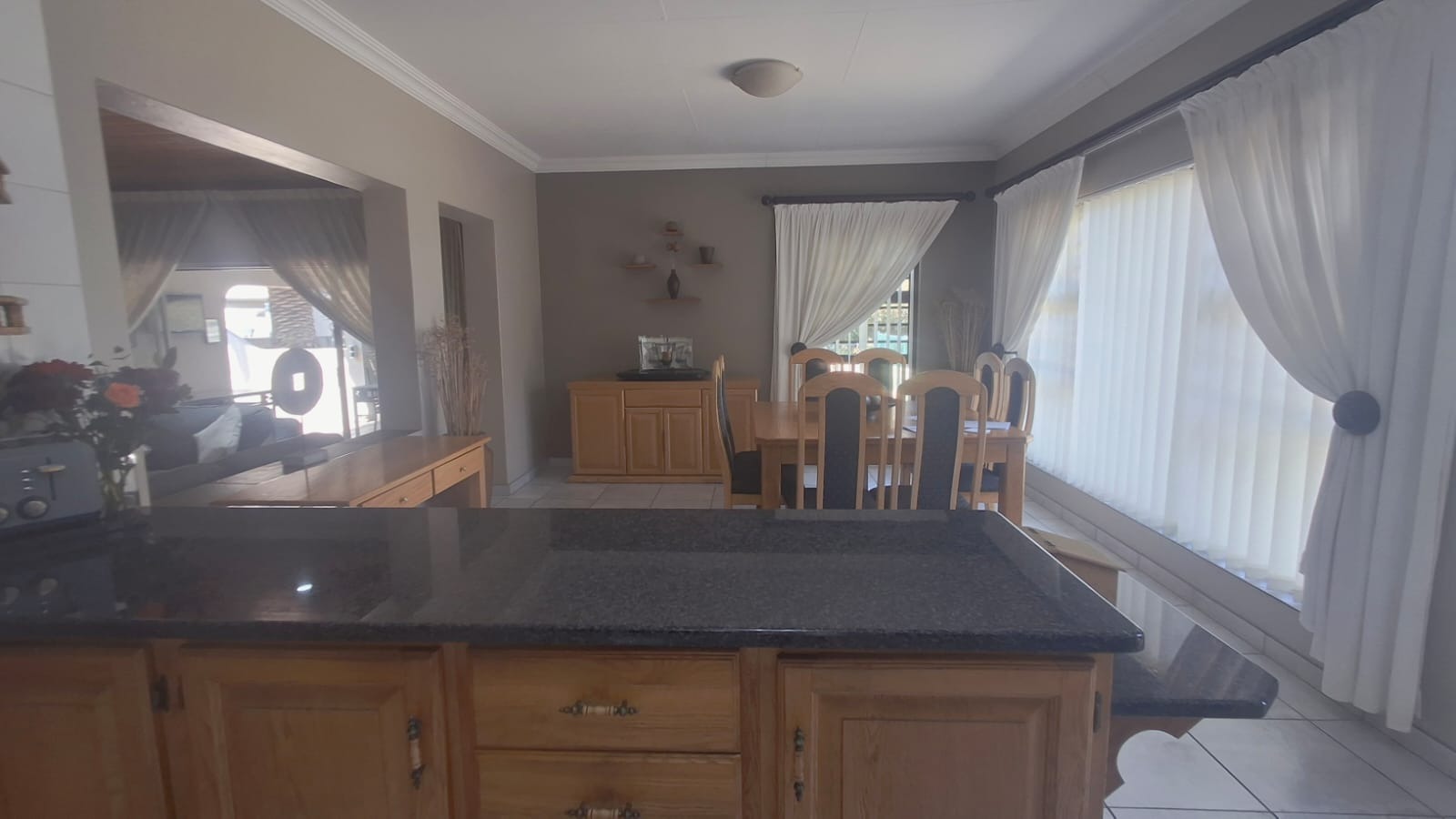 - Family Room with solid oak bar, flowing to covered patio and built-in braai