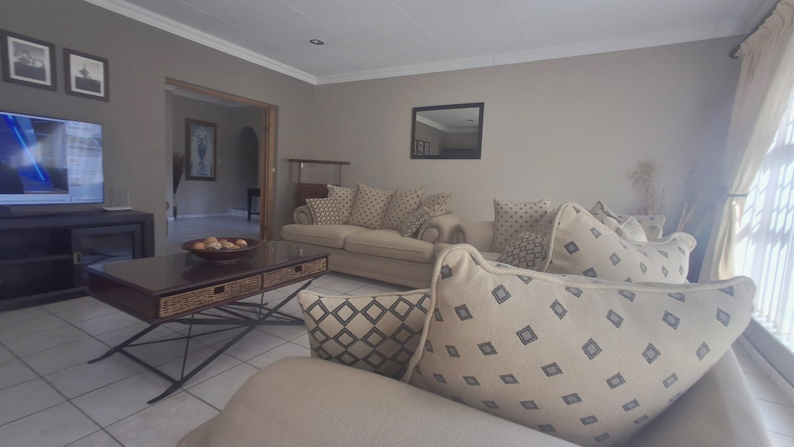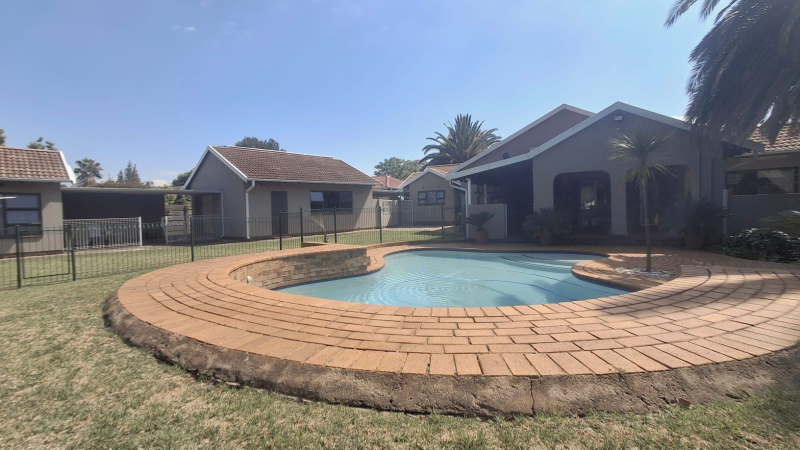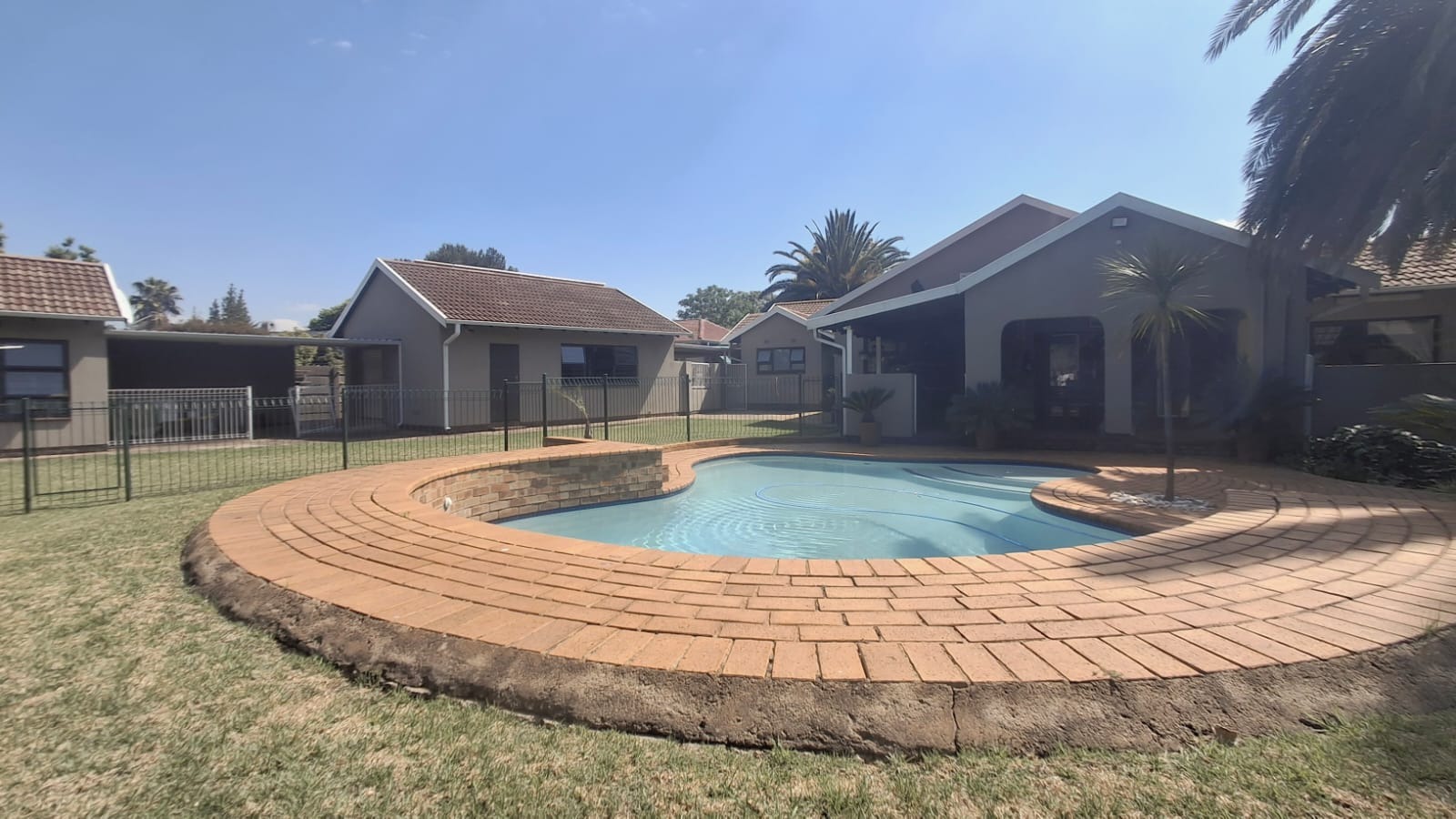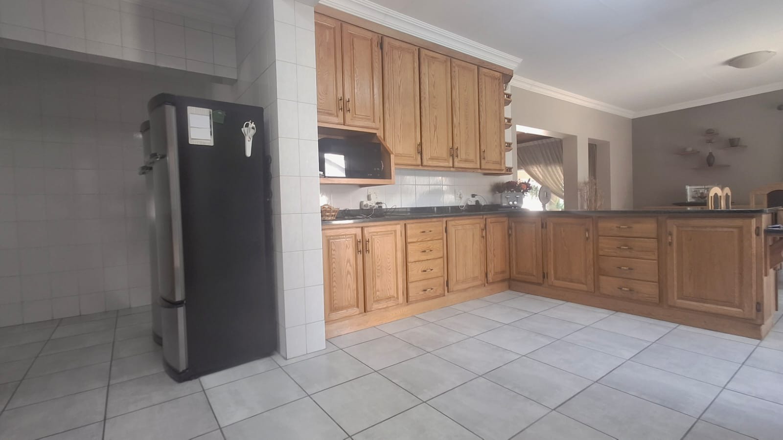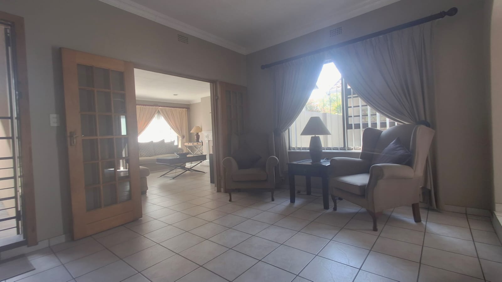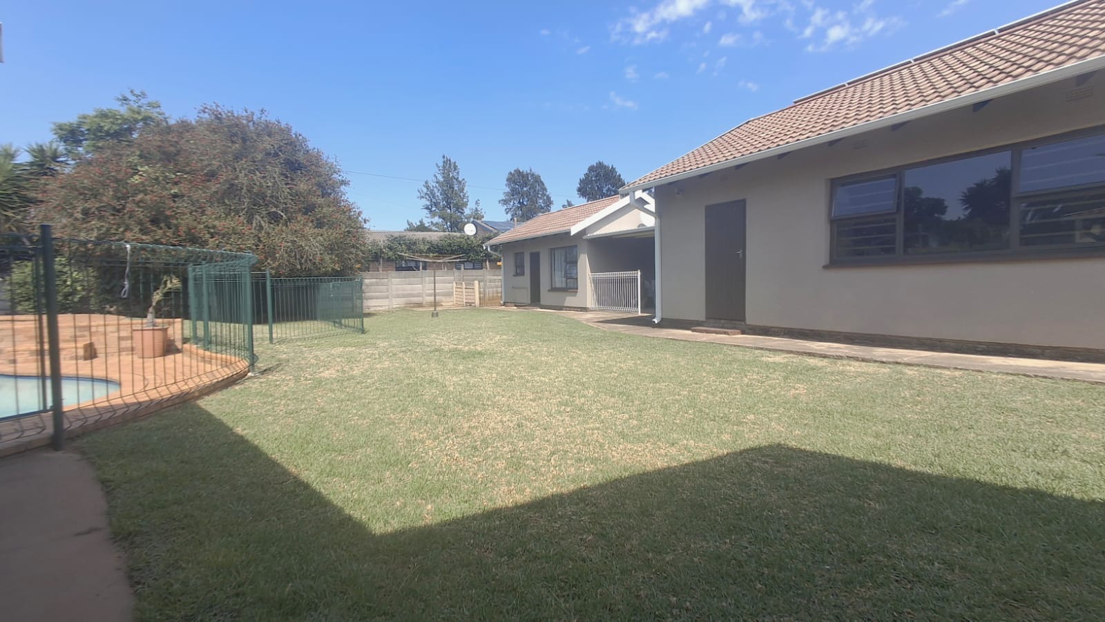 - Family Room with solid oak bar, flowing to covered patio and built-in braai