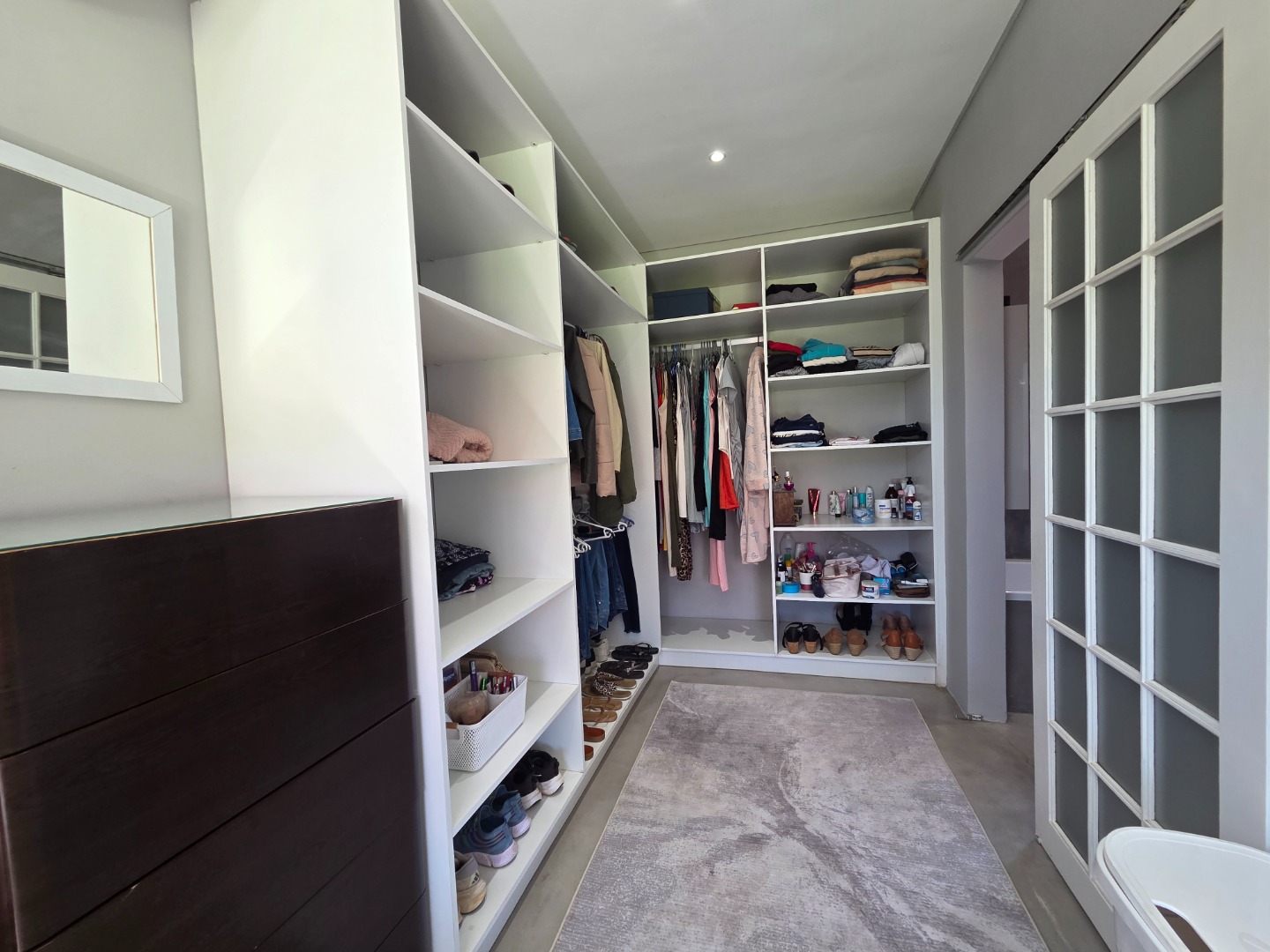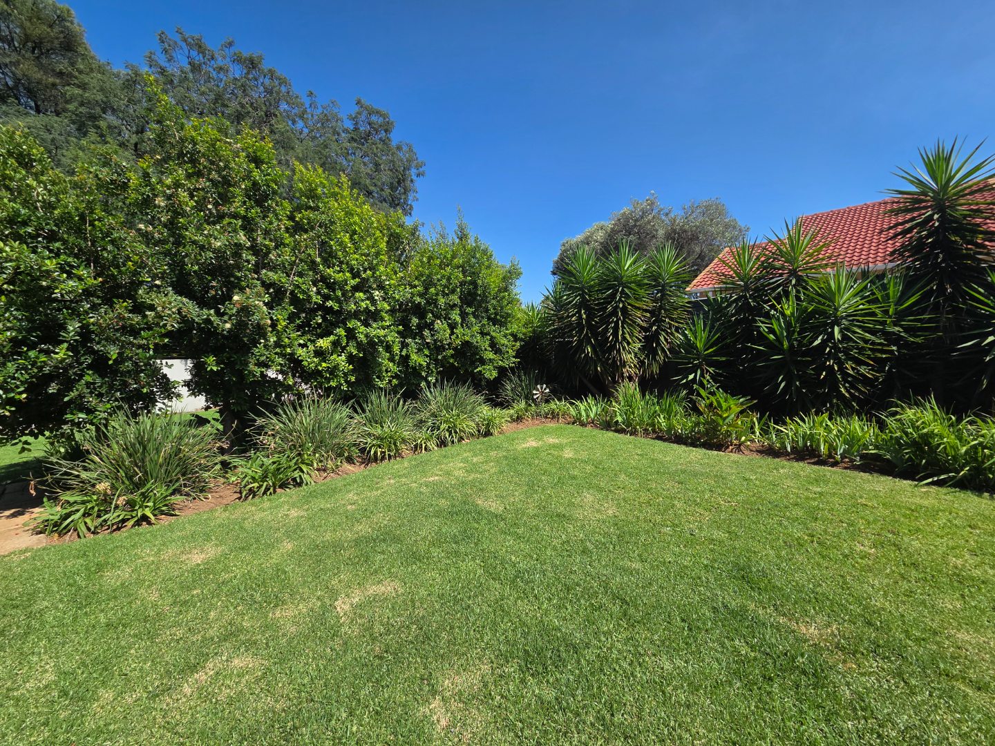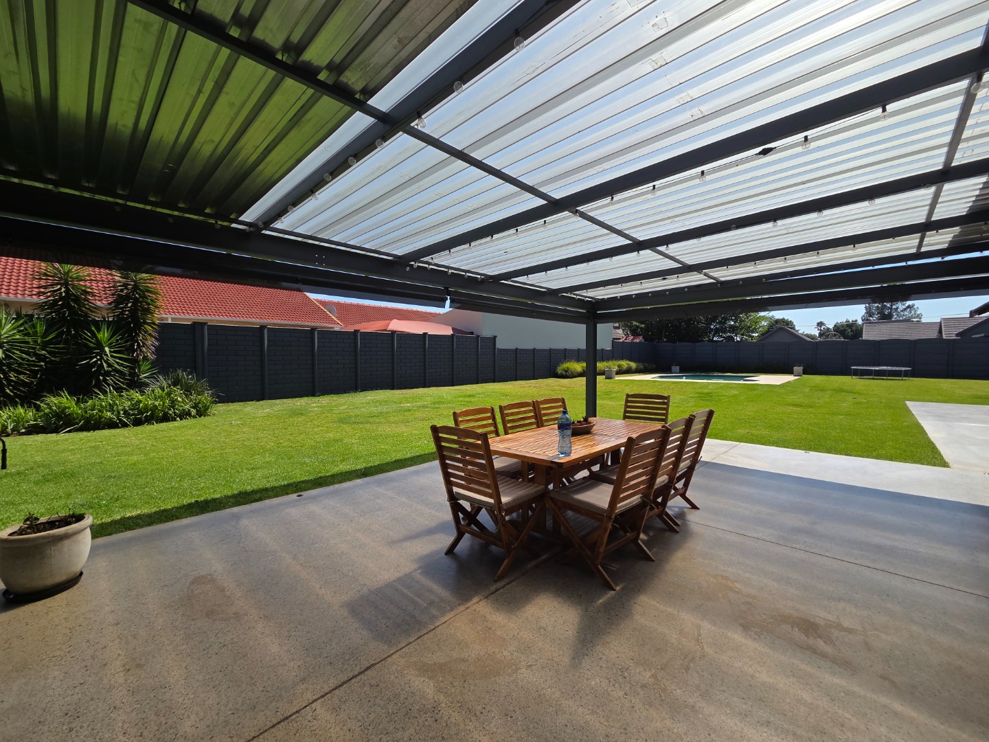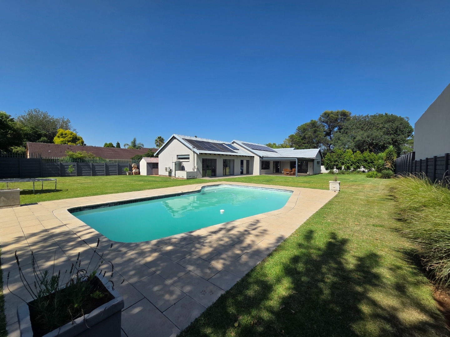Additional features include a full solar power system, a solar-heated swimming pool, a solar geyser, municipal water backup, an advanced security system, prepaid electricity, aluminium window frames, two storage sheds, and a double automated garage with direct access.