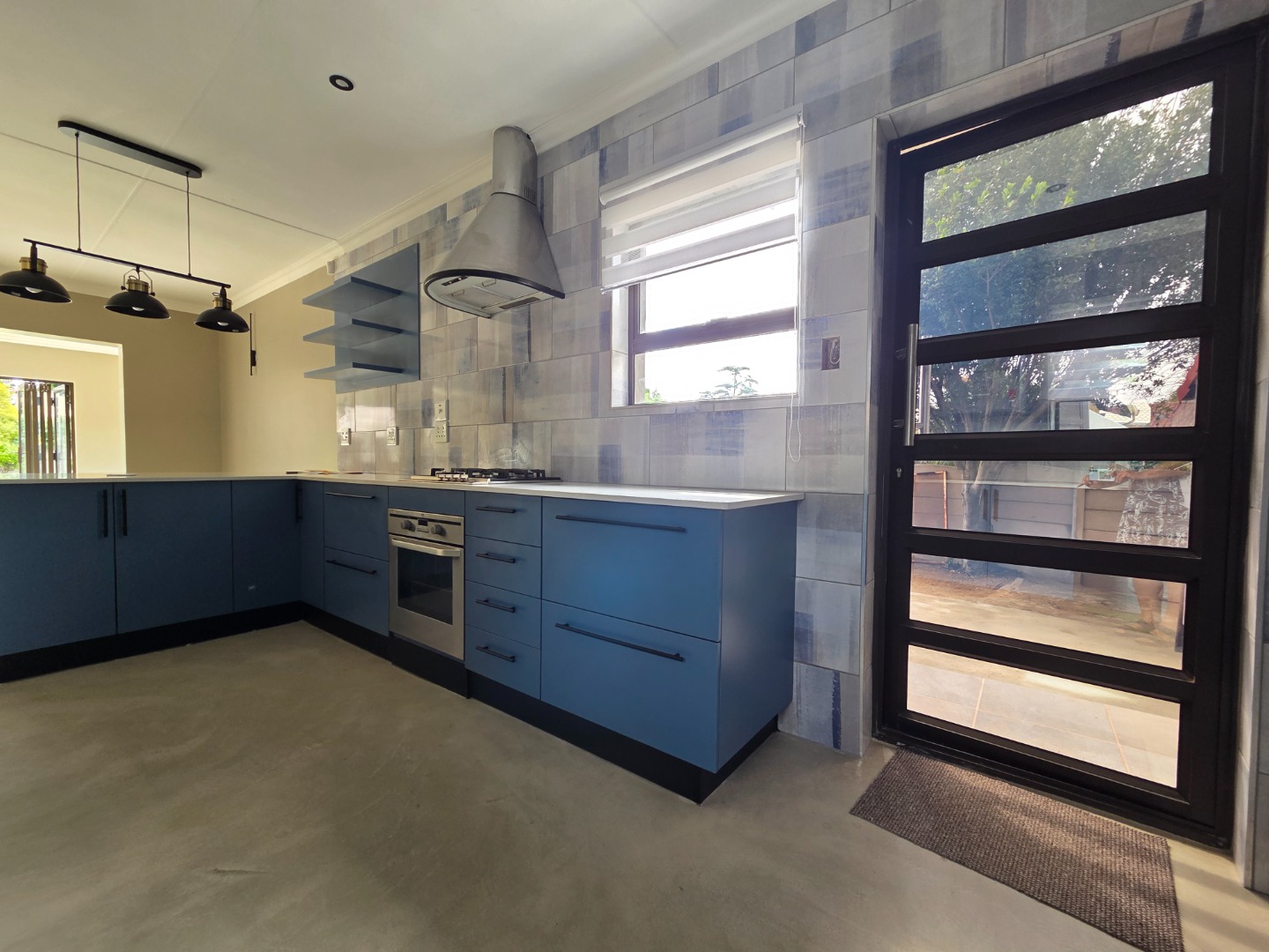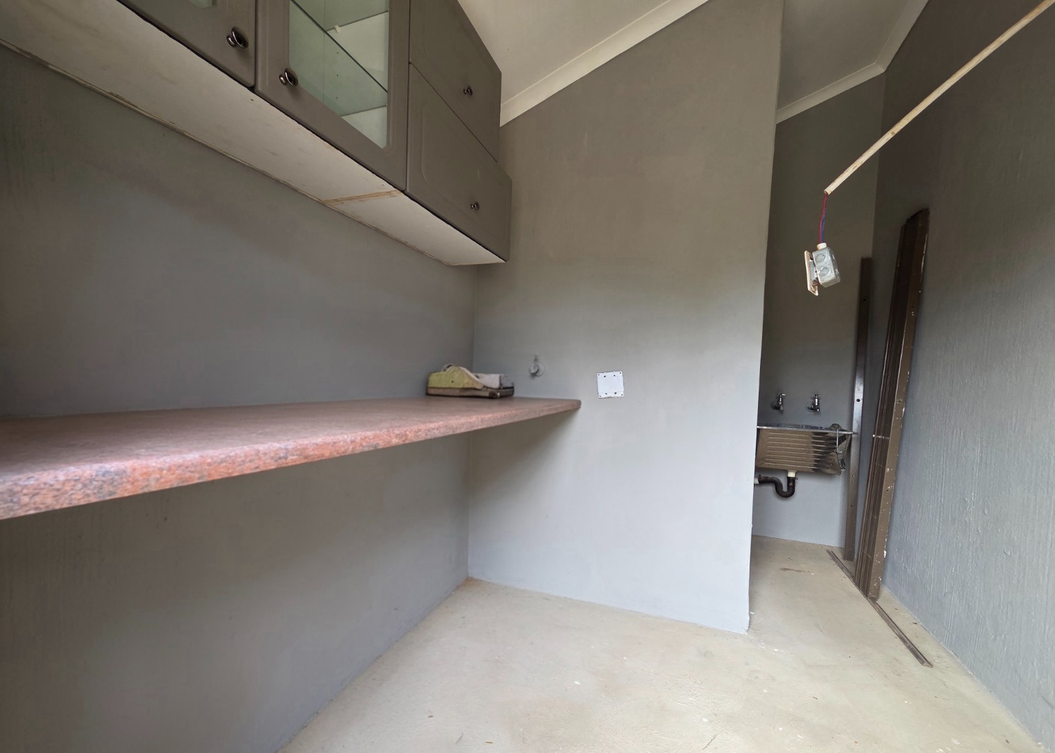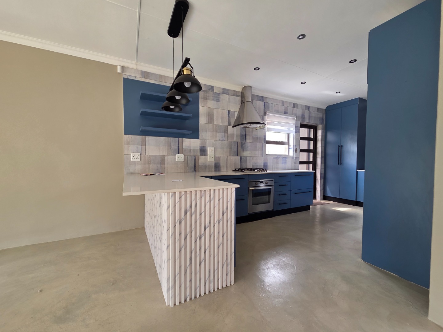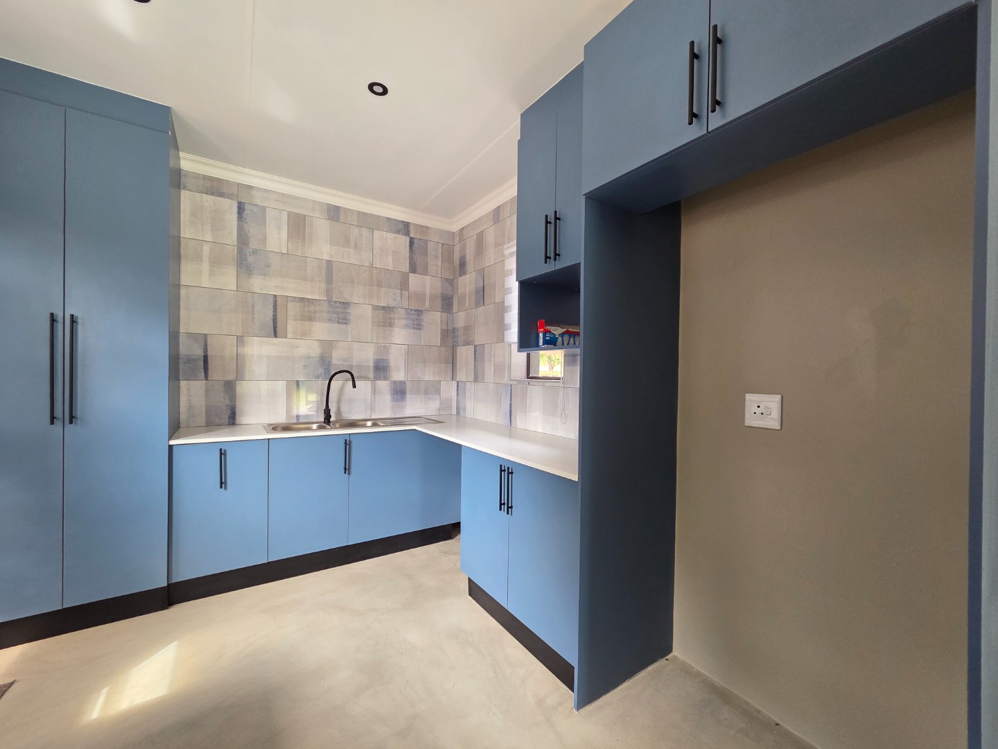 The home boasts a stunning kitchen fitted with sleek granite countertops, a gas hob, extractor fan, and ample cupboard space. A separate laundry area adds to the home’s practicality and convenience.