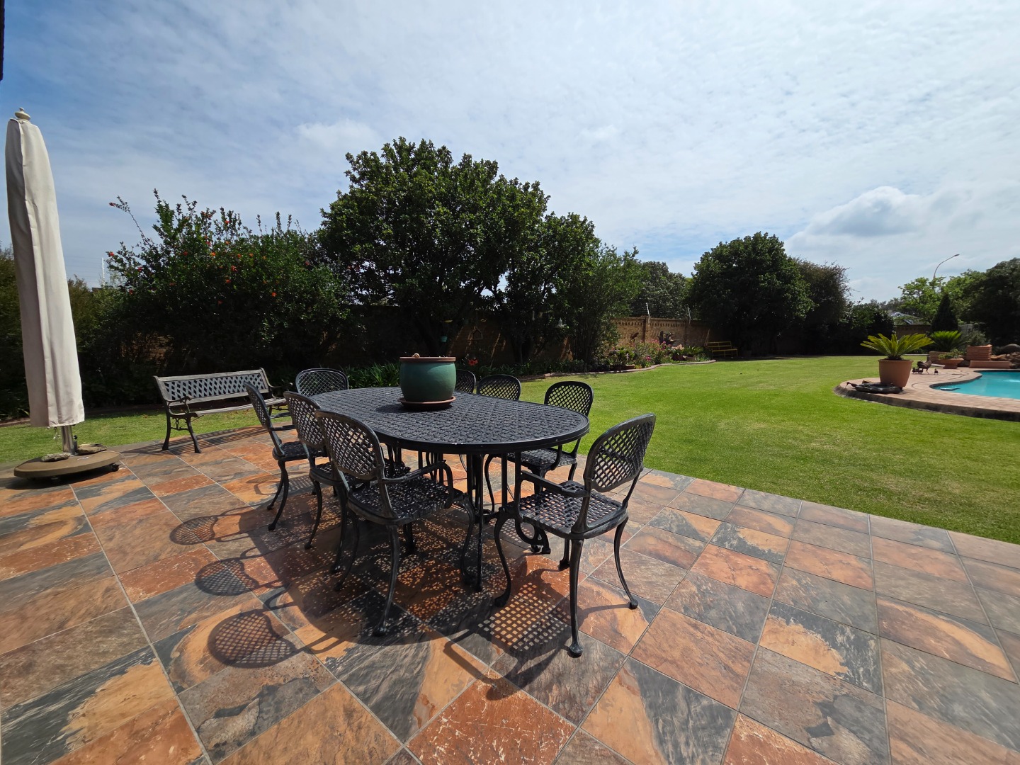 Open tiled patio overlooking a landscaped garden and sparkling swimming pool (solar panels not in working order)
