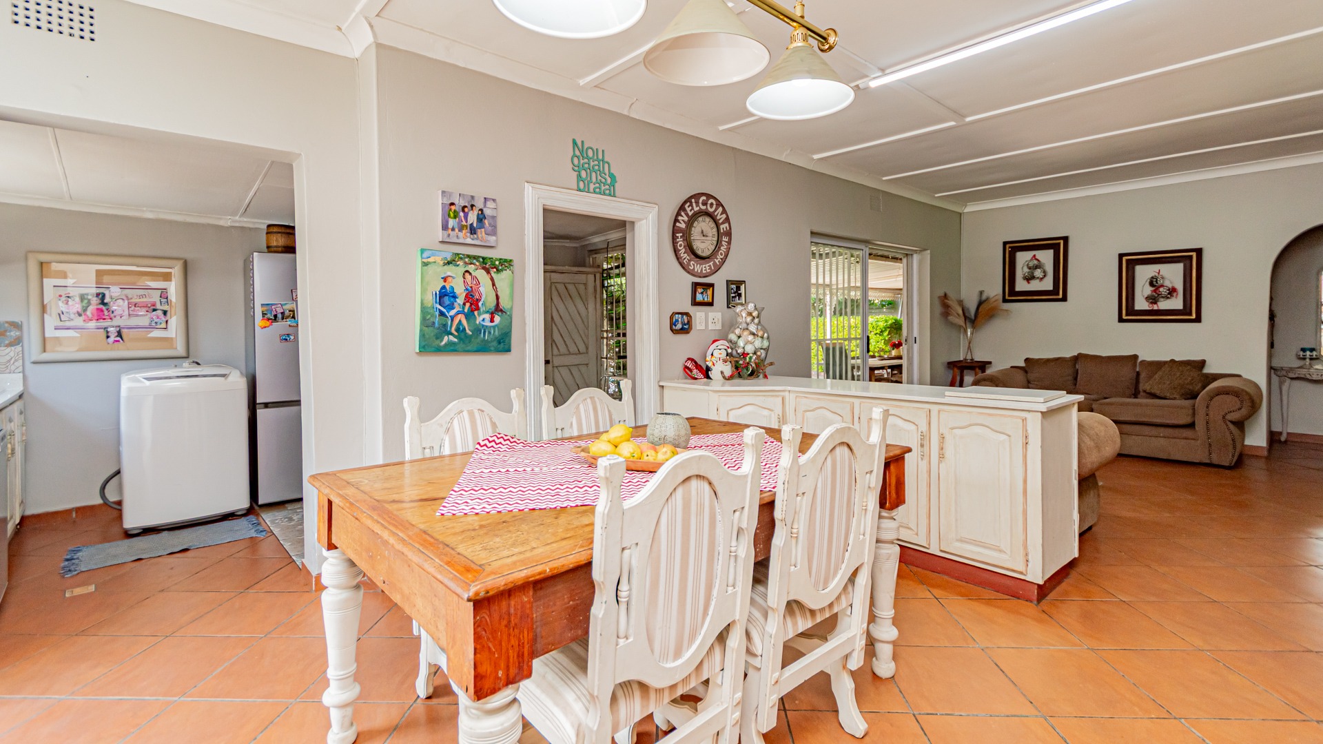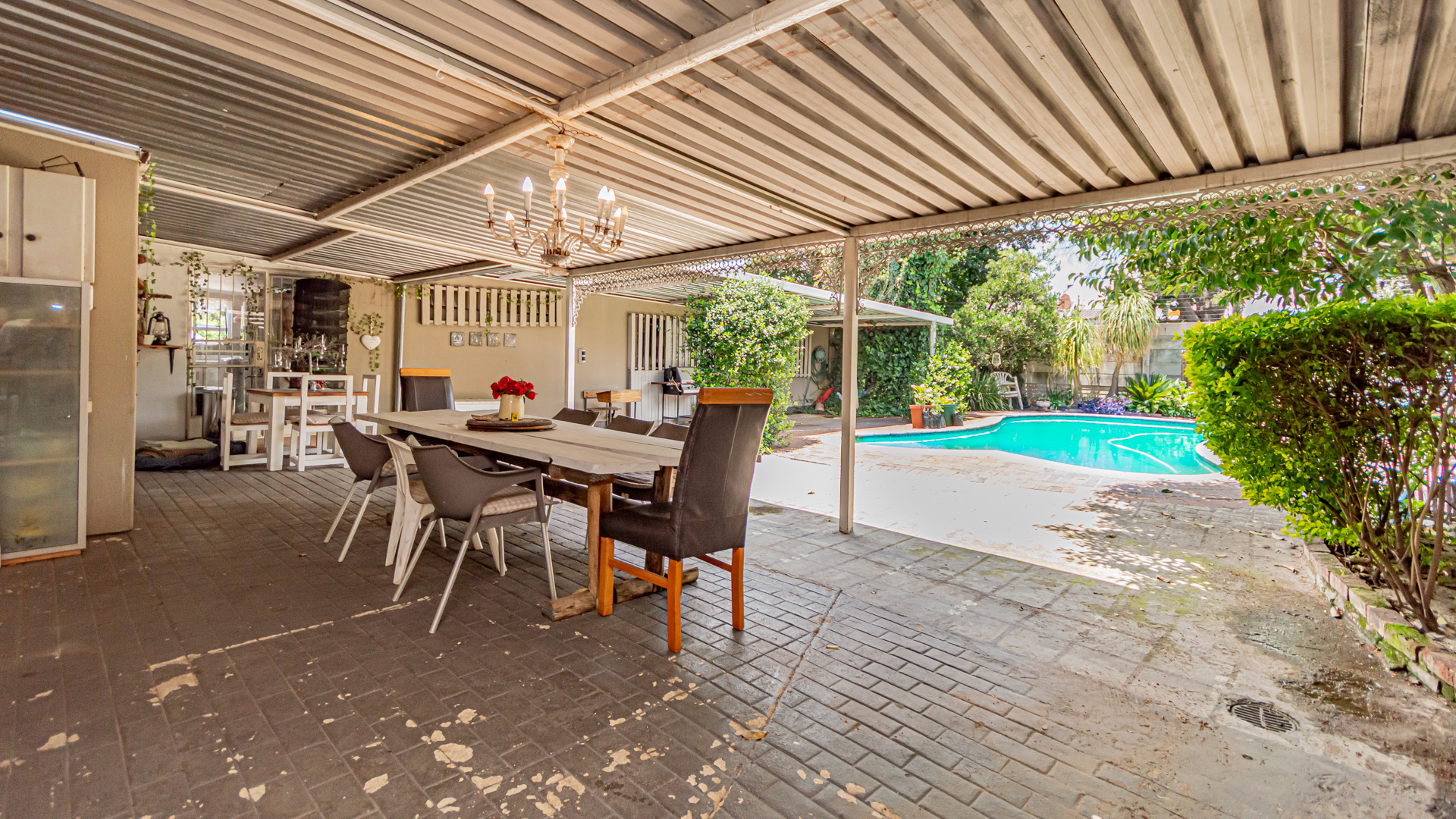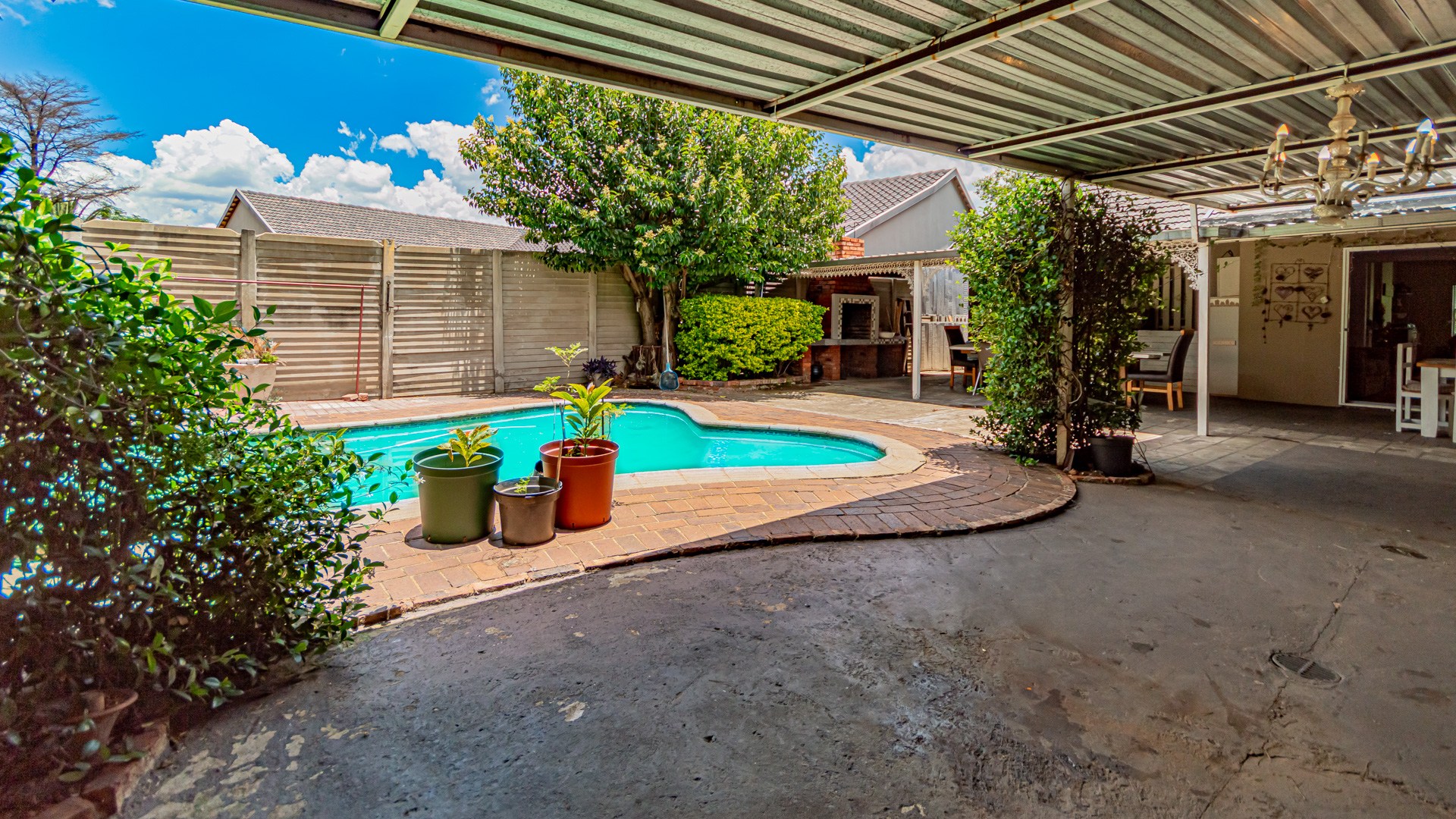 Security is in place, with high walls, burglar bars, cameras, an alarm system, and an automated Front gate. Extra features include two solar power geysers, in total three geysers, pre-paid electricity, and an outdoor toilet near the pool. Parking is hassle-free with a carport and plenty of paved driveway space.