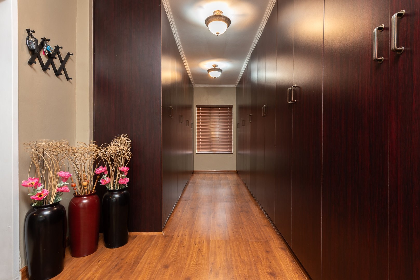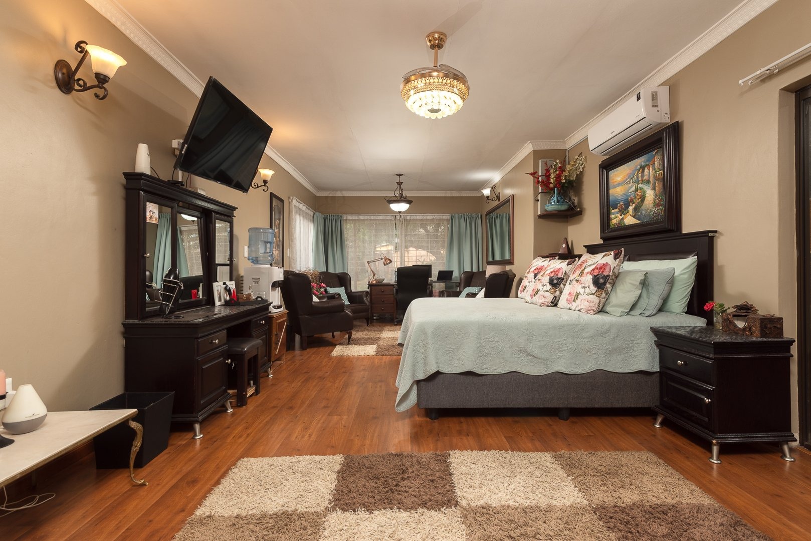 This home offers four spacious bedrooms, all featuring warm wooden flooring, built-in cupboards, curtain rails, and ceiling fans. The expansive main bedroom suite includes air conditioning, sliding doors opening to the garden, walk-in closets, a study area or pajama lounge, and a private atrium feature. The second bedroom is generously sized with wooden flooring, a ceiling fan, and sliding door access, while the remaining two bedrooms are well-proportioned and comfortable.
