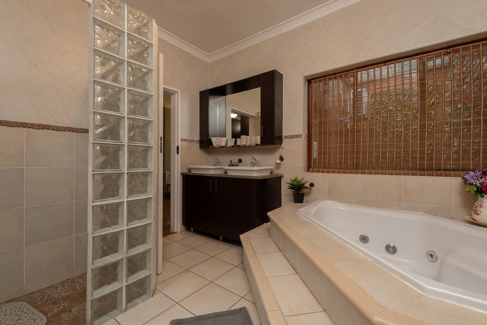 Main en-suite with a corner Jacuzzi bath, shower, double basin, and atrium feature