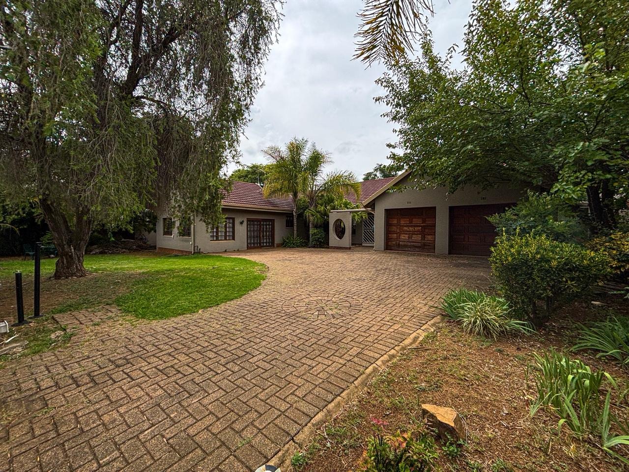 Discover this contemporary six-bedroom residence nestled in the desirable suburban area of Brackenhurst, Alberton. The property immediately impresses with its inviting circular paved driveway and a meticulously established garden featuring mature trees, setting a welcoming tone. The classic grey and tan exterior, complemented by a terracotta tiled roof and a double garage, offers excellent kerb appeal.