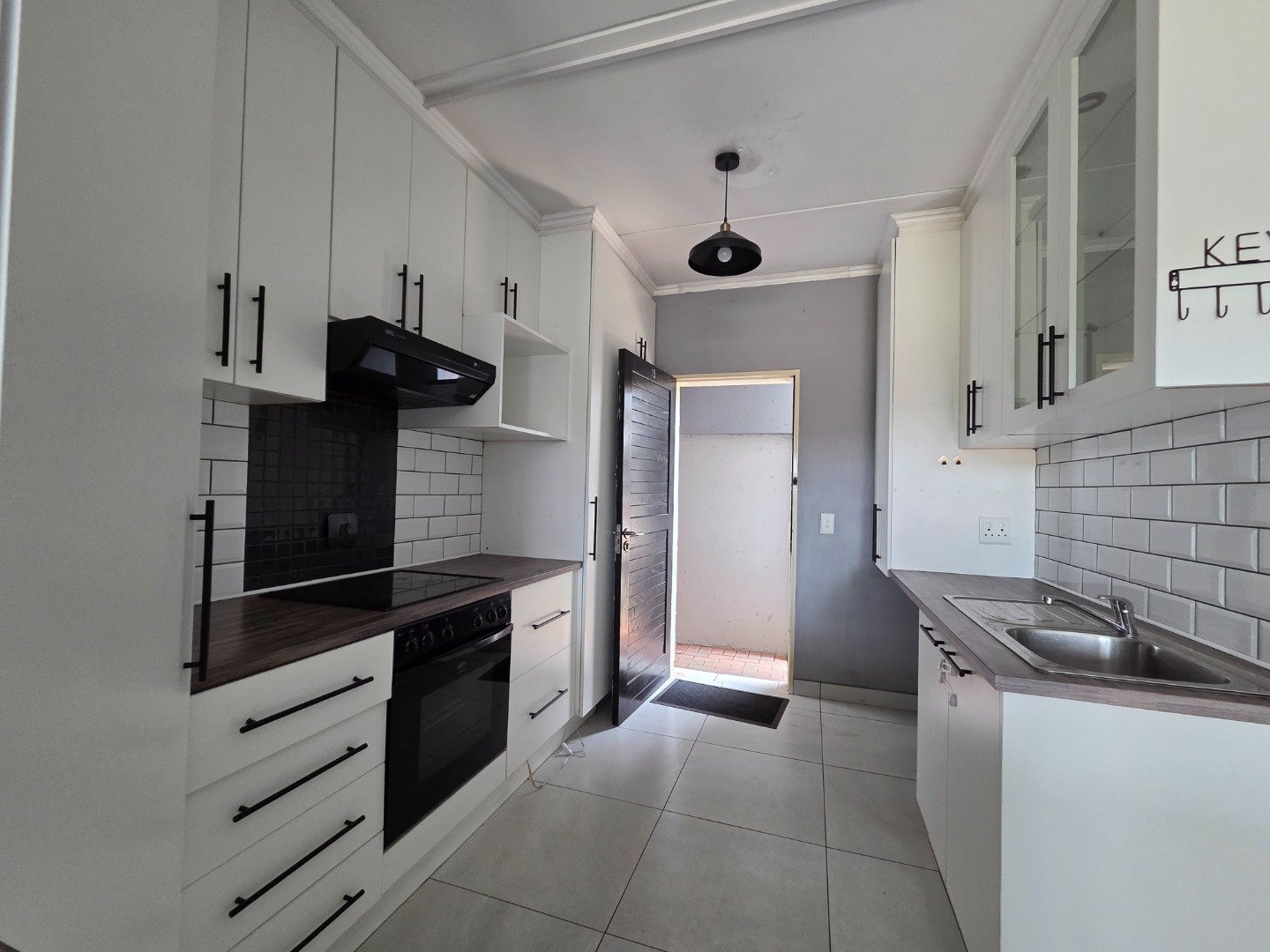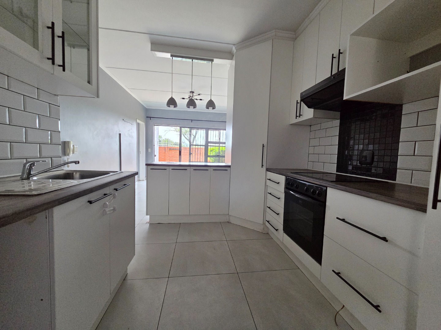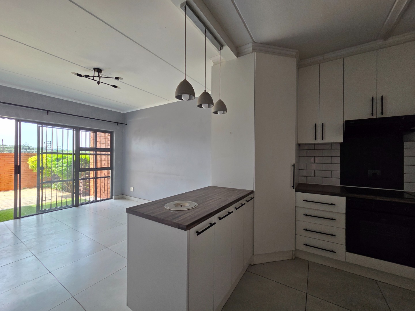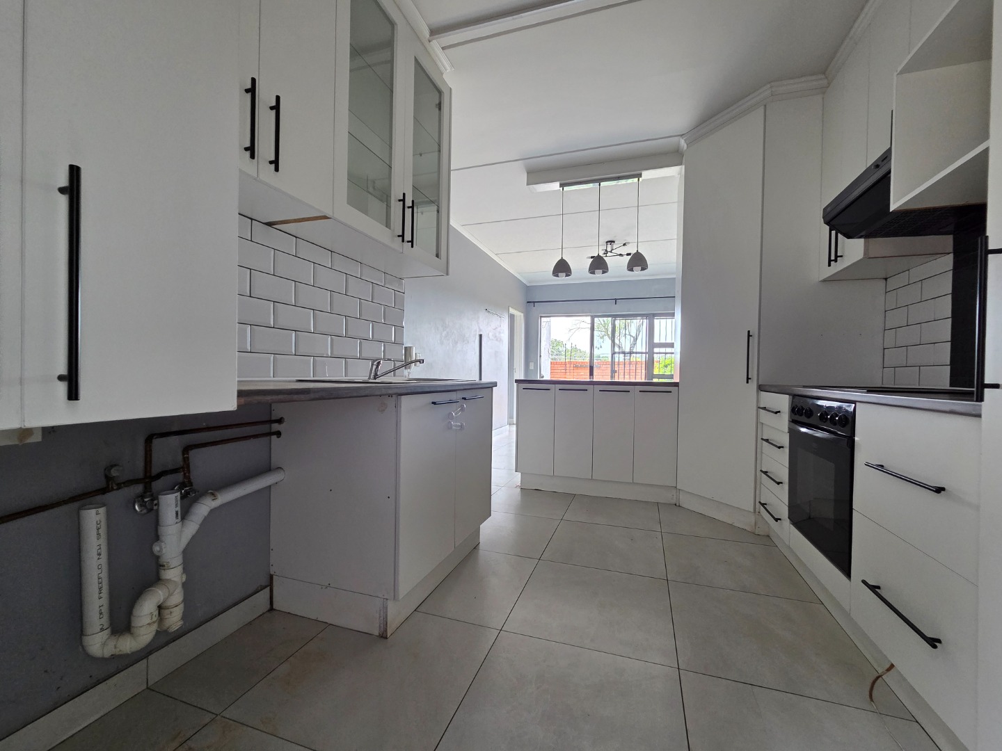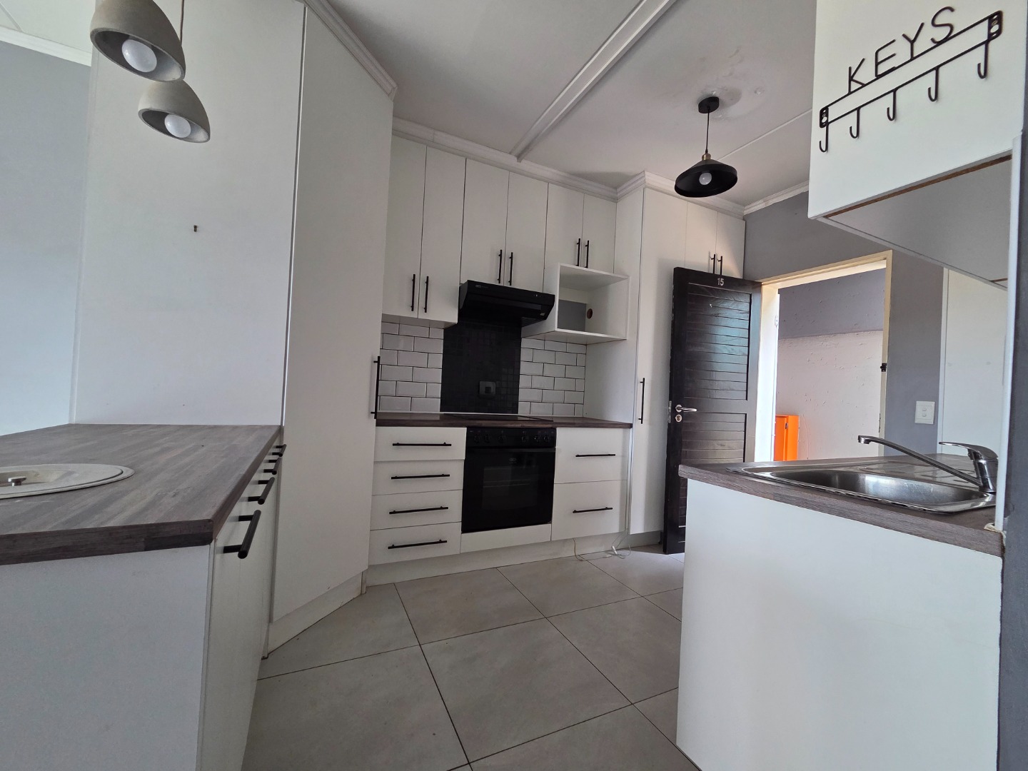 Open-plan kitchen with ample cupboard space, built-in pantry, and room for two appliances