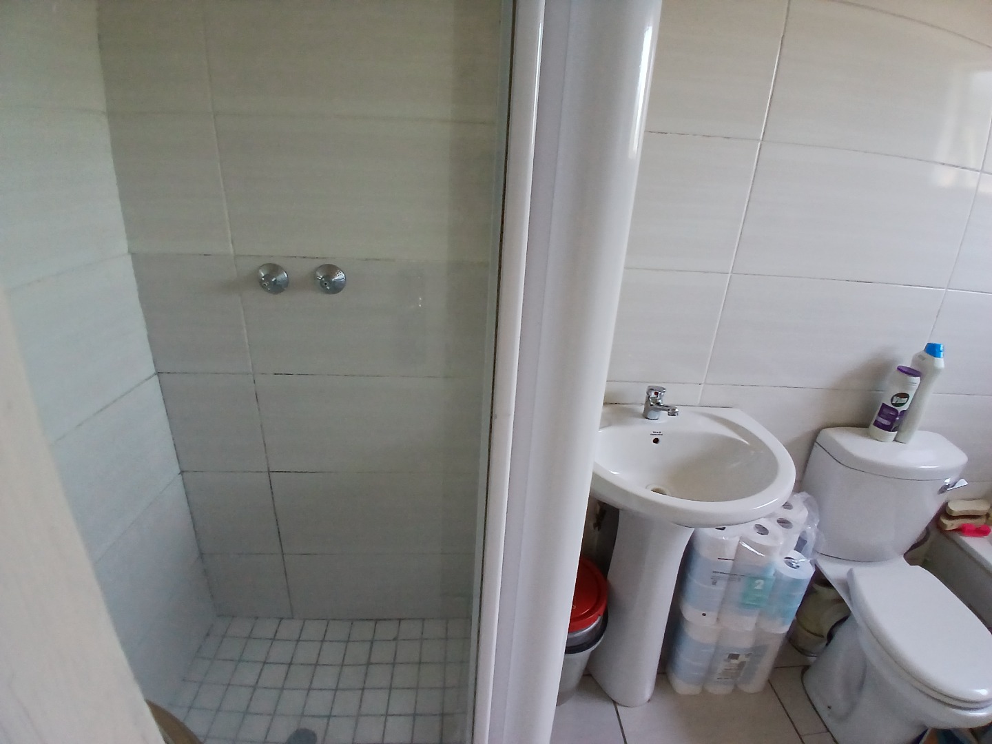 The tiled bathroom includes a shower, bath, basin, and toilet.