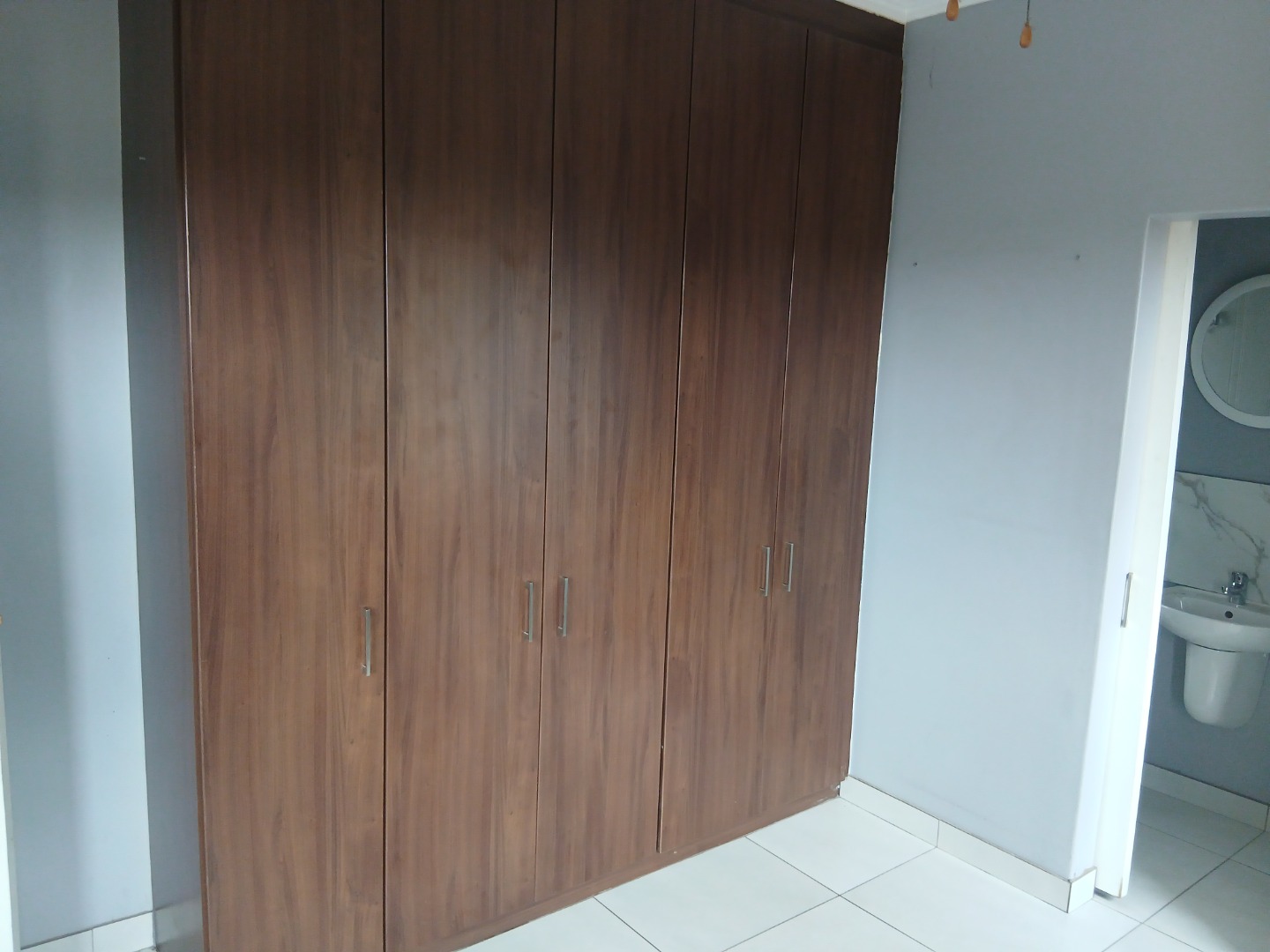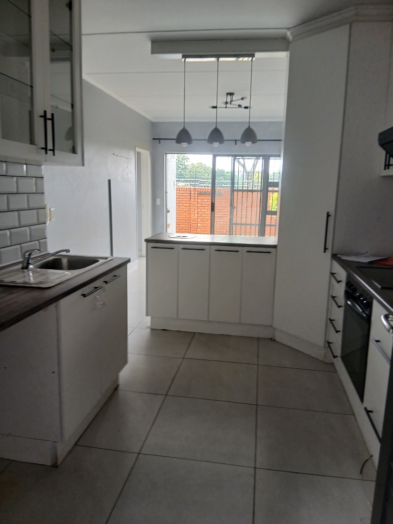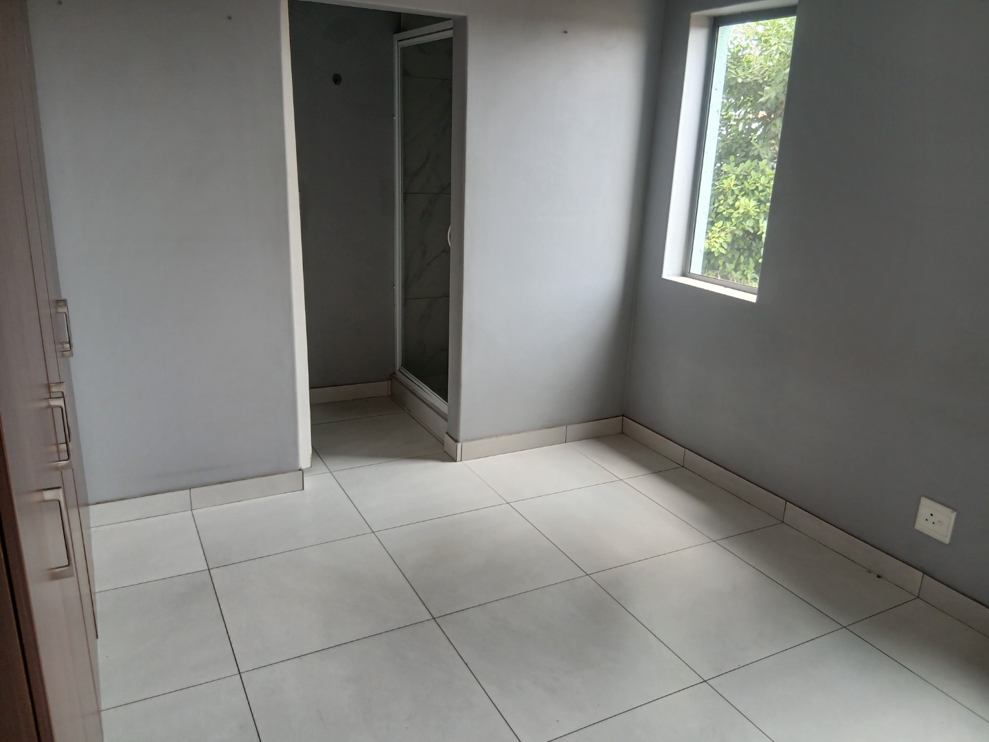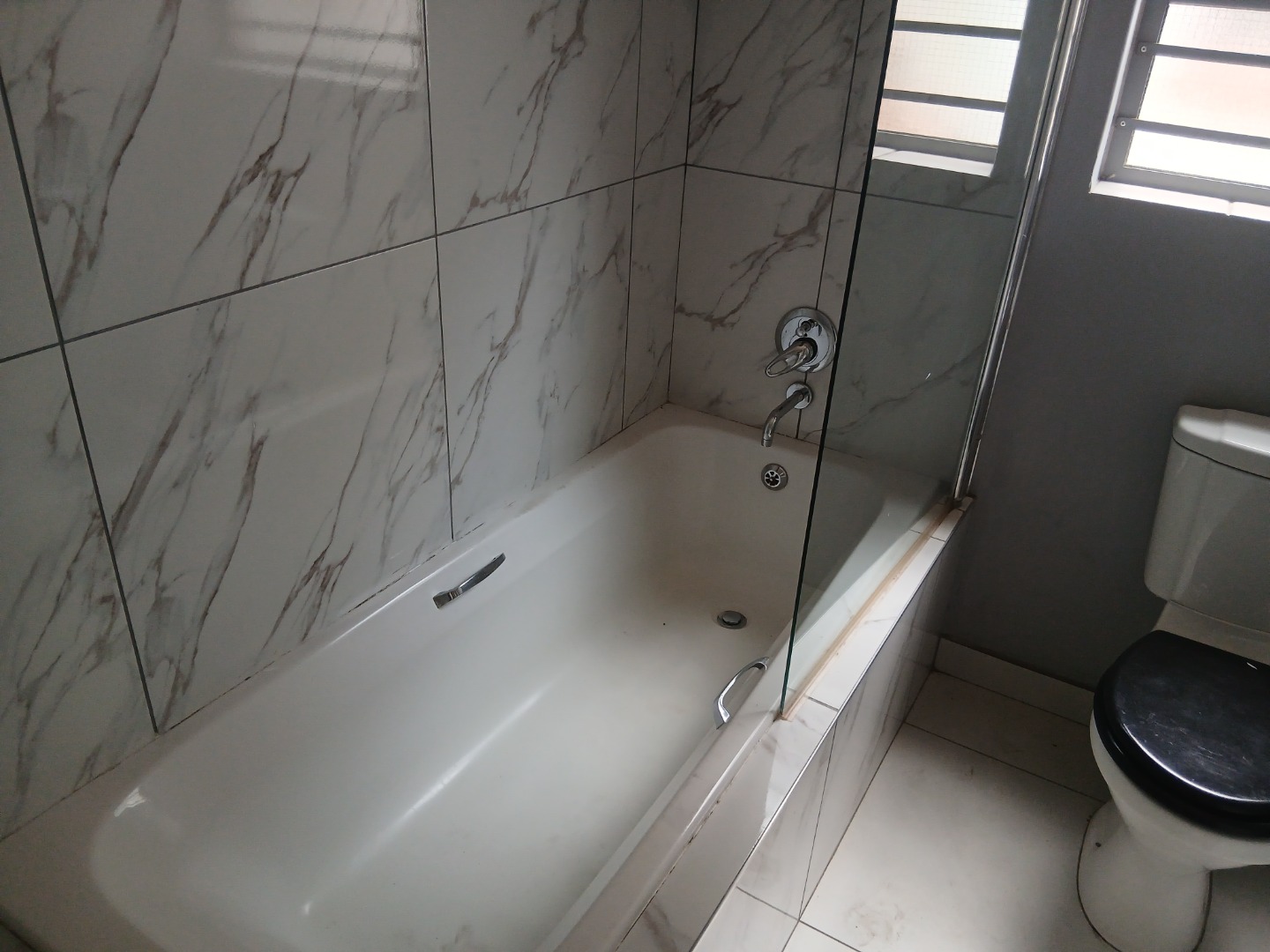 The main bedroom is tiled and includes built-in cupboards, as well as an en-suite bathroom with a shower, toilet, and basin. The two additional bedrooms are spacious and also fitted with built-in cupboards. The second bathroom includes a bath-and-shower combination, toilet, and basin.