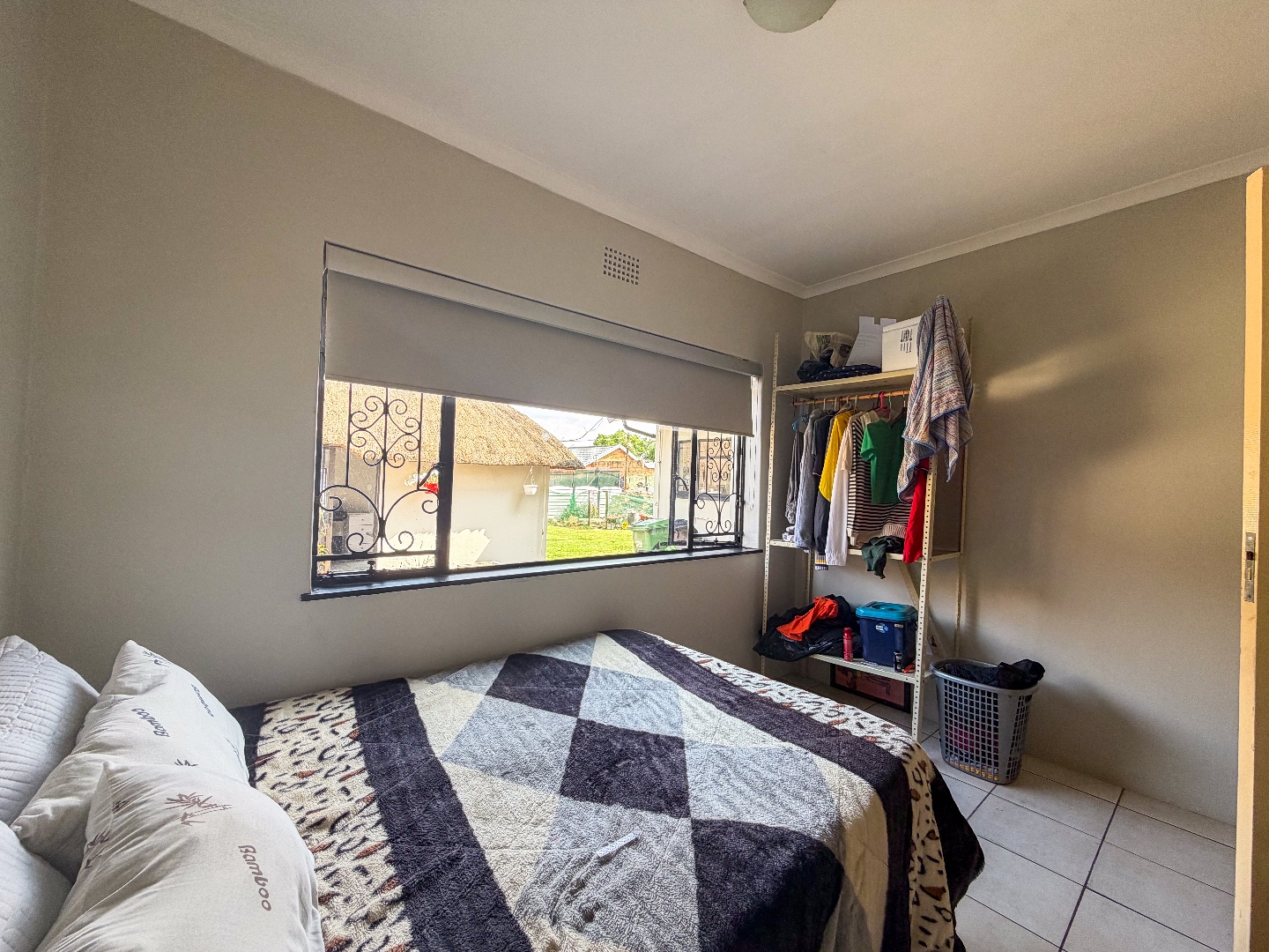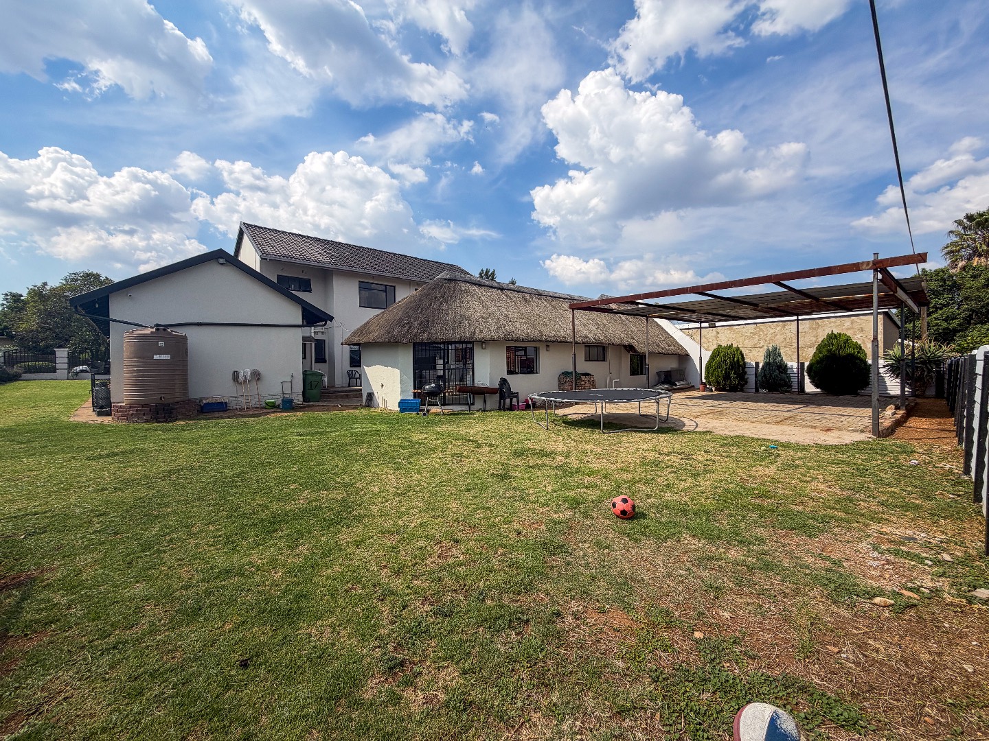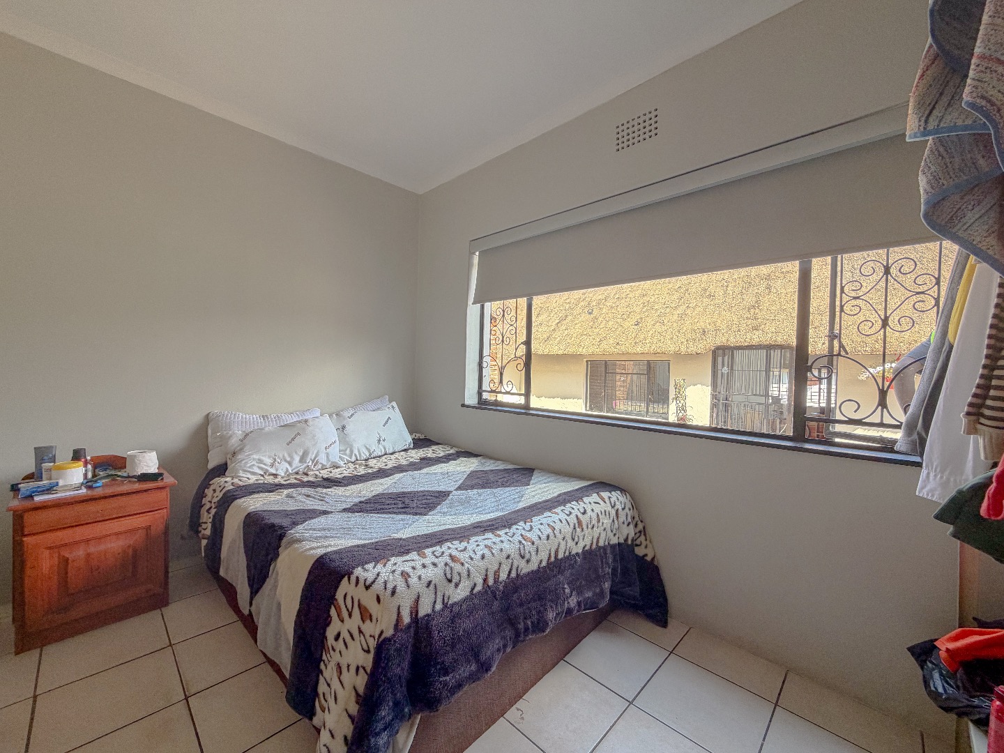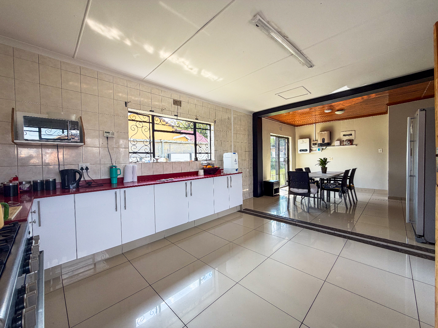 The kitchen opens onto a large garden complete with a thatched lapa which could be completed and used as a separate flatlet or entertainment area.