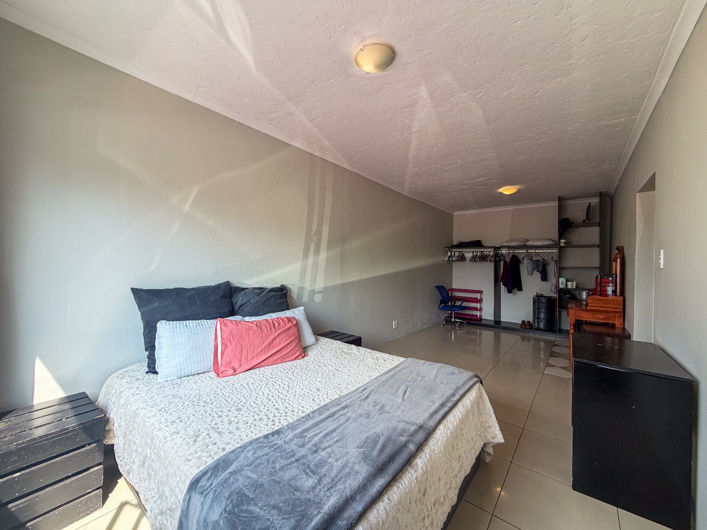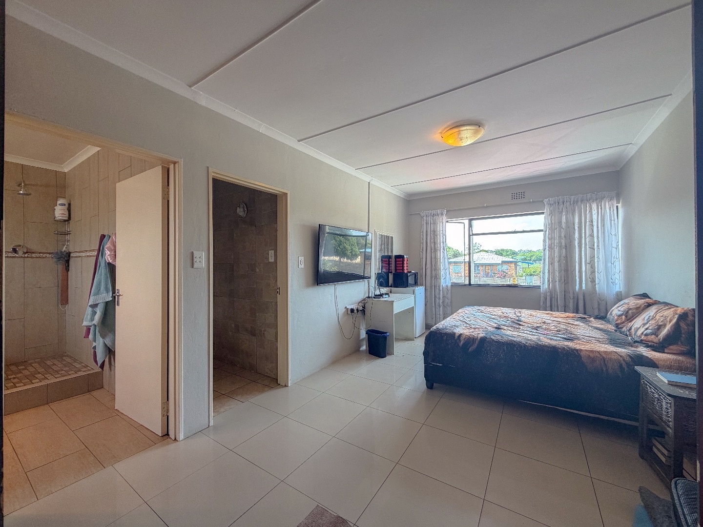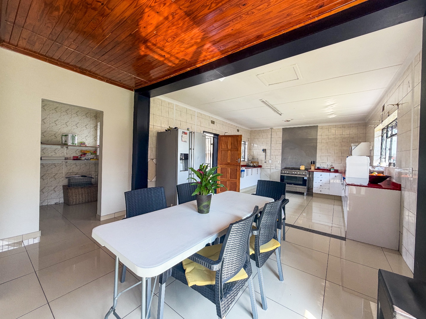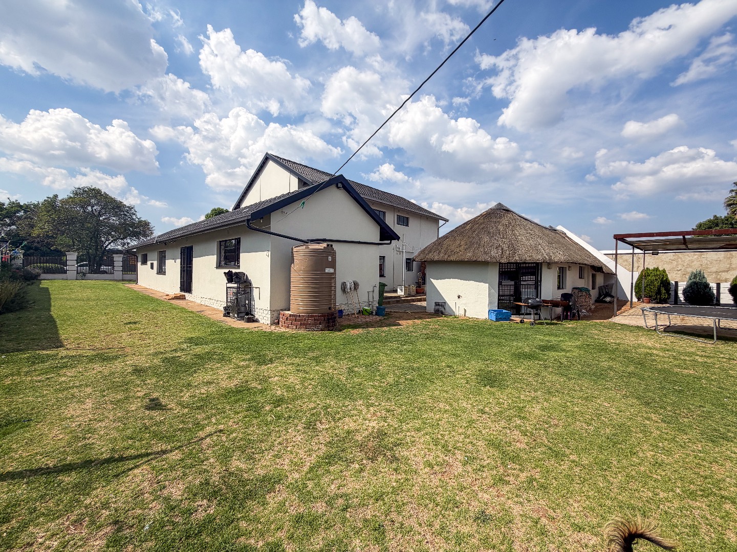 The kitchen opens onto a large garden complete with a thatched lapa which could be completed and used as a separate flatlet or entertainment area.