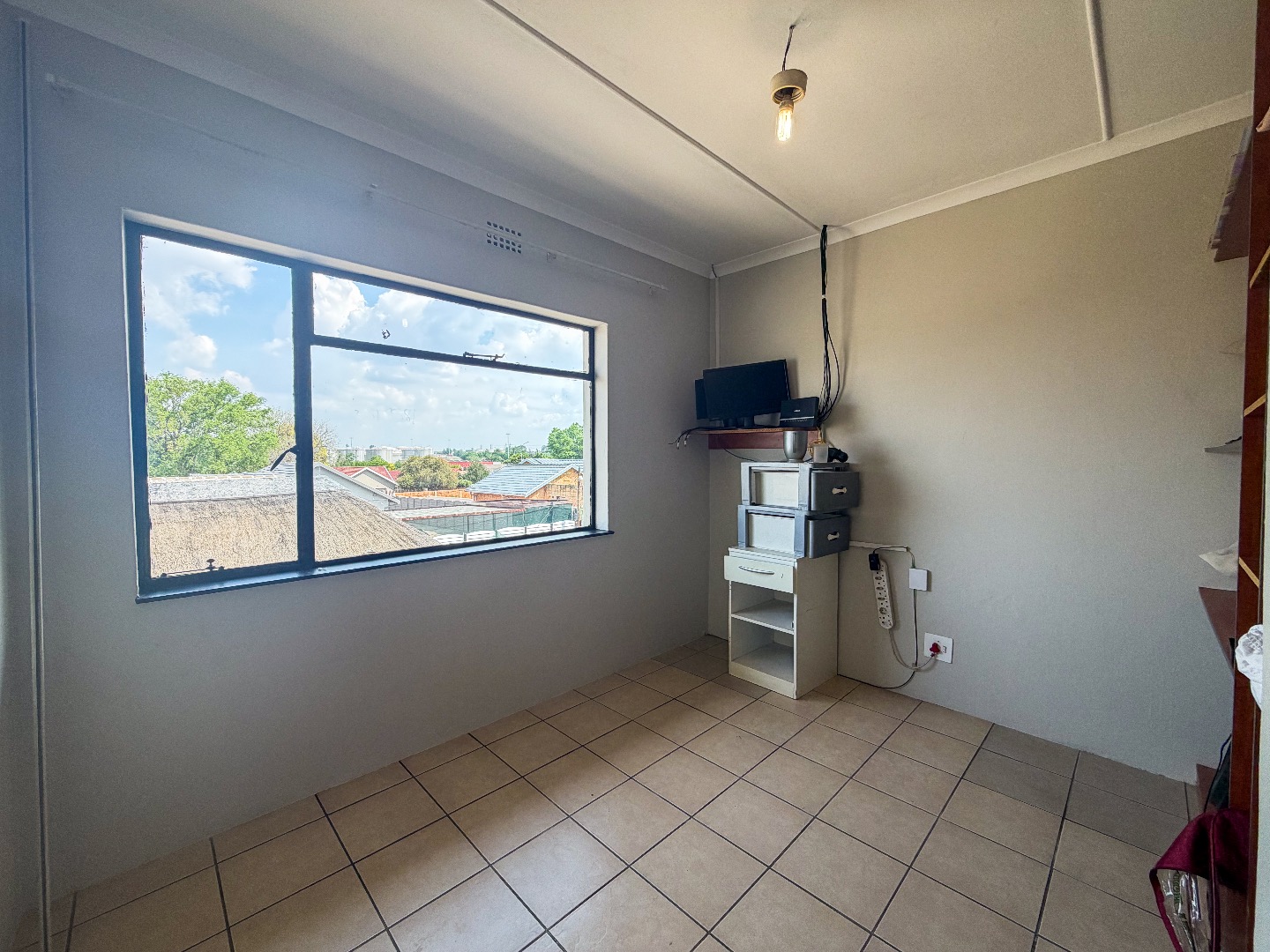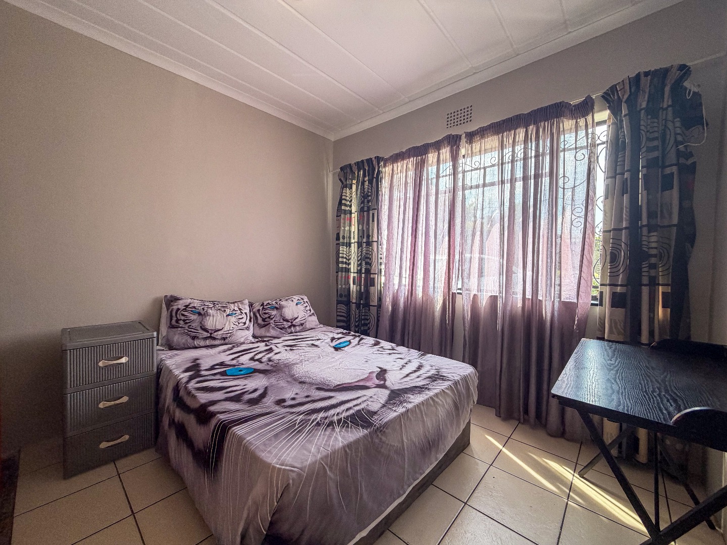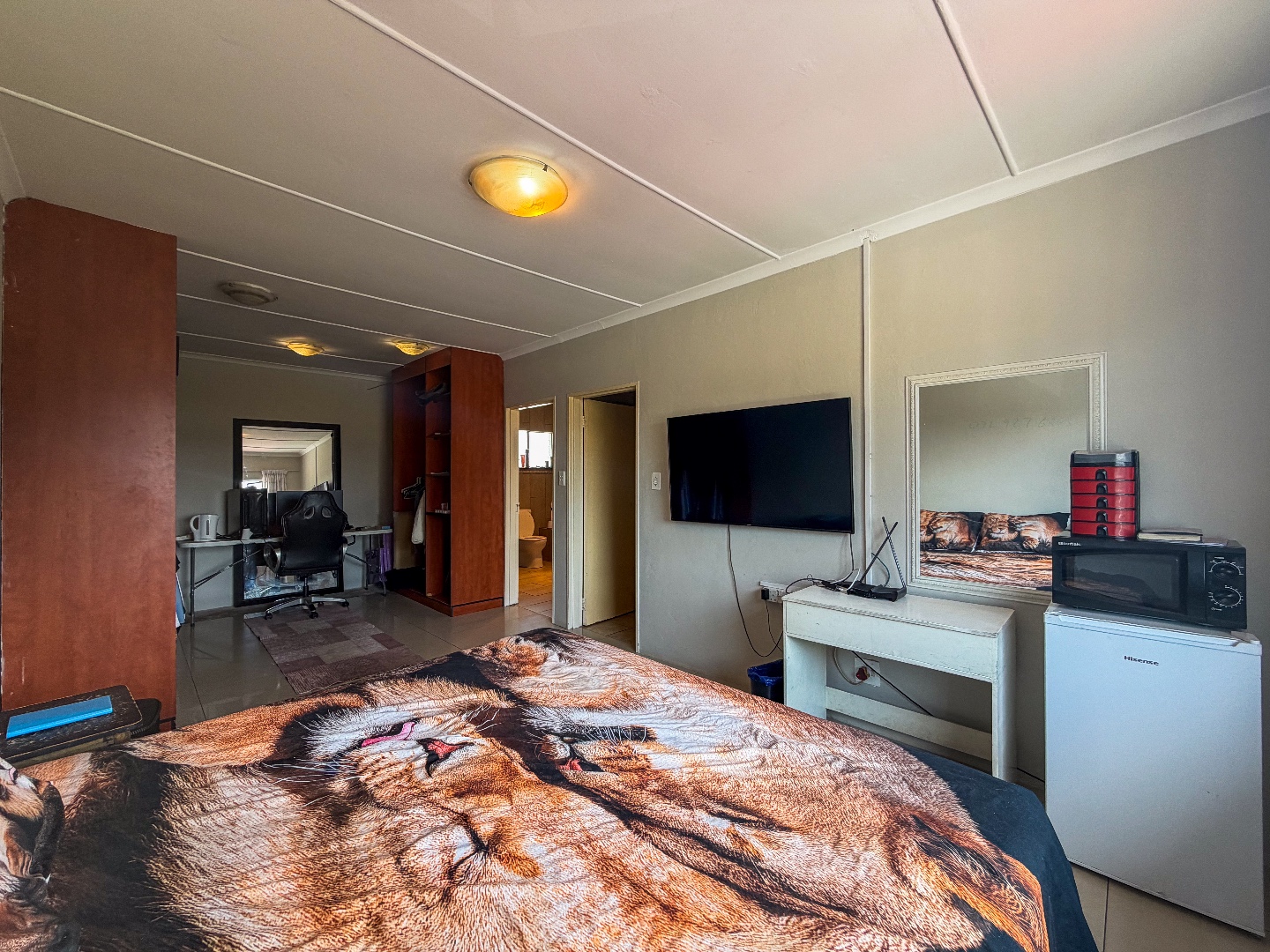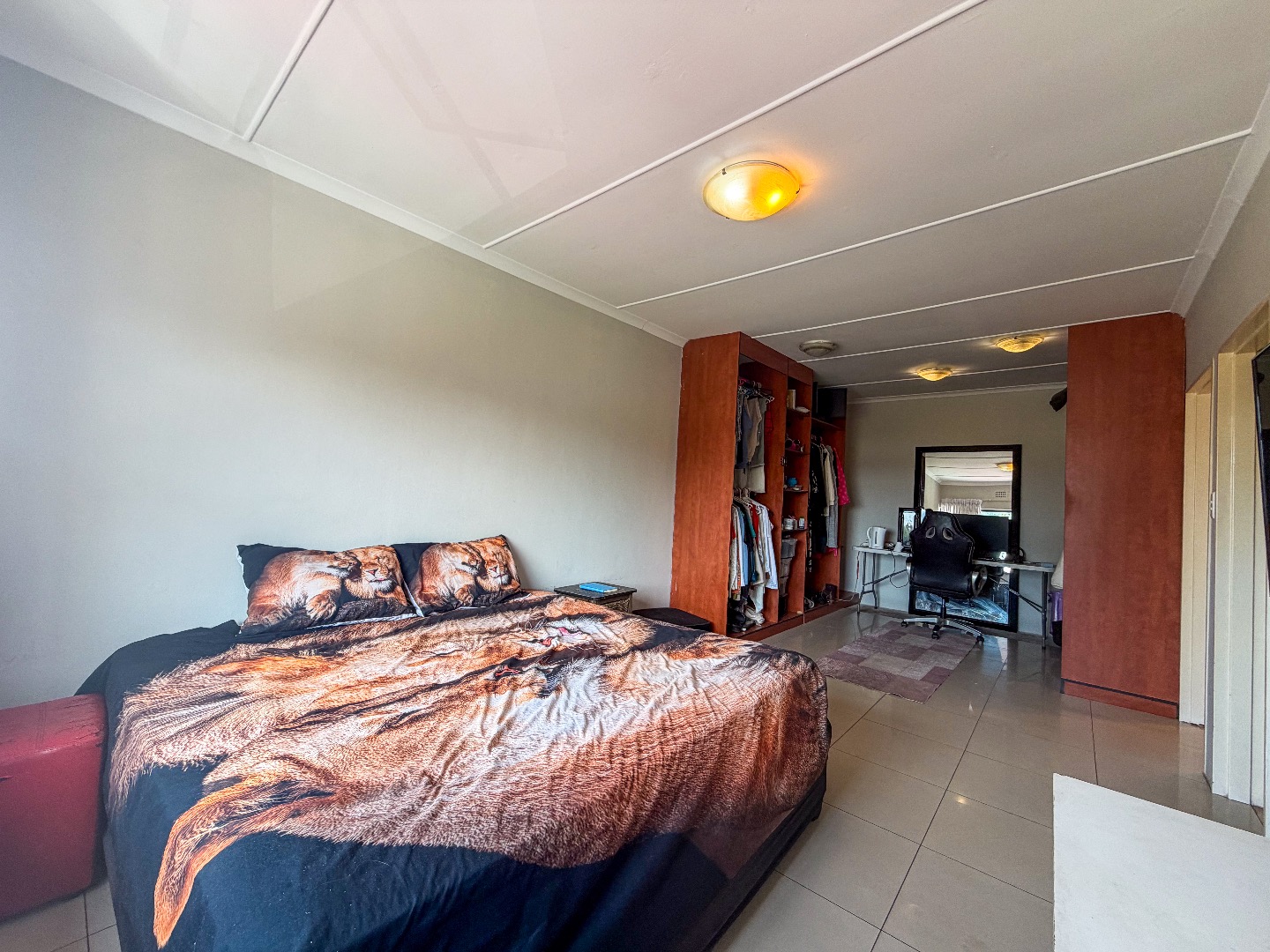 The kitchen opens onto a large garden complete with a thatched lapa which could be completed and used as a separate flatlet or entertainment area.