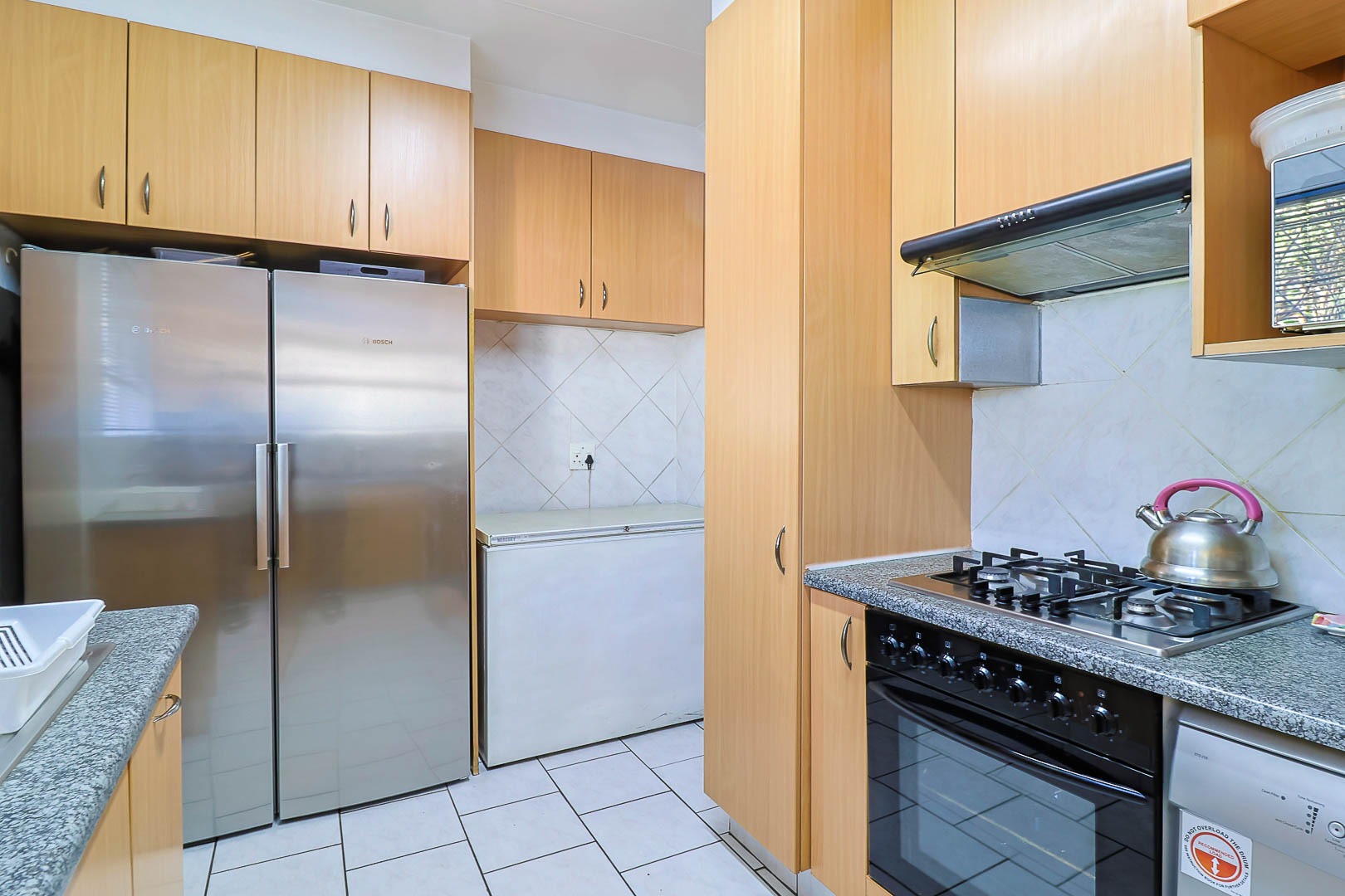 The entrance hall leads you to this cheerful lounge room that seamlessly flow to the dining room to the kitchen. The bright kitchen with very neat built-in cabinet has plenty of storage and counter space. It has under counter oven and gas hob and extractor, and connection for your dishwasher or washing machine.