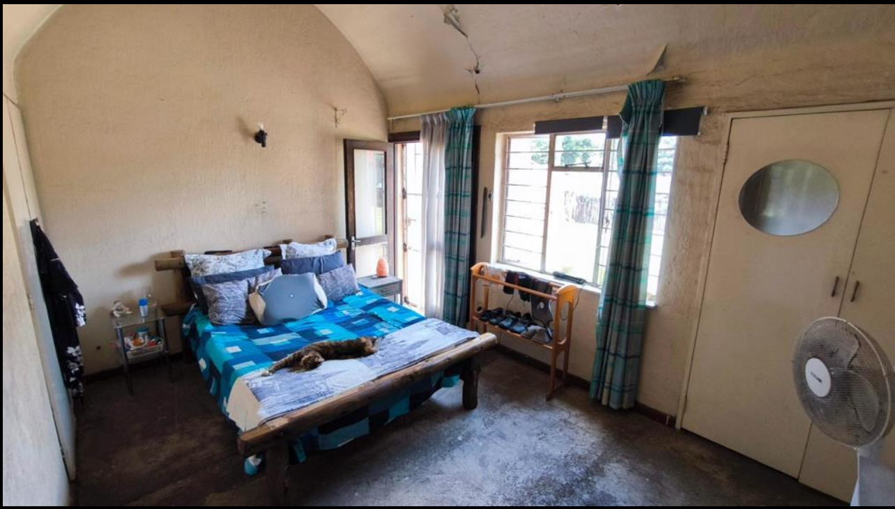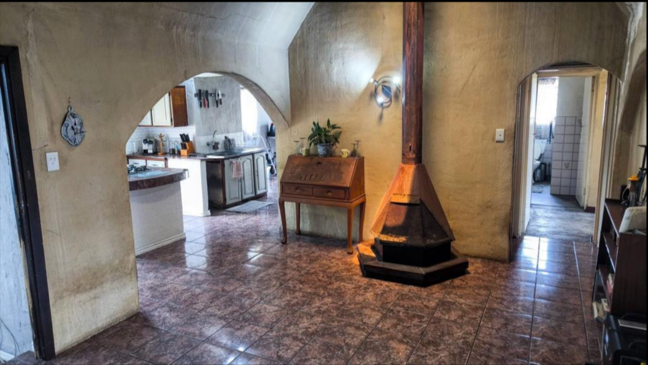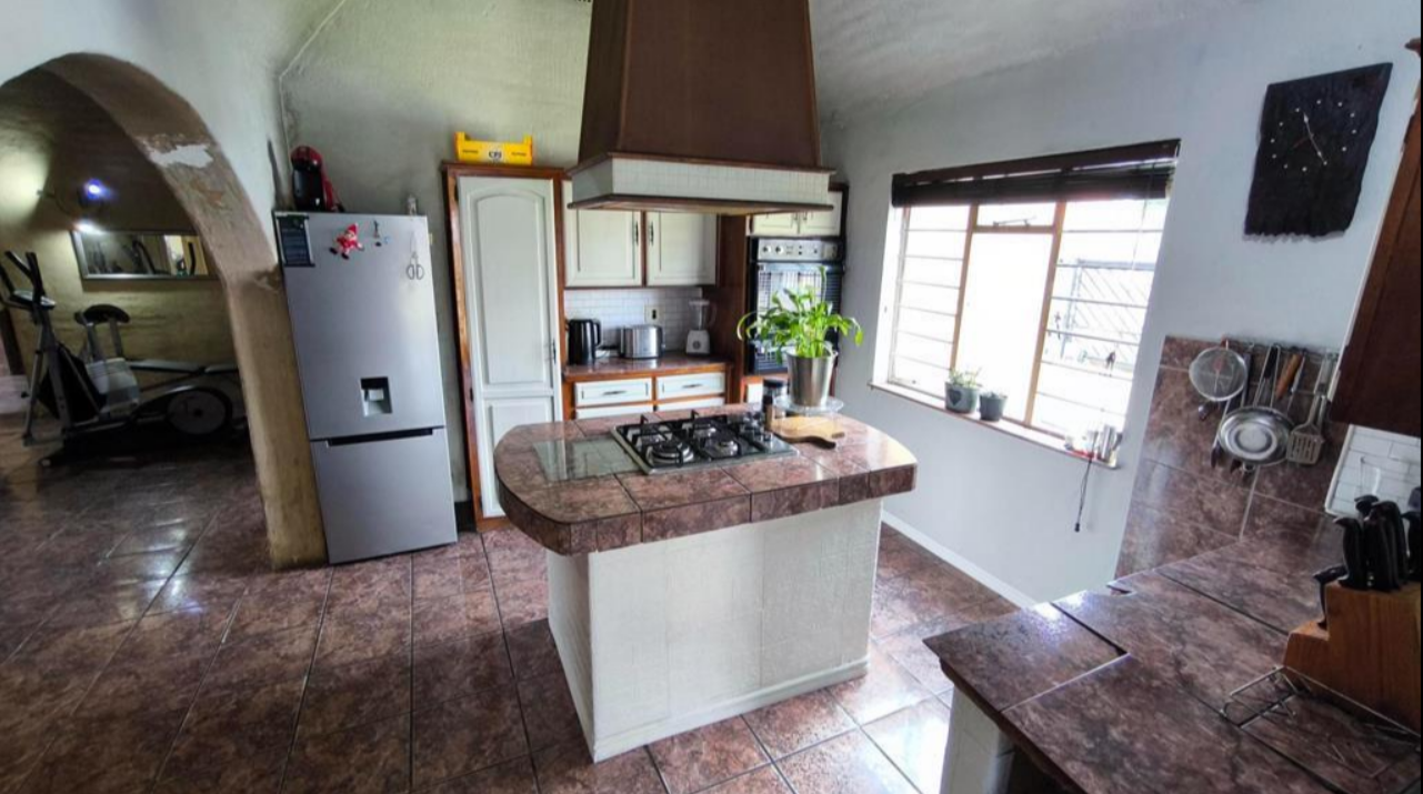 The interior features a kitchen equipped with a central island, Gas hob, and ample cabinetry, complemented by tiled countertops and a large window for natural light. An archway connects to an adjacent room, suggesting a flexible floor plan. The living areas boast durable tiled flooring, unique arched doorways, and a freestanding fireplace, adding character to the home. With four bedrooms and two bathrooms, including one ensuite, the property provides comfortable accommodation for a family.