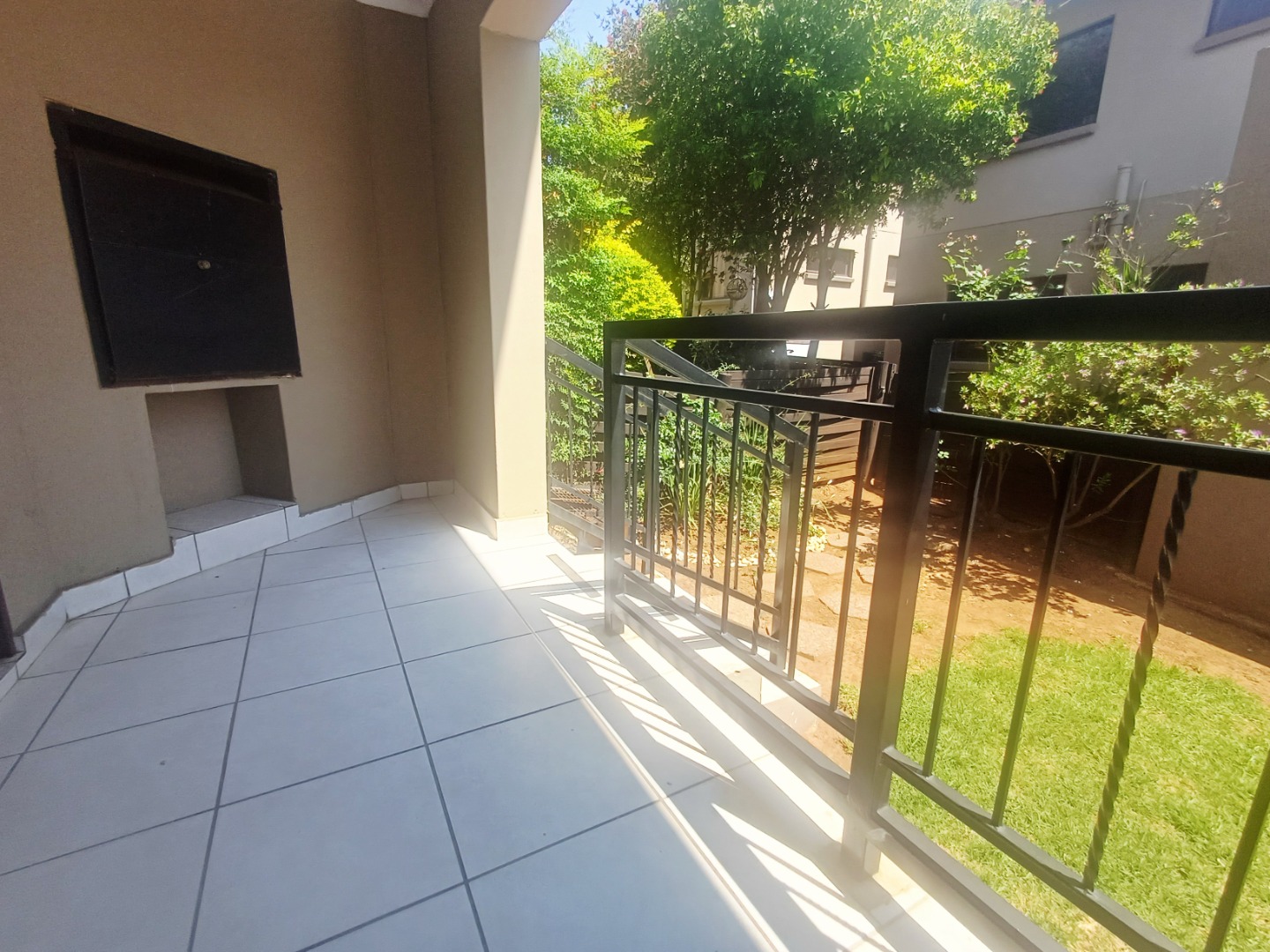 Step outside to a private, tiled outdoor area complete with a built-in braai, perfect for entertaining or relaxing. Residents also benefit from access to a communal pool, enhancing the lifestyle offerings. The property includes two dedicated parking spaces.