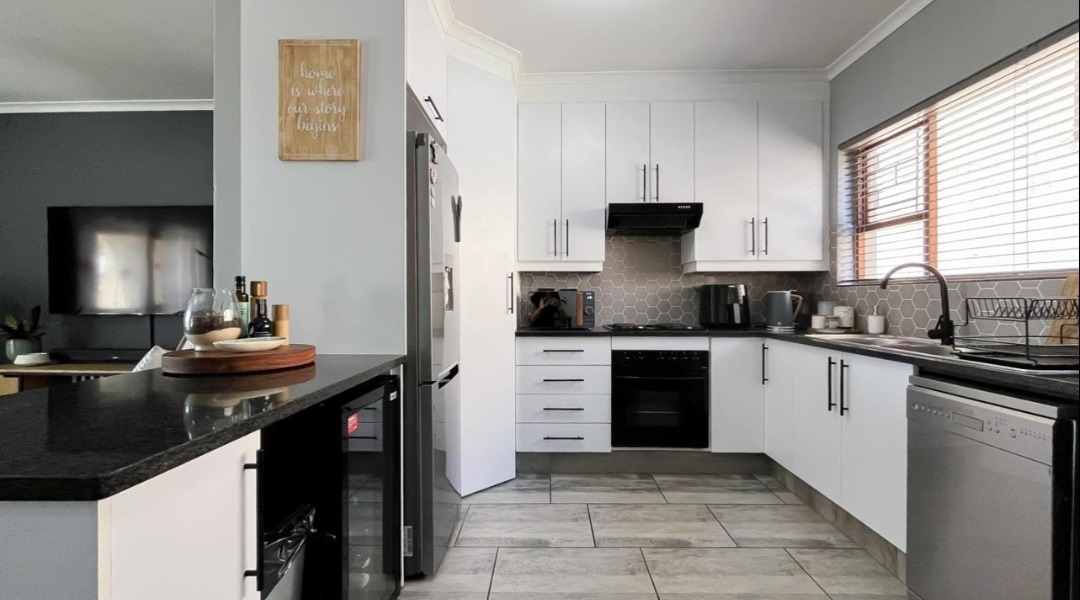 Step into a spacious open-plan living area featuring a large lounge and dining space that flows seamlessly into a modern kitchen equipped with ample cupboards and sleek granite countertops.