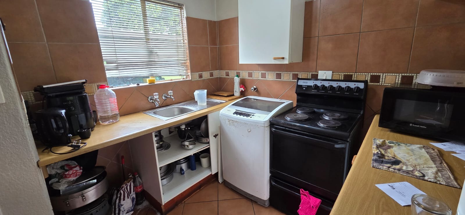 The kitchen is neat and functional, offering ample cupboard space and a practical layout for easy everyday living.