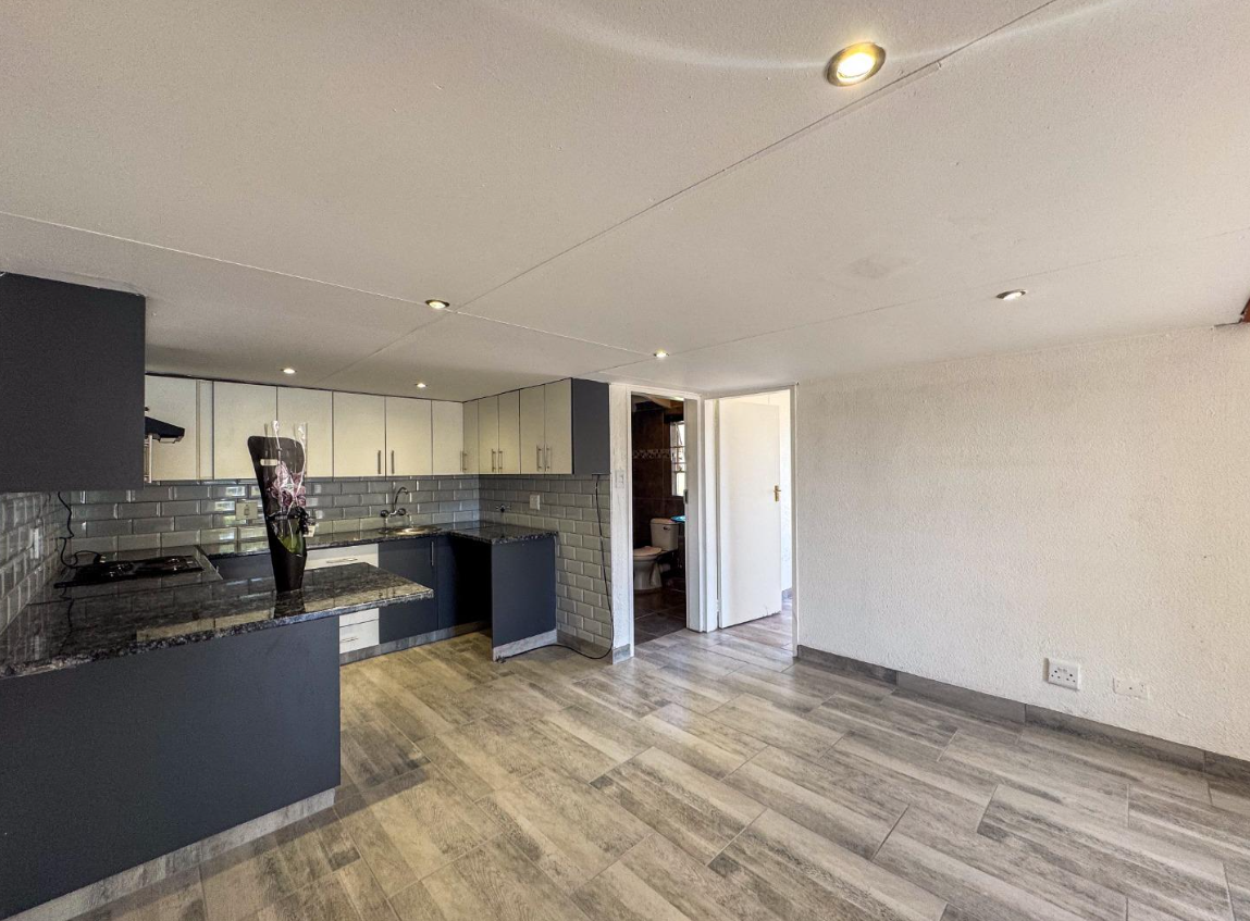 Discover modern living within the secure 'ST GERAN' complex in Meyersdal, Alberton. This ground-floor unit features a neat exterior with a private entrance, complete with a protective awning and security-barred windows. Inside, an inviting open-plan layout spans 59 square meters, showcasing contemporary wood-look tiled flooring throughout. The modern kitchen is a highlight, equipped with stylish two-tone cabinetry, dark granite countertops, a sleek subway tile backsplash, and integrated appliances. This space seamlessly connects to the dining area and lounge, creating an ideal flow for daily living.