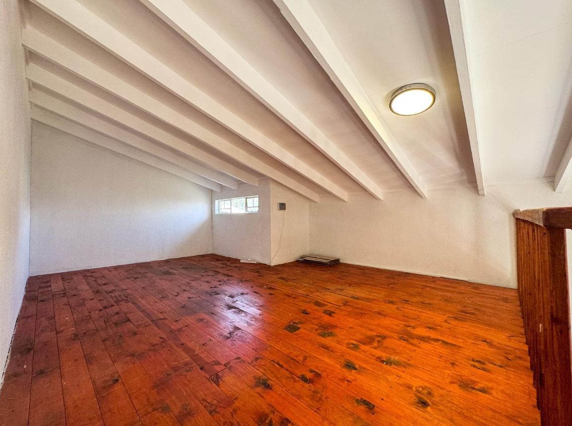 The property offers three well-proportioned bedrooms, complemented by a versatile loft area that can serve as an additional bedroom, study, or creative space. High ceilings with exposed beams add character and a sense of spaciousness. A single, well-appointed bathroom serves the unit, and built-in wardrobes provide practical storage. Residents can enjoy a small private garden area at the front, offering a touch of greenery, while the complex provides a communal swimming pool.