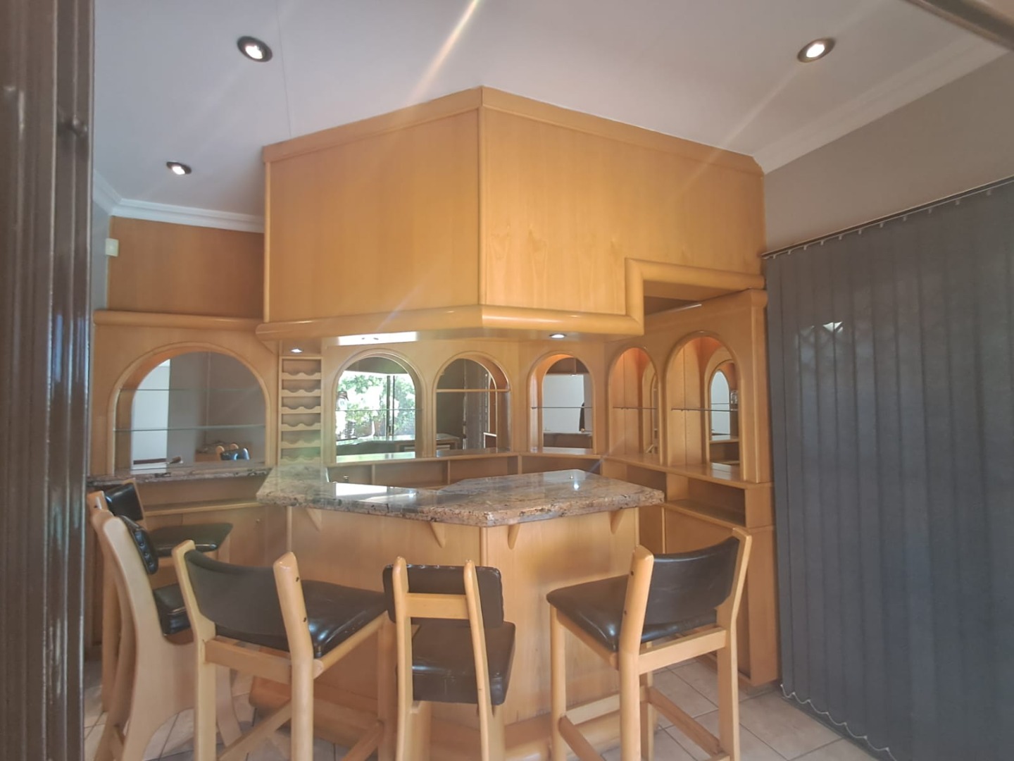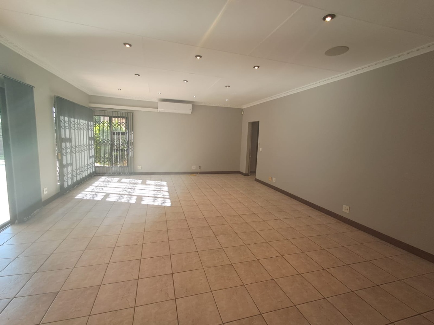 * Open plan lounge with air conditioning, leading to a covered patio with built-in braai