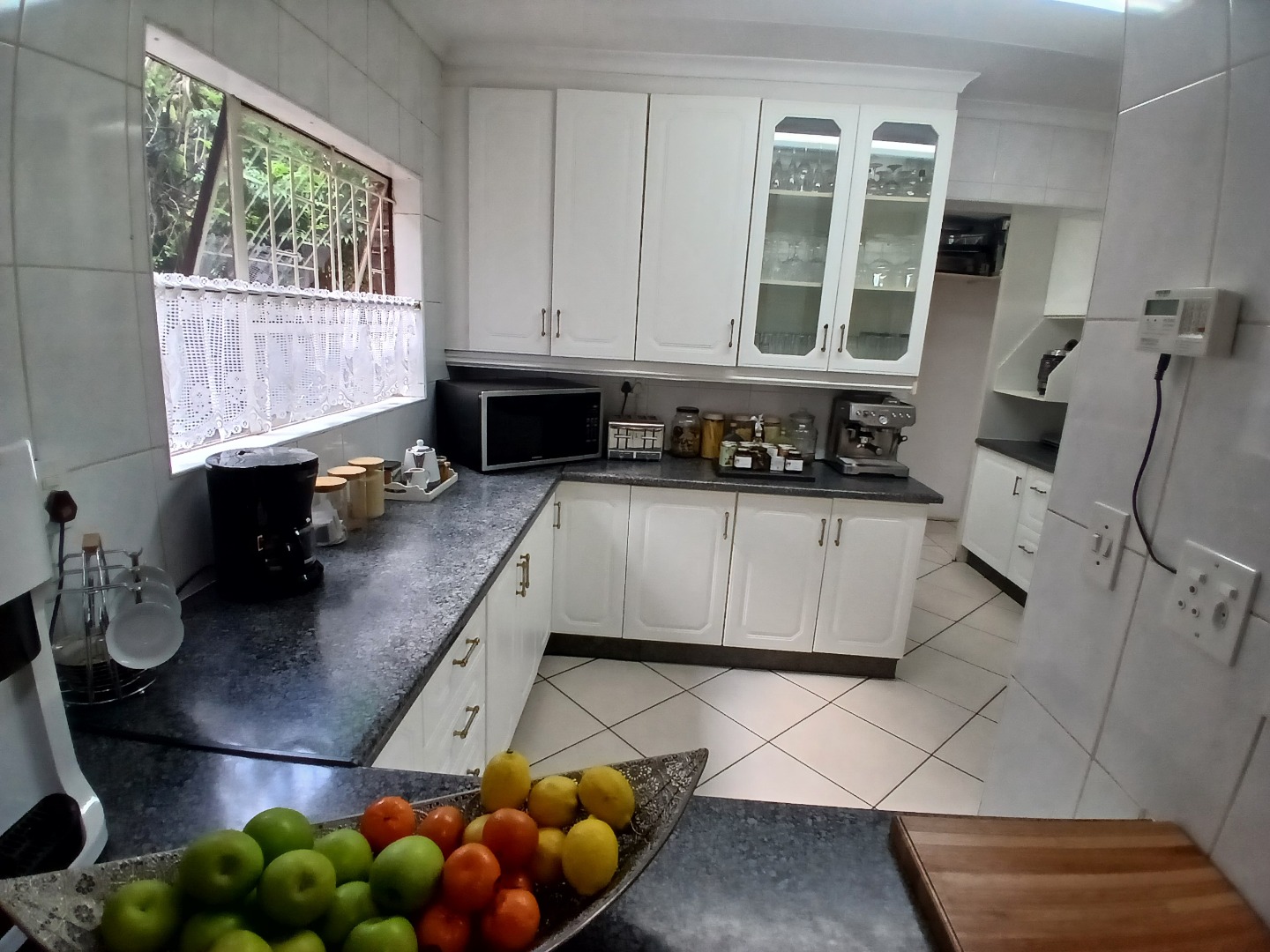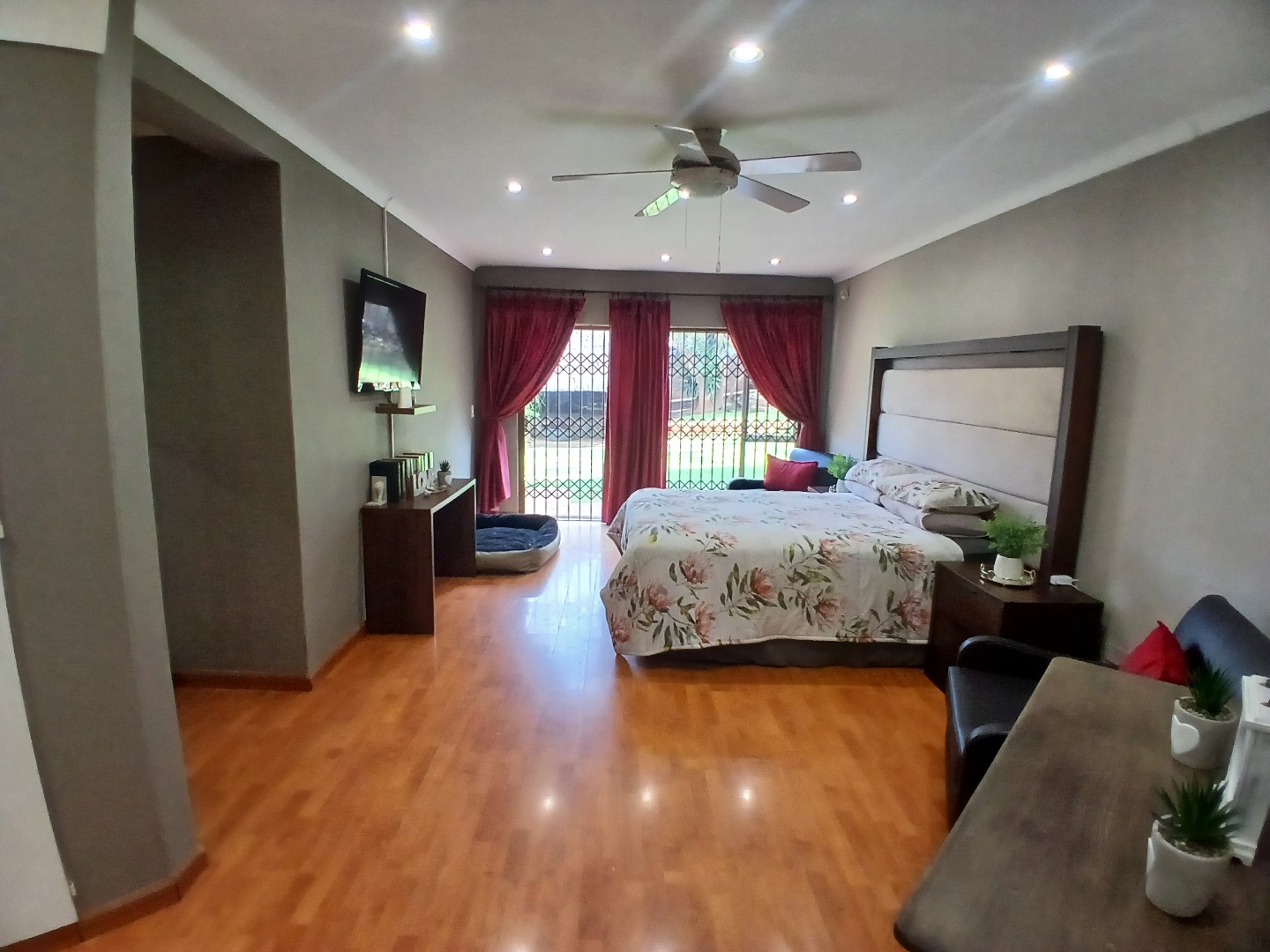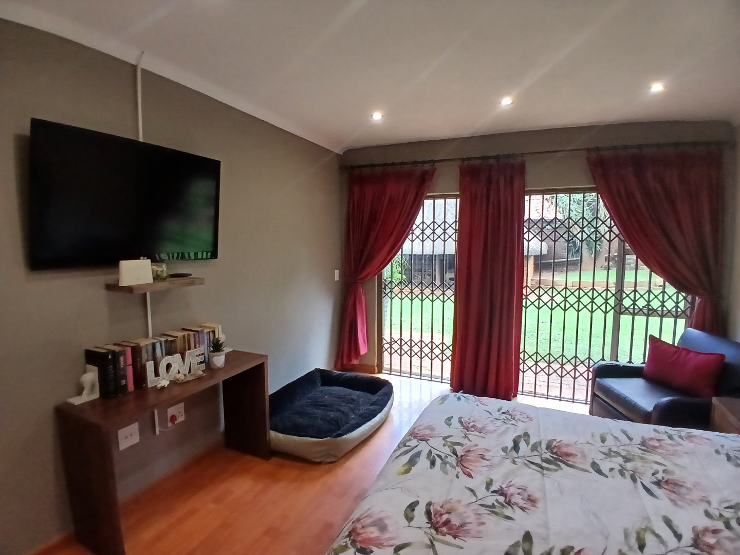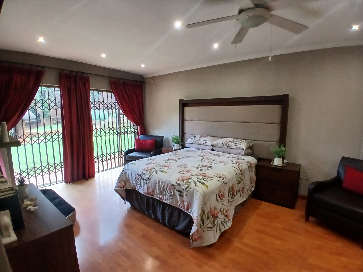 4 large bedrooms: Main bedroom with sliding doors to the garden, ample built-in cupboards and full tiled en-suite bathroom, 3 additional bedrooms serviced by two bathrooms (one en-suite). The kitchen is bright with white cabinetry, pantry, washing bay and separate laundry.