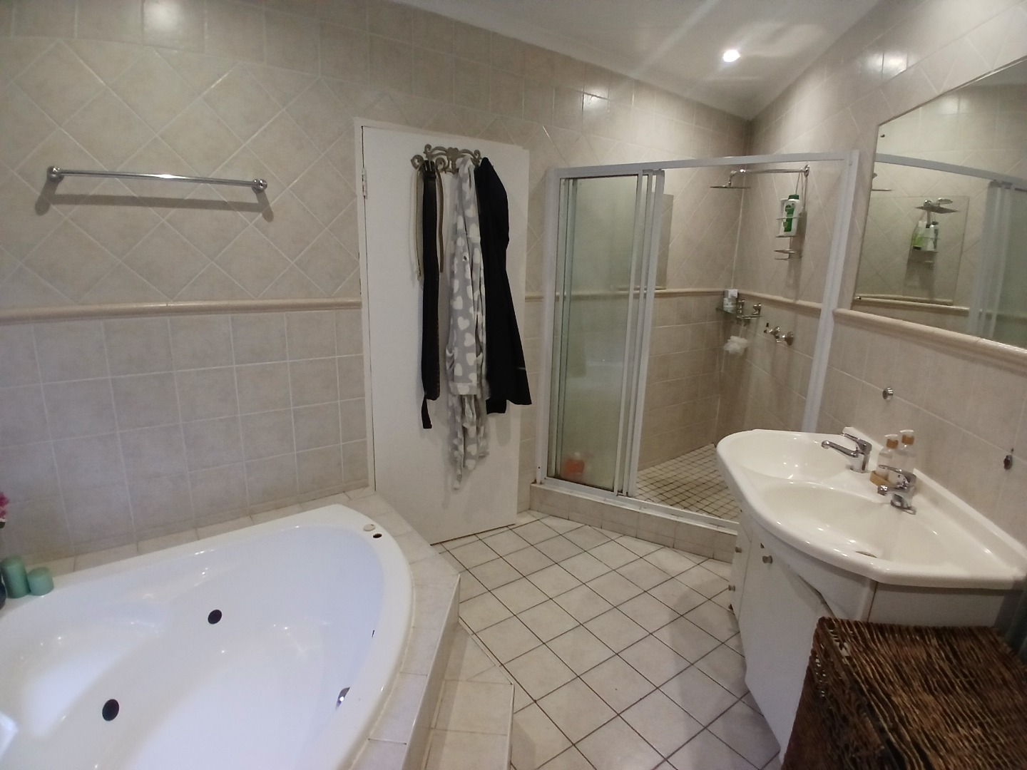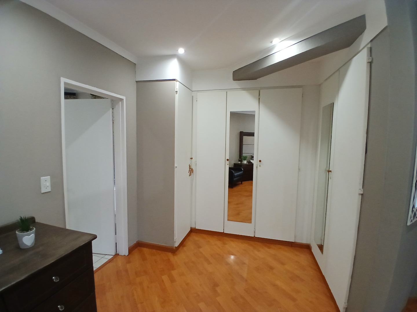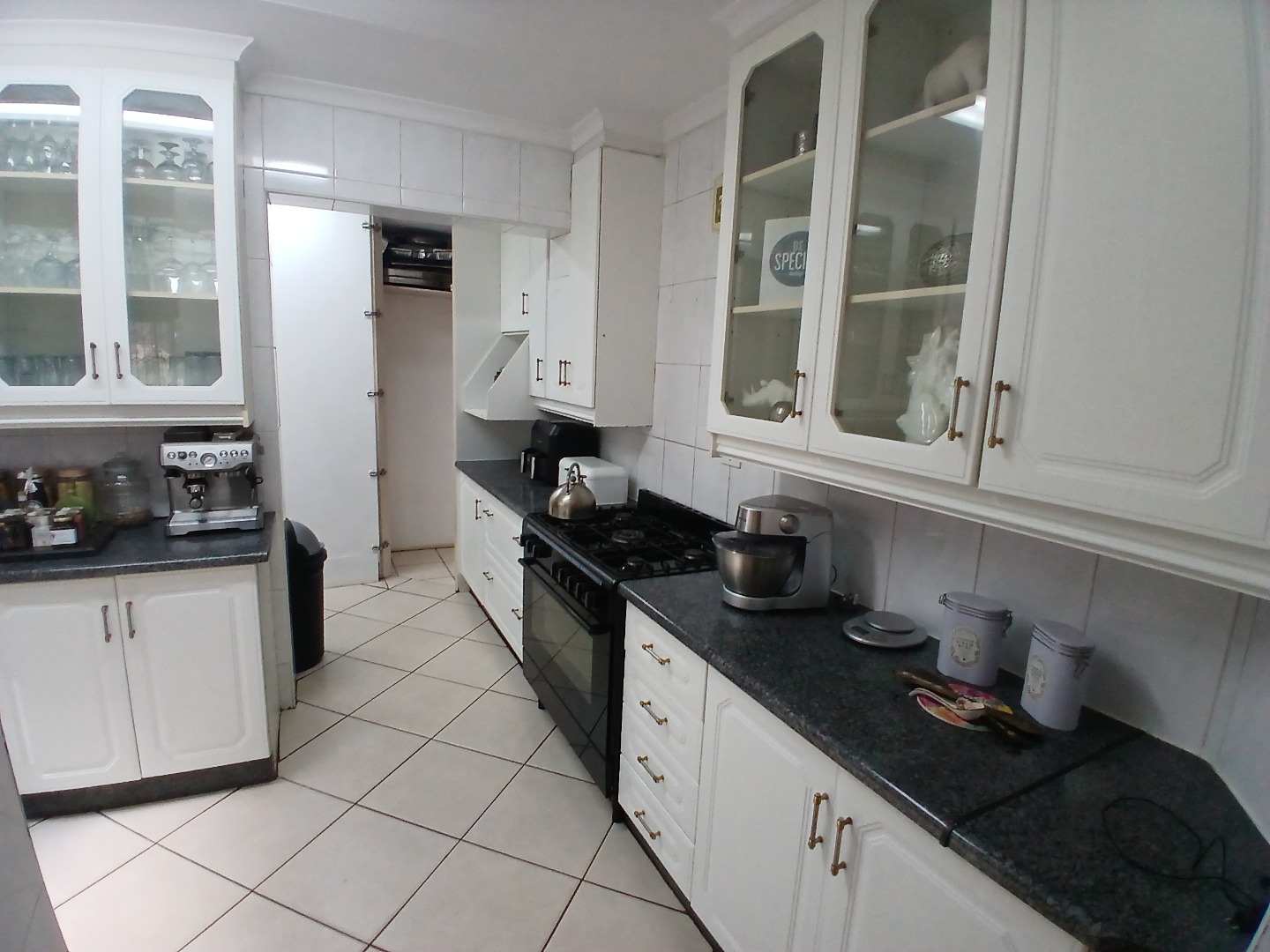 4 large bedrooms: Main bedroom with sliding doors to the garden, ample built-in cupboards and full tiled en-suite bathroom, 3 additional bedrooms serviced by two bathrooms (one en-suite). The kitchen is bright with white cabinetry, pantry, washing bay and separate laundry.