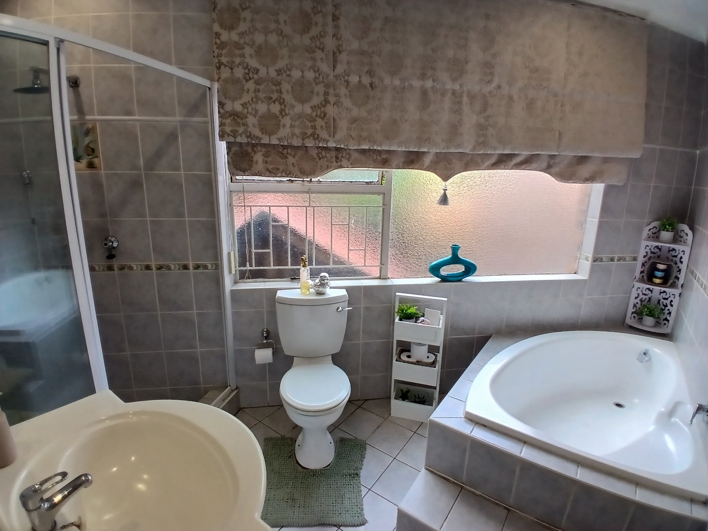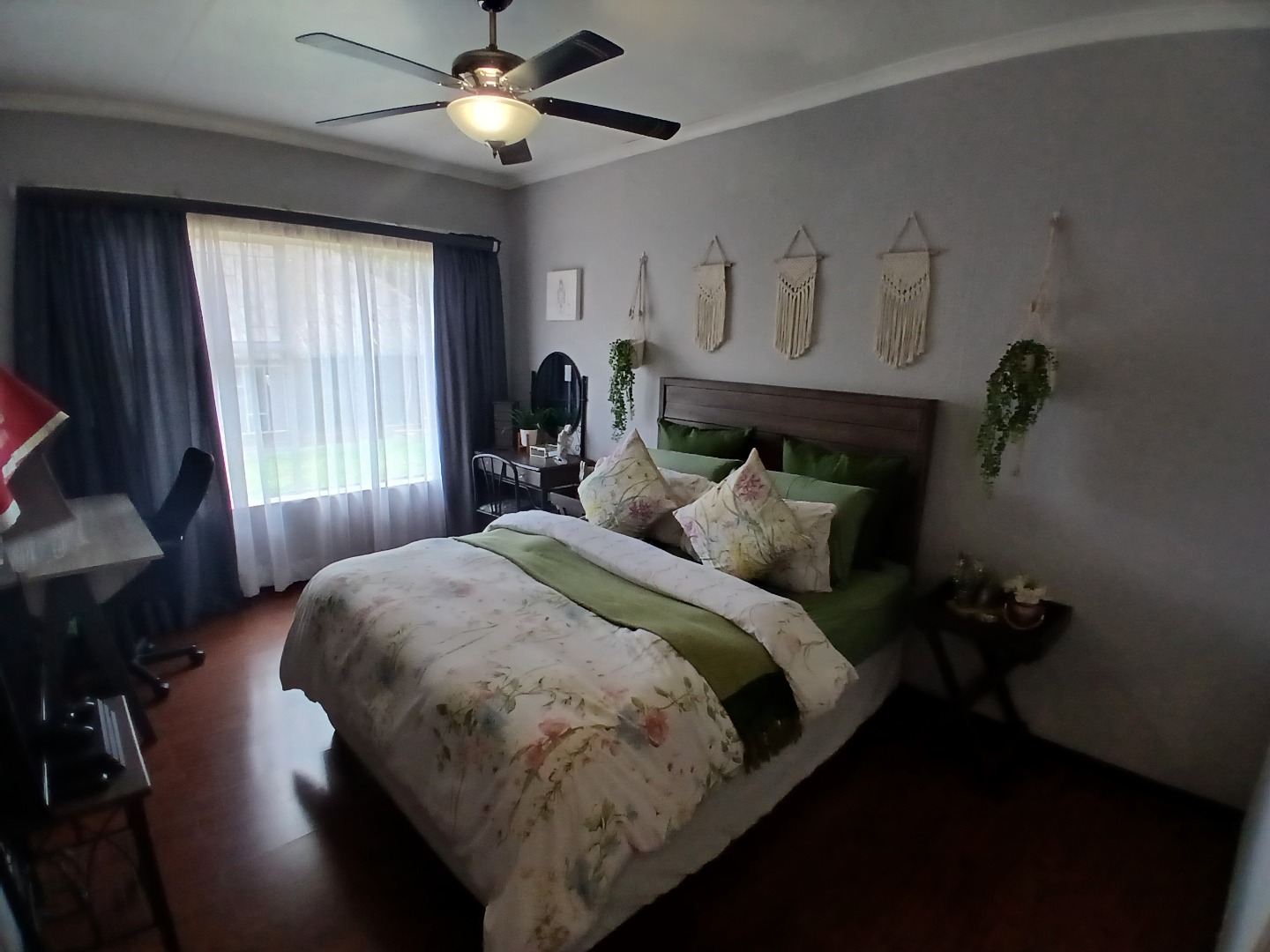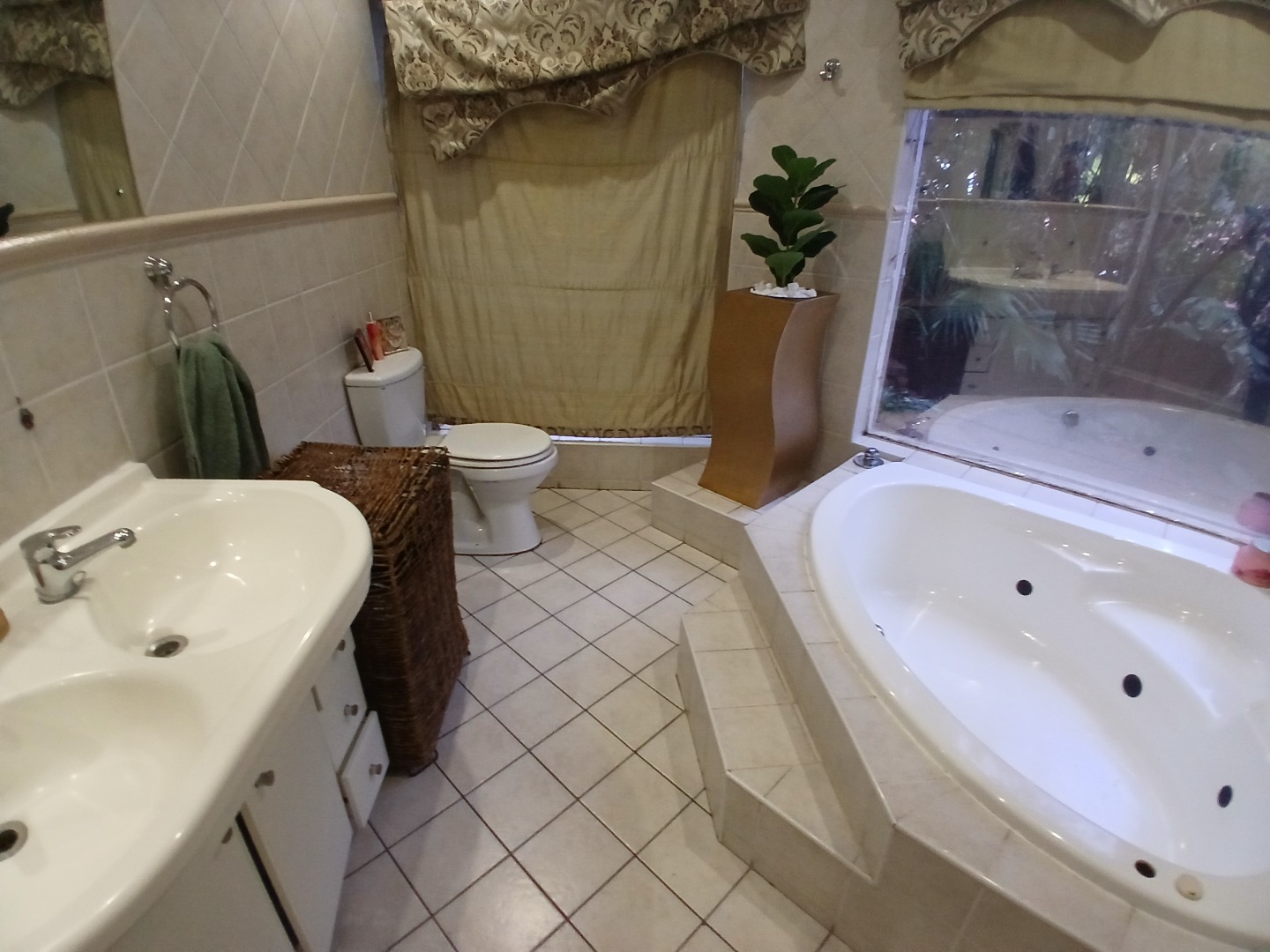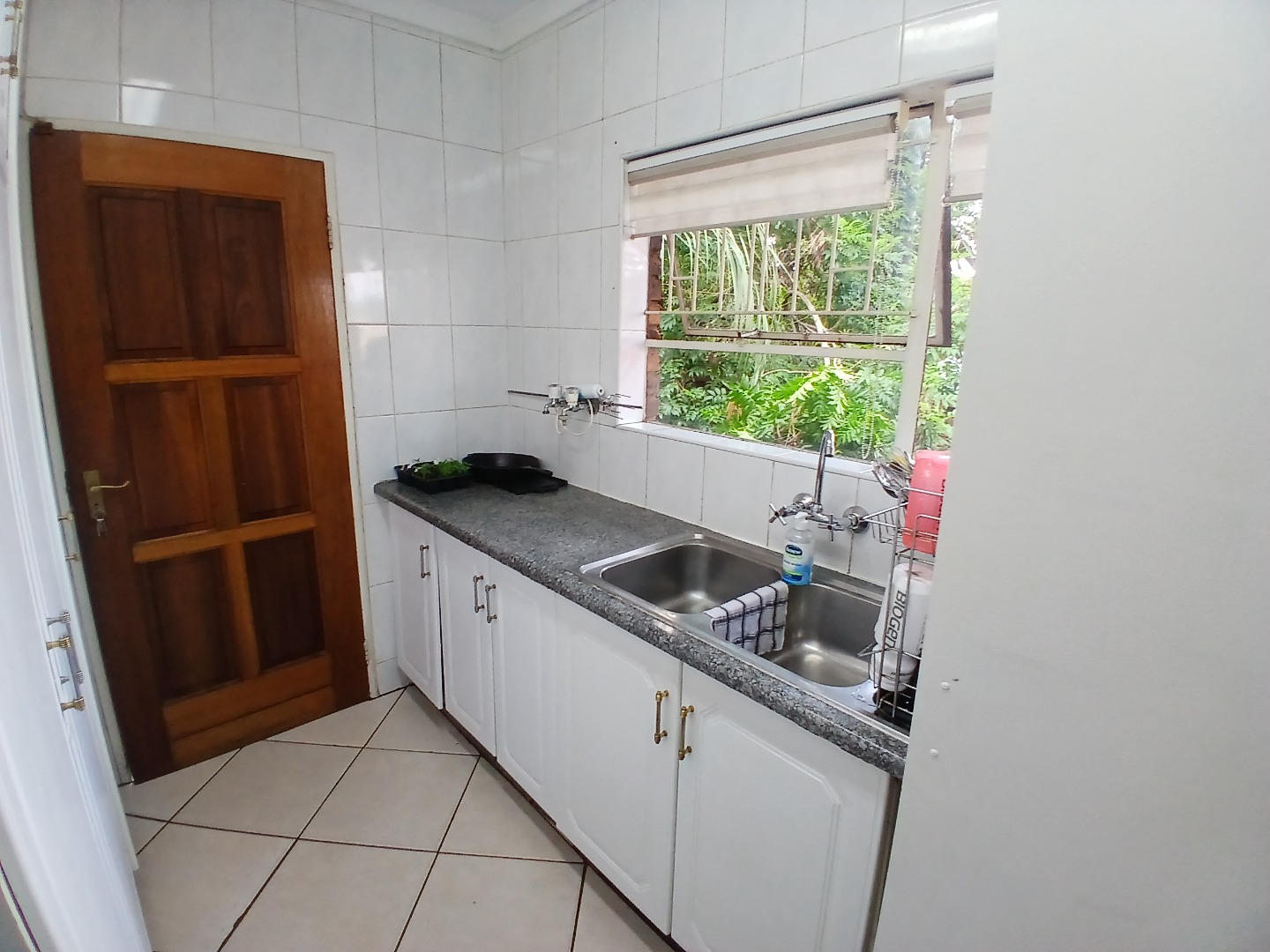 4 large bedrooms: Main bedroom with sliding doors to the garden, ample built-in cupboards and full tiled en-suite bathroom, 3 additional bedrooms serviced by two bathrooms (one en-suite). The kitchen is bright with white cabinetry, pantry, washing bay and separate laundry.