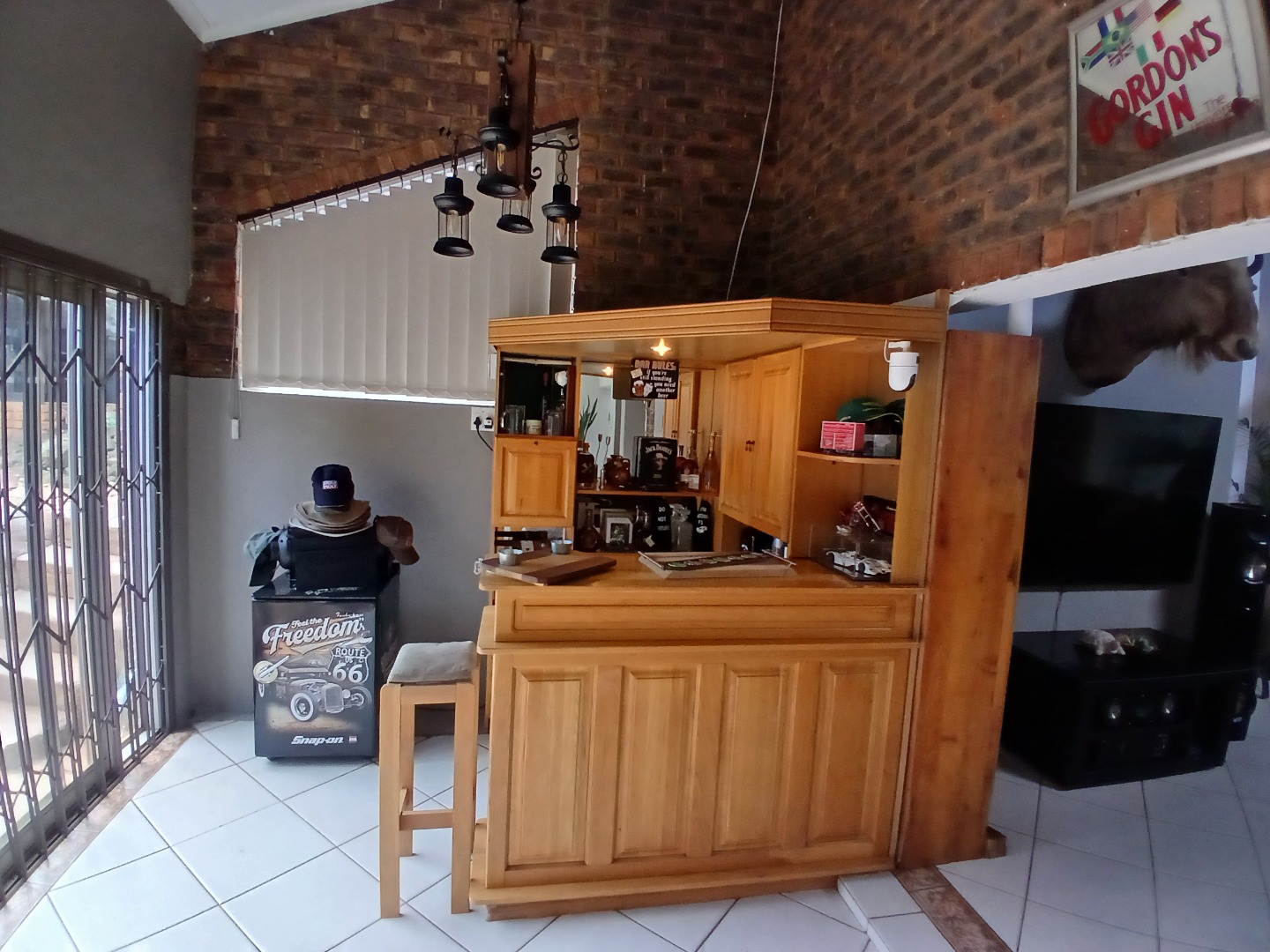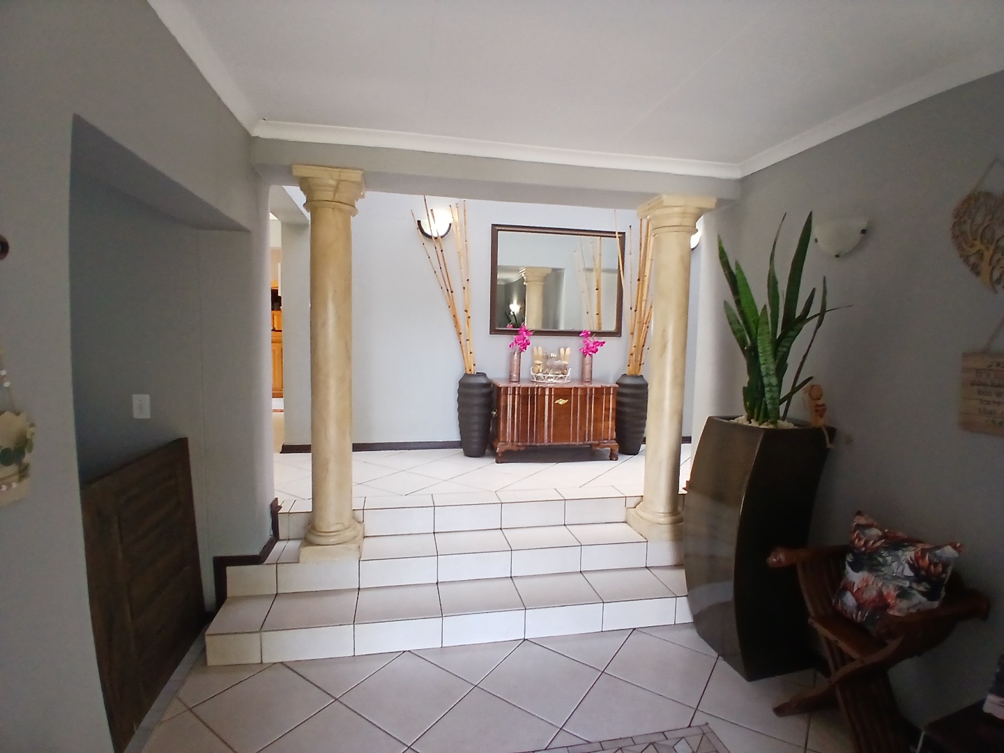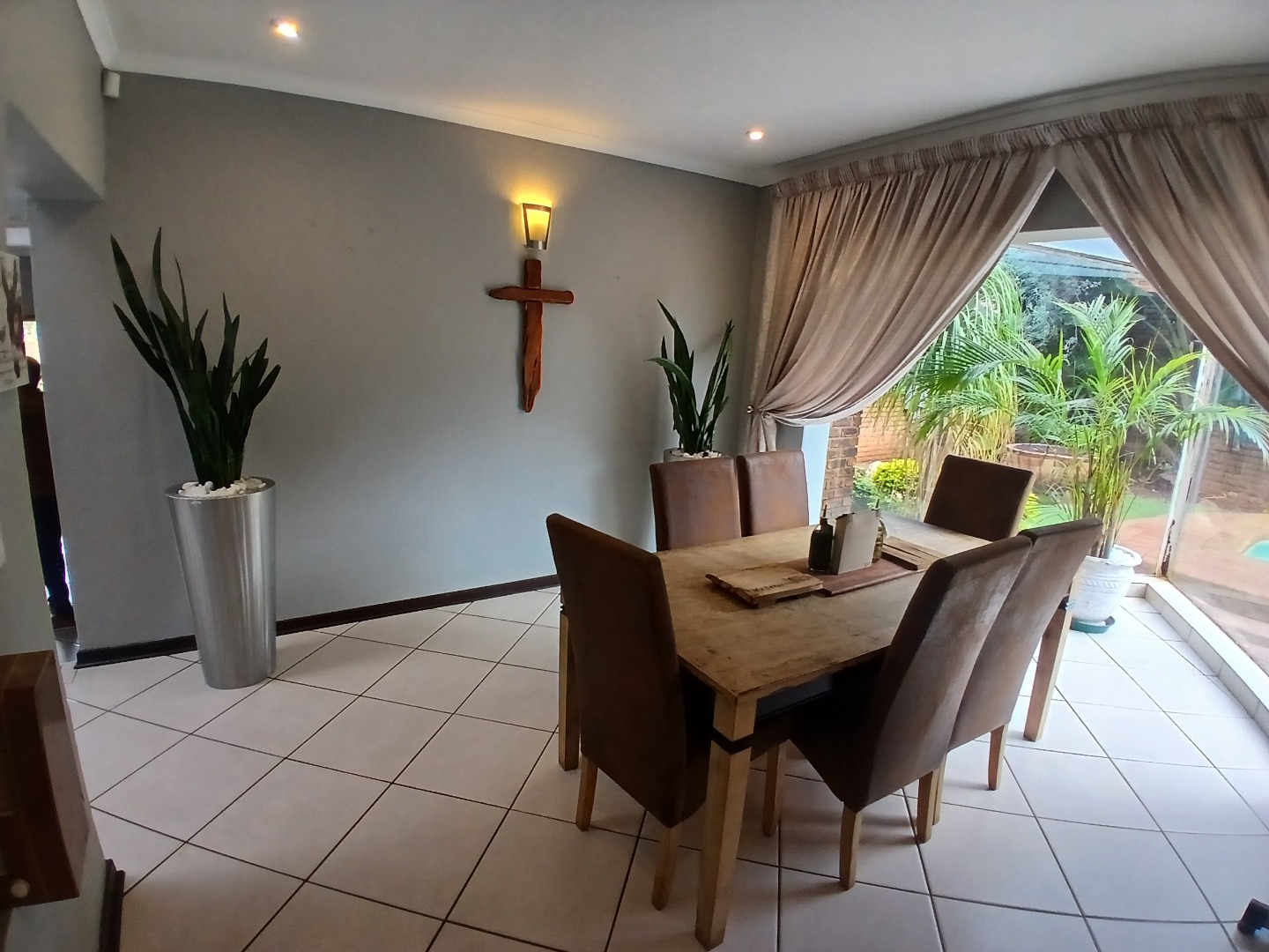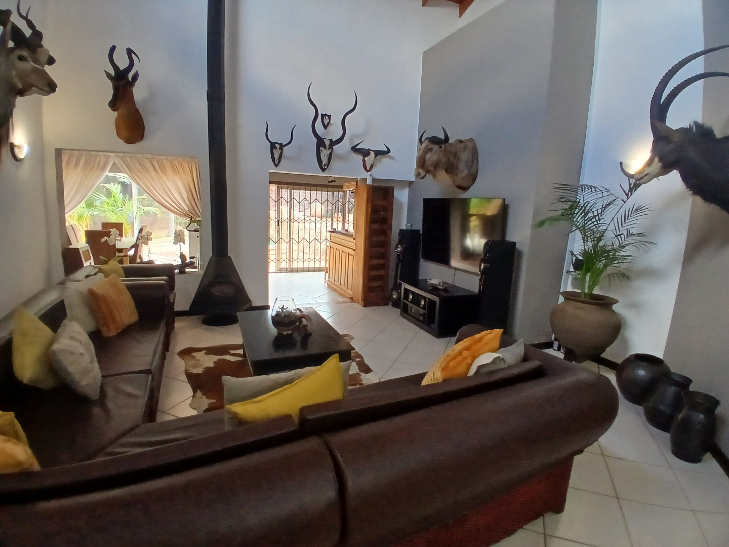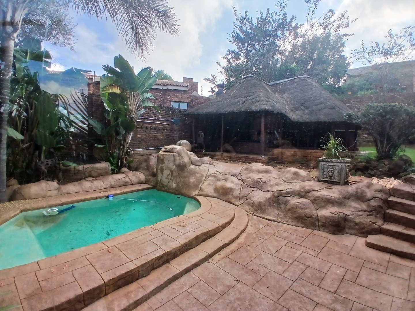Key features: A spacious tiled entrance hall leading to airy open-plan living areas with high ceilings, main lounge with fireplace, recreation room with built-in bar and indoor braai ,dining room with large windows overlooking garden, lapa and sparkling rock pool.