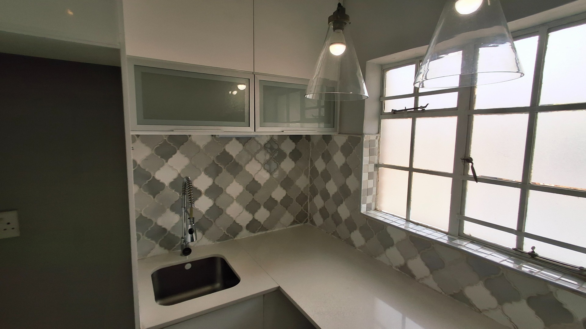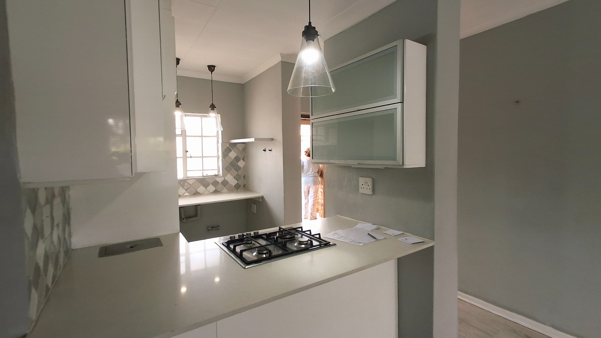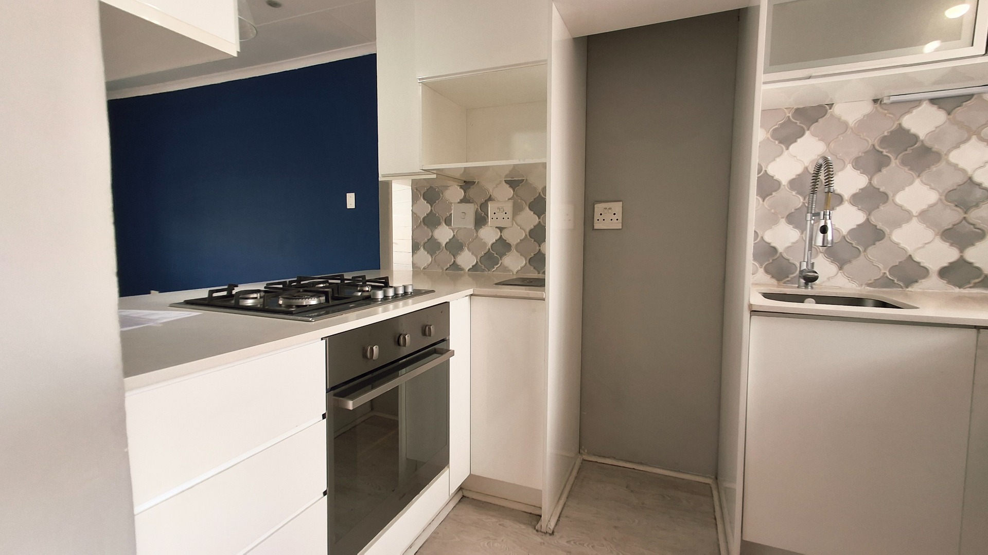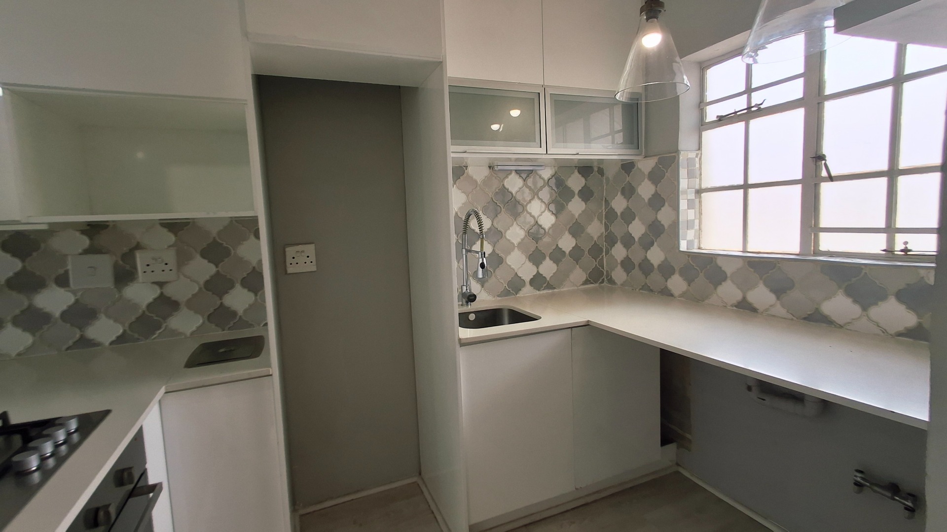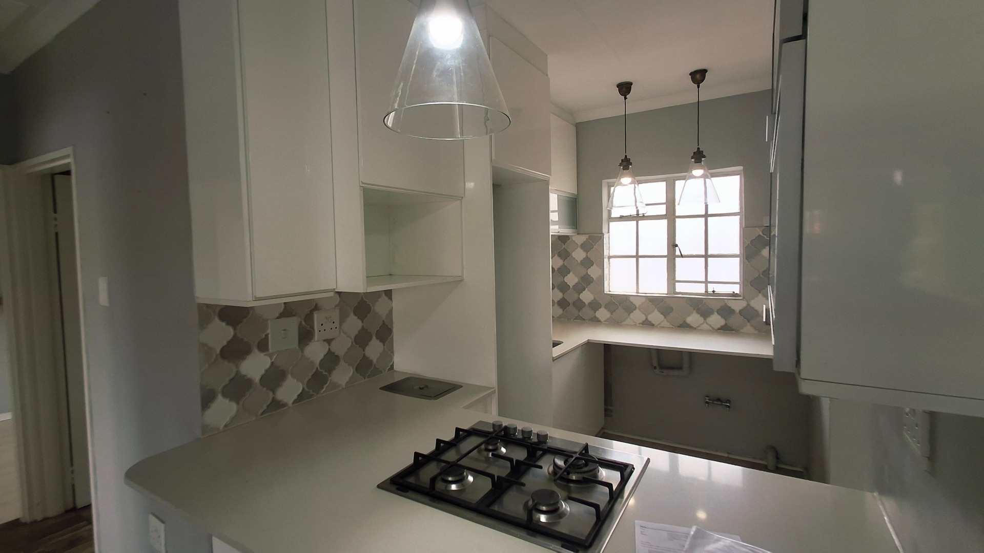 Discover modern living in this inviting apartment, featuring a stylish kitchen with white cabinetry, light countertops, gas hob, and decorative tiled backsplash.