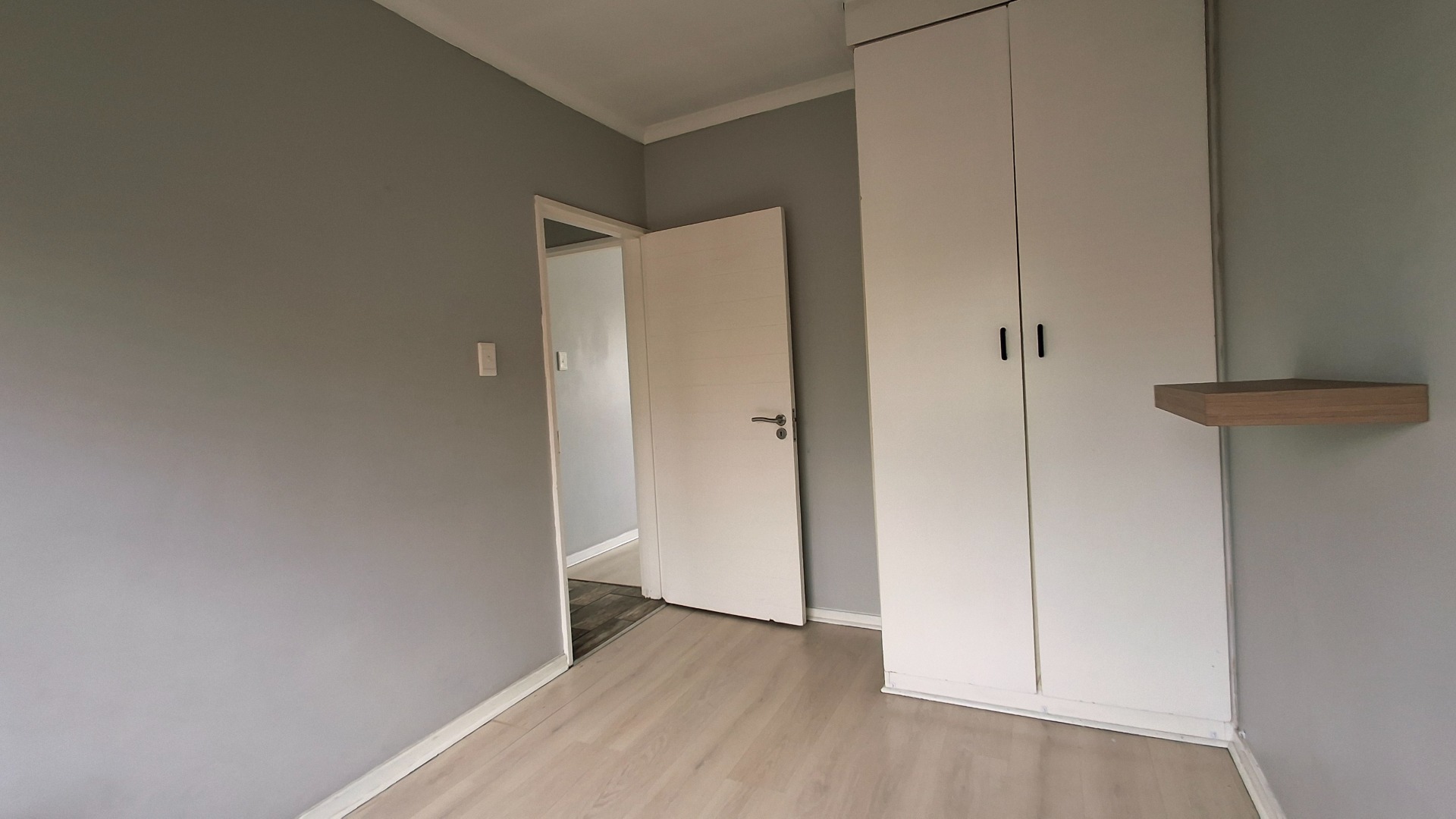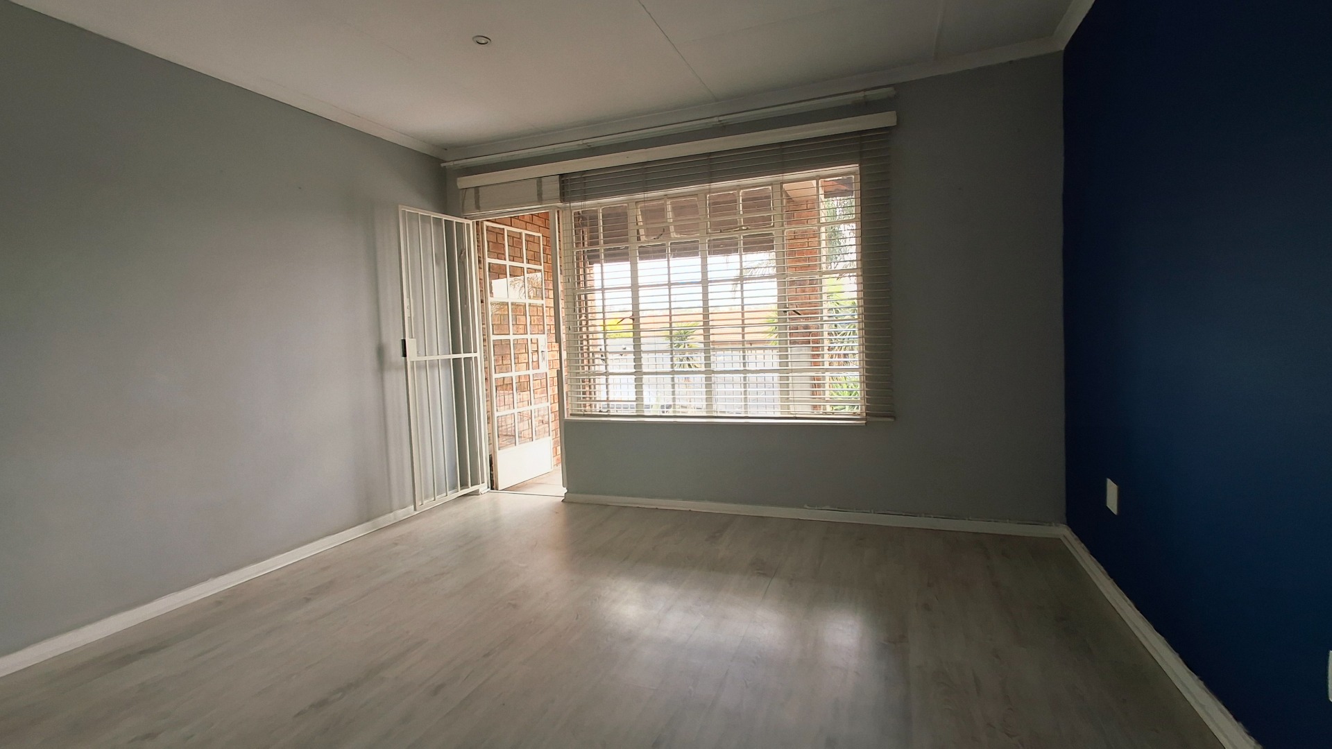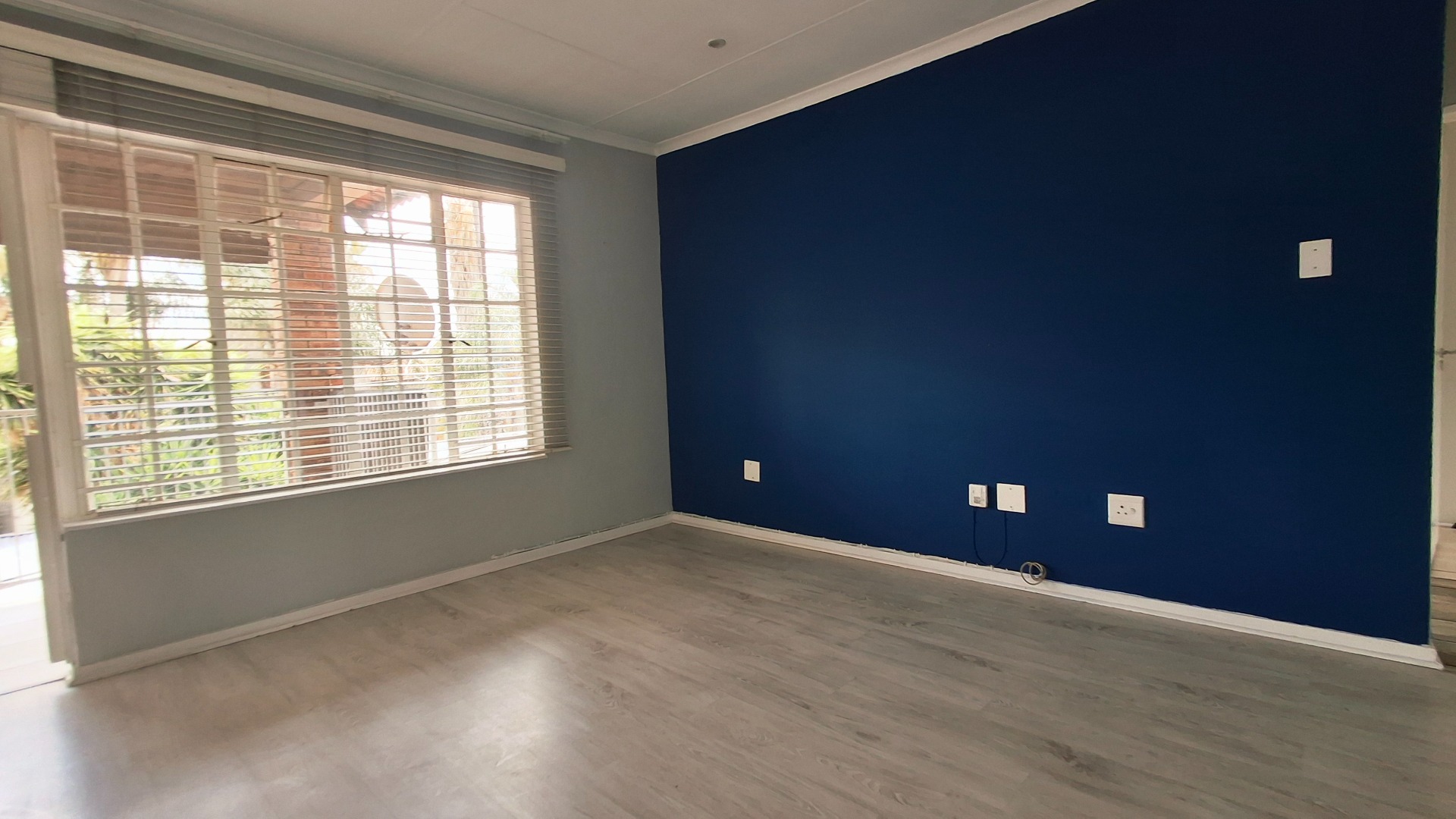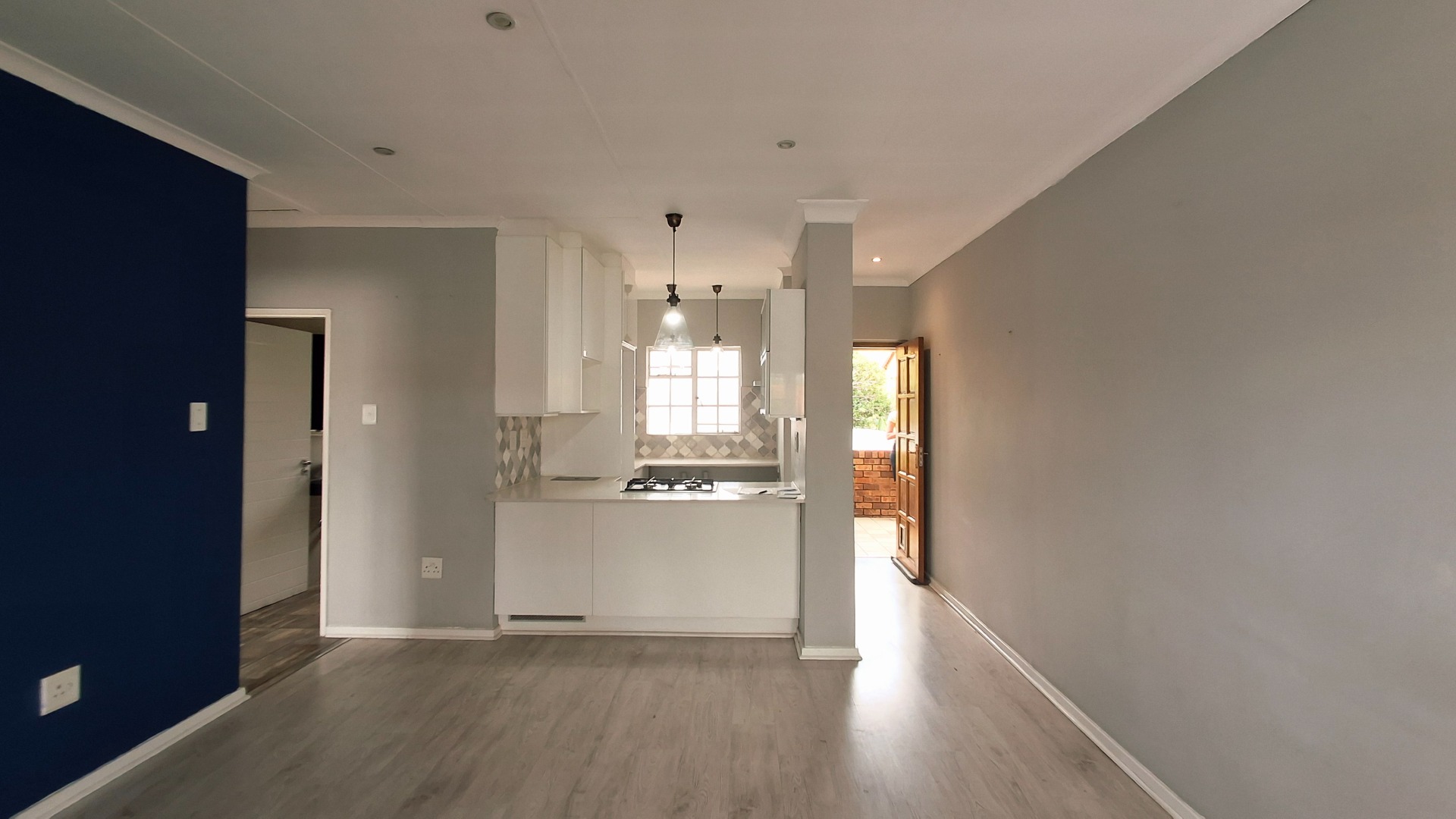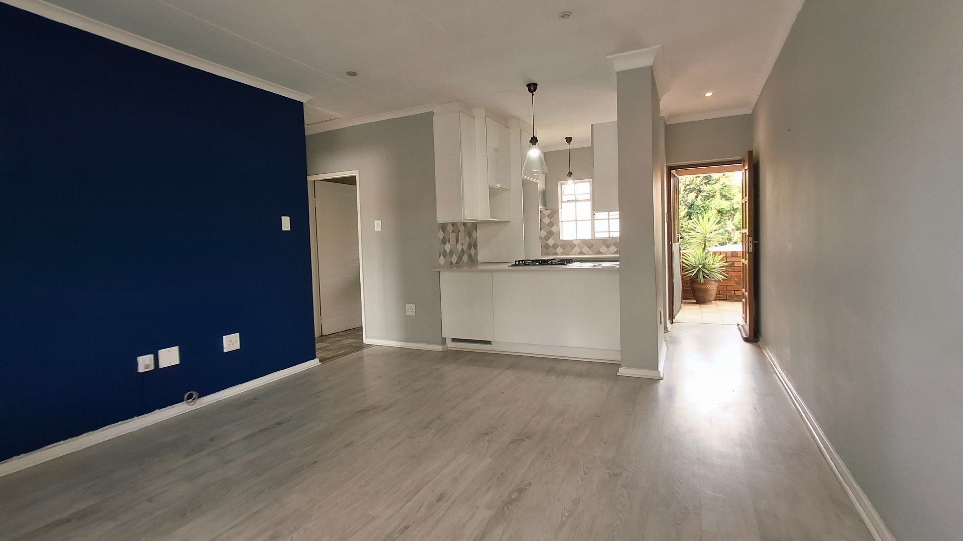 The open-plan living area flows seamlessly, enhanced by laminate flooring, fresh paint, and a bold navy accent wall. Bedrooms continue the modern aesthetic, while the private balcony offers a serene retreat.