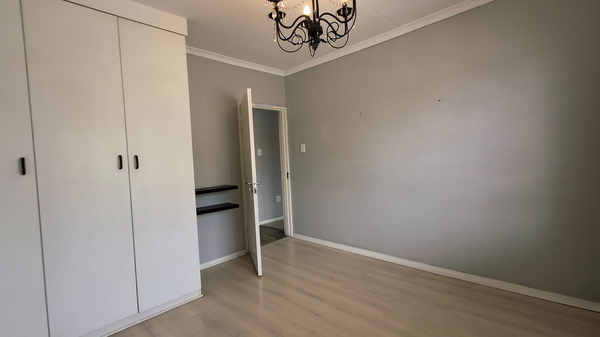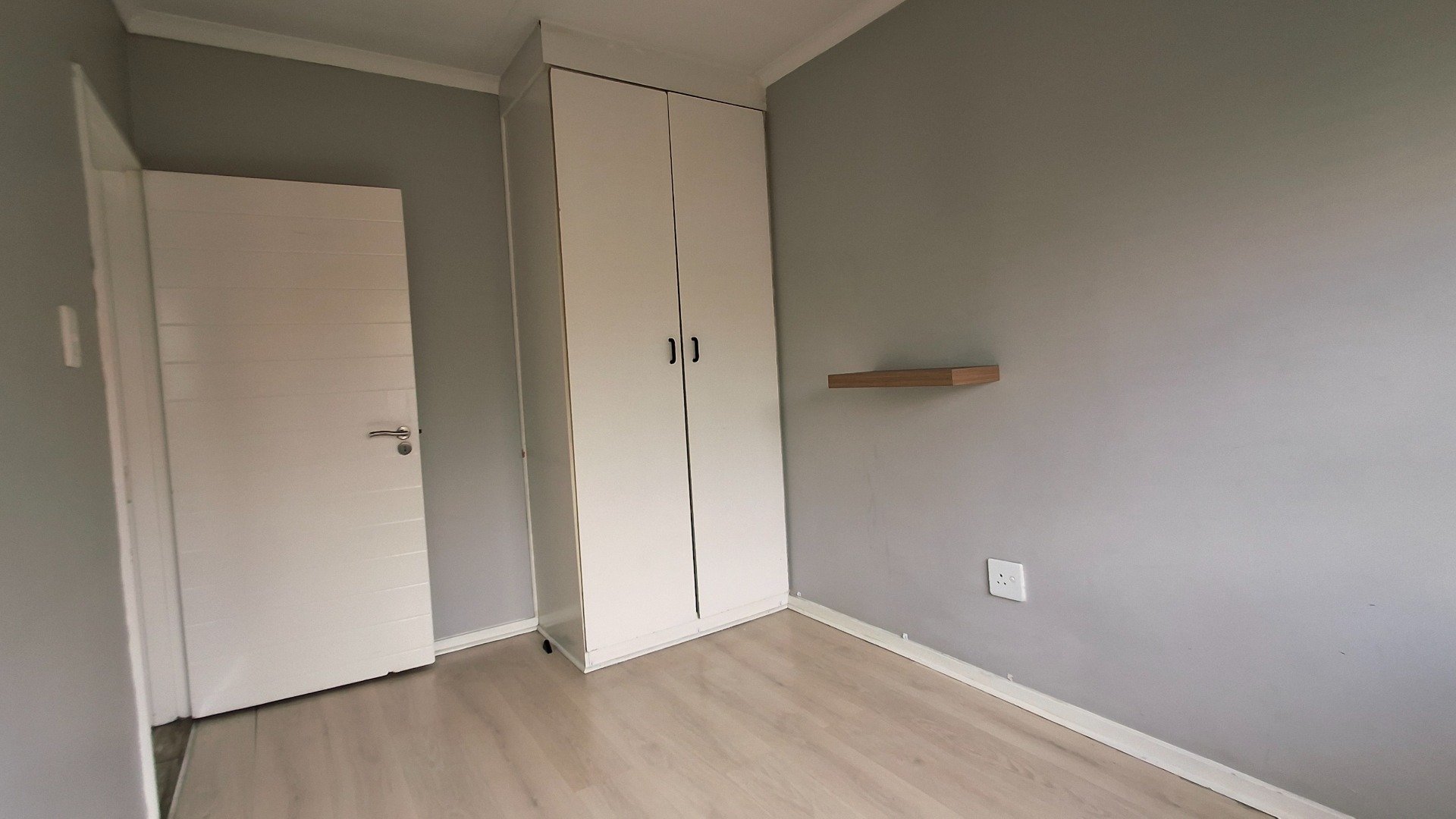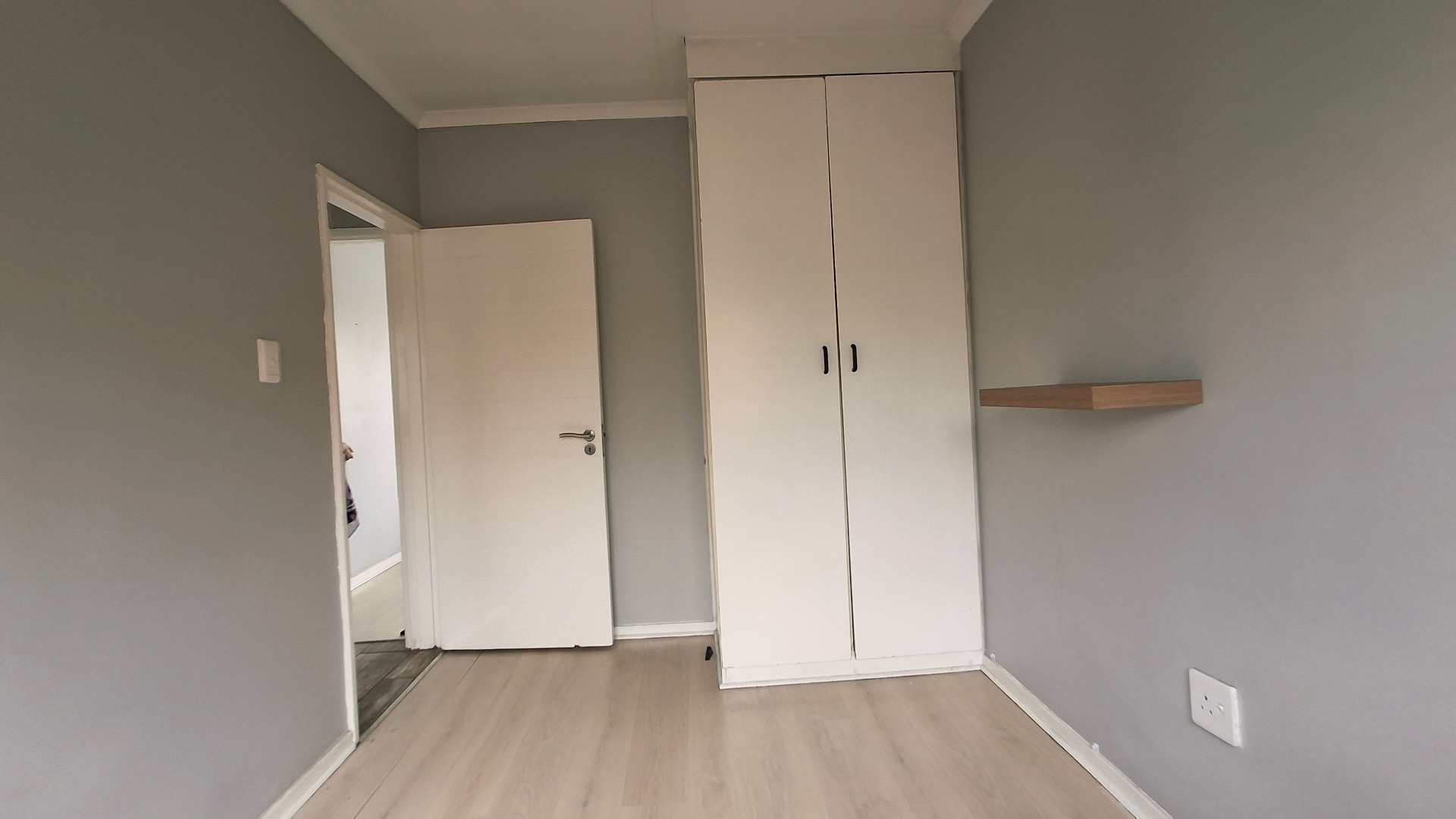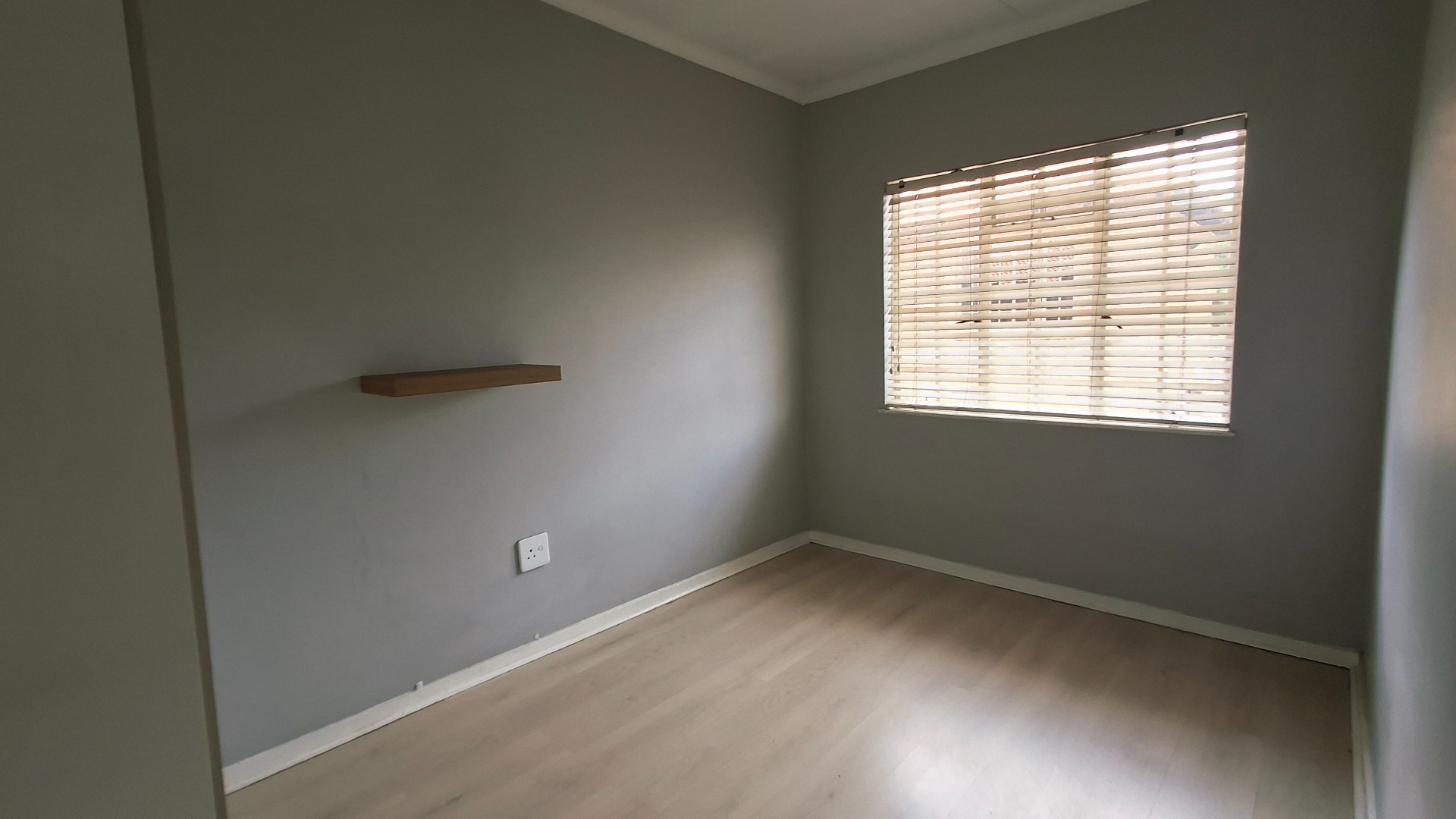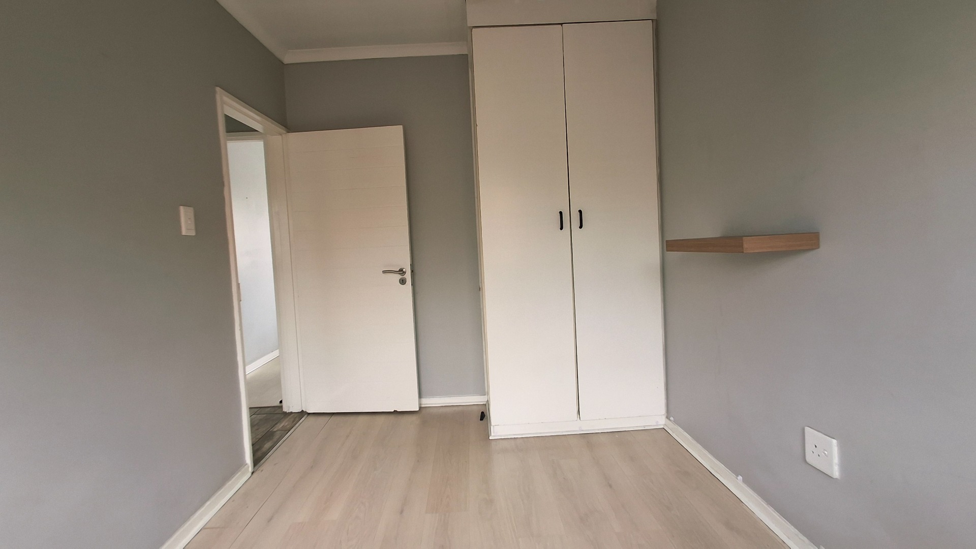 The open-plan living area flows seamlessly, enhanced by laminate flooring, fresh paint, and a bold navy accent wall. Bedrooms continue the modern aesthetic, while the private balcony offers a serene retreat.