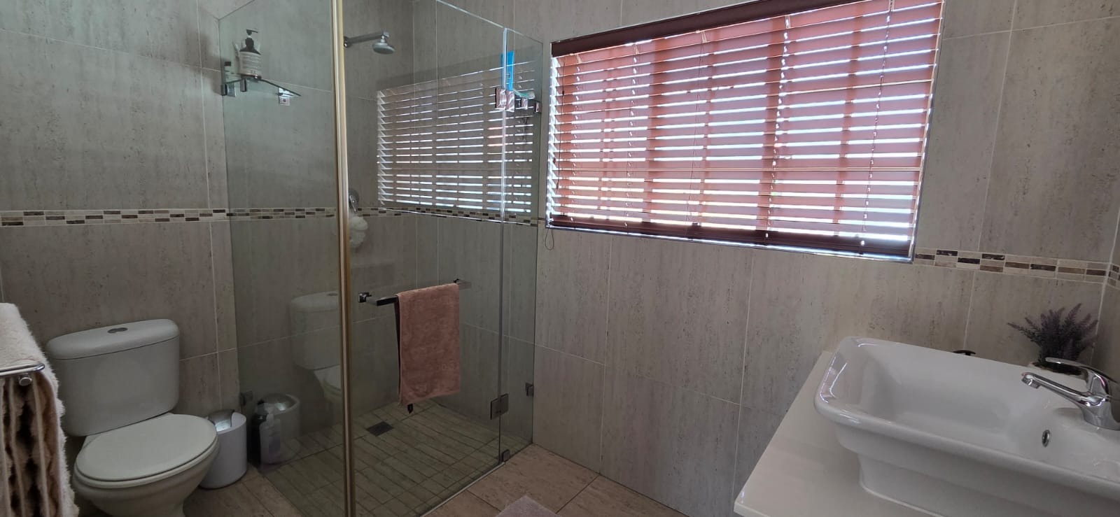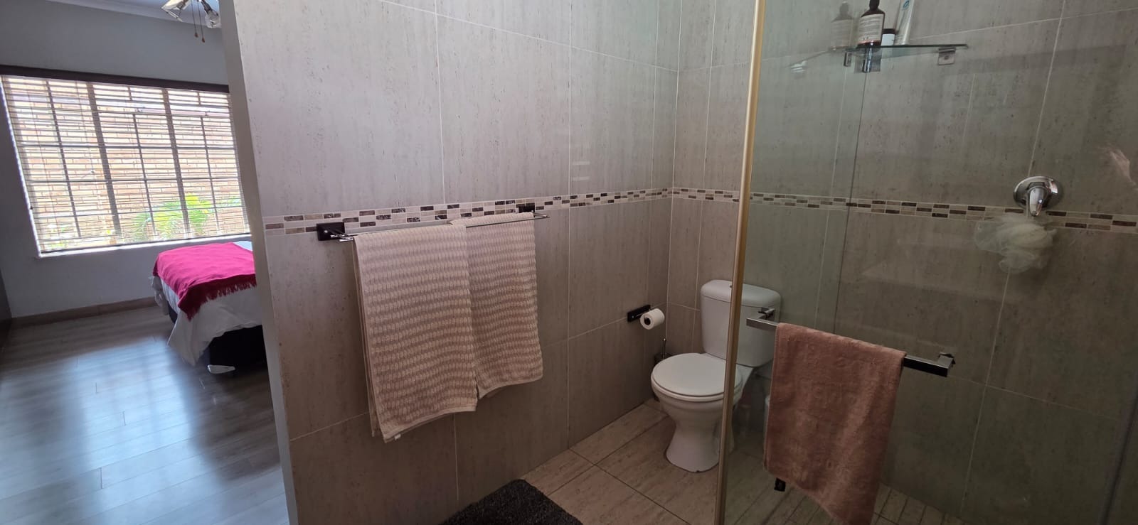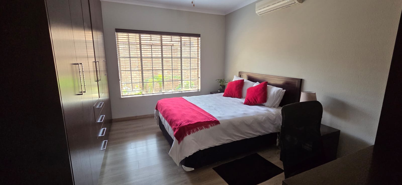 Three spacious bedrooms with laminated floors provide comfort for the whole family, complemented by two modern bathrooms. The main en-suite is a standout, complete with a walk-in shower, basin, toilet, and your own air-conditioned retreat.