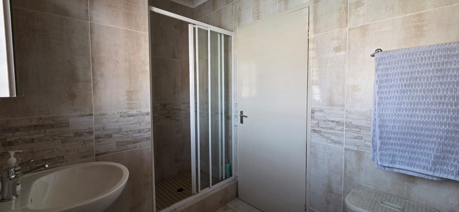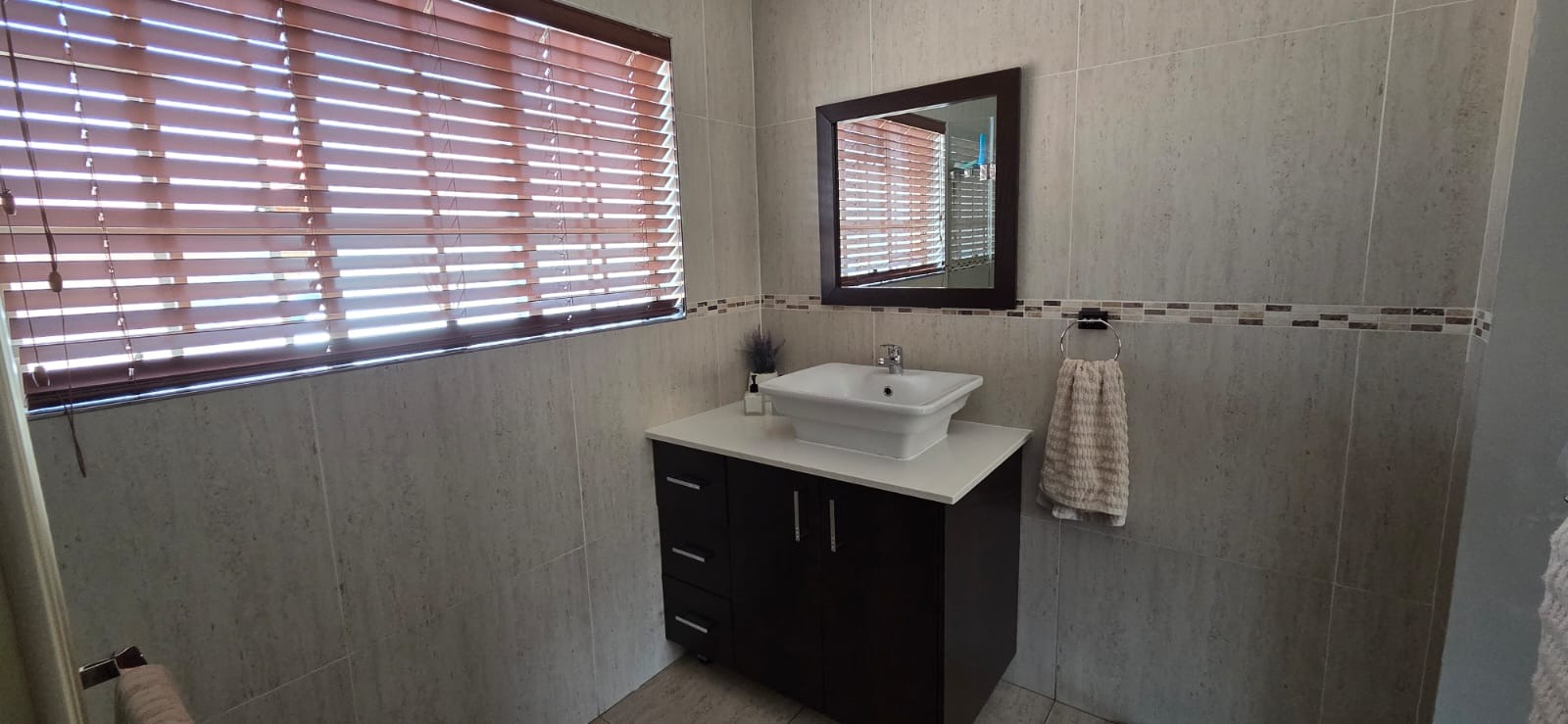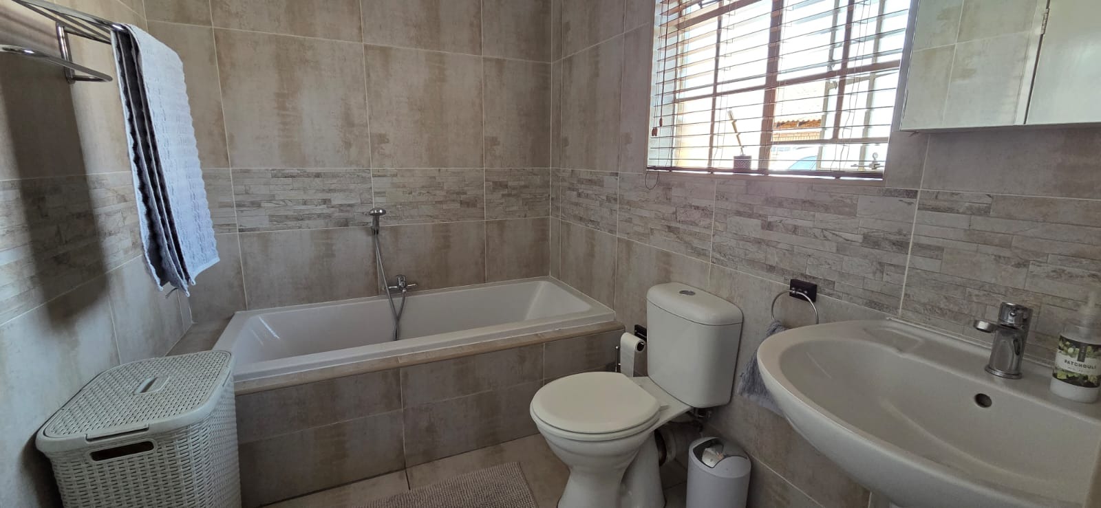 Three spacious bedrooms with laminated floors provide comfort for the whole family, complemented by two modern bathrooms. The main en-suite is a standout, complete with a walk-in shower, basin, toilet, and your own air-conditioned retreat.