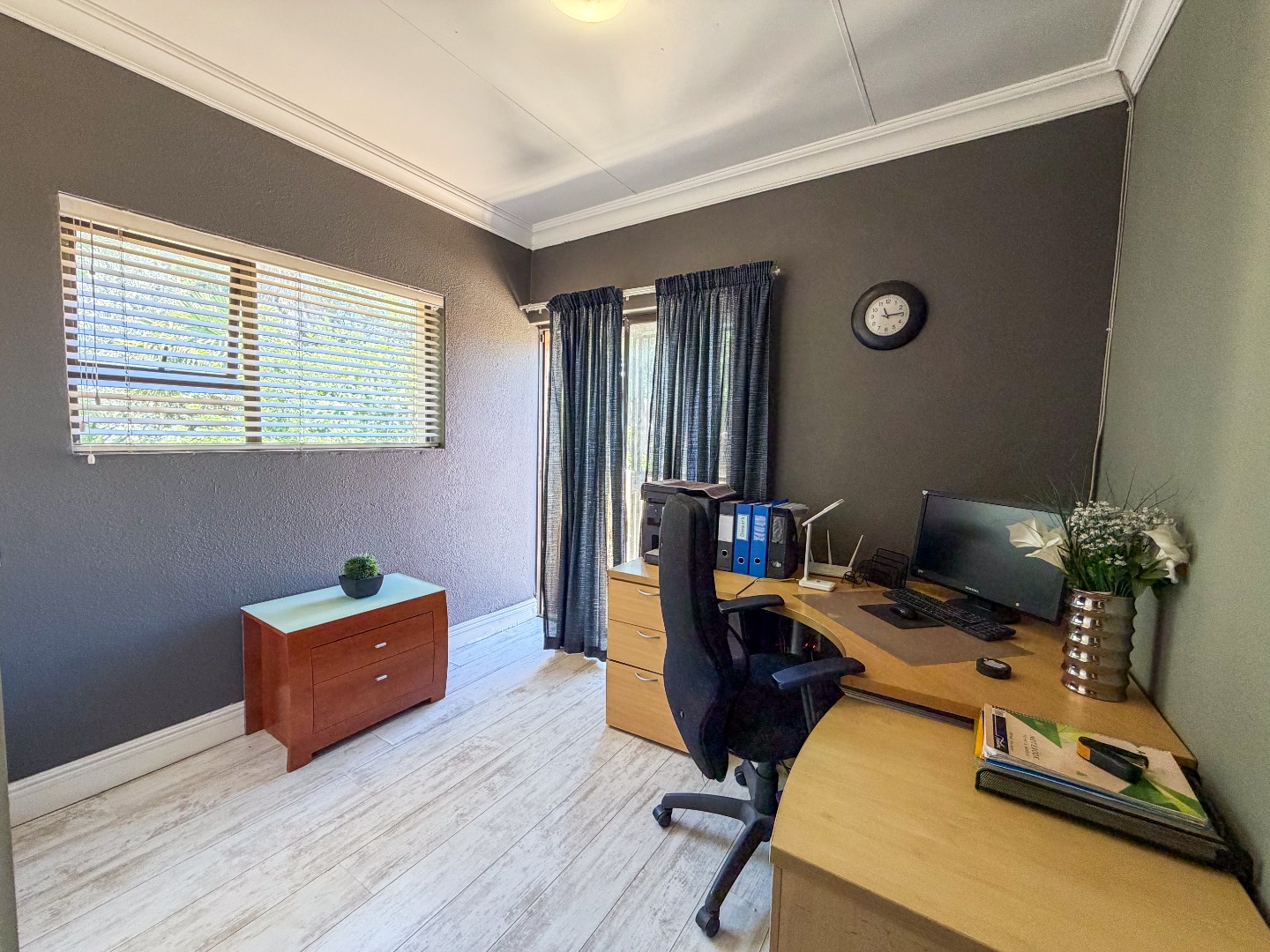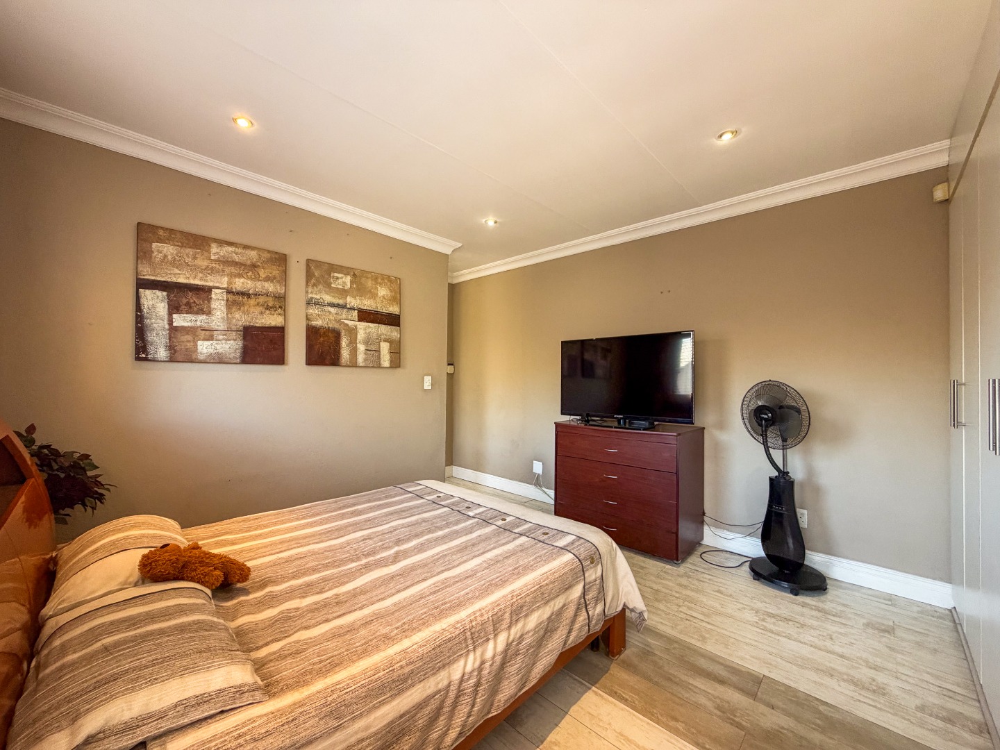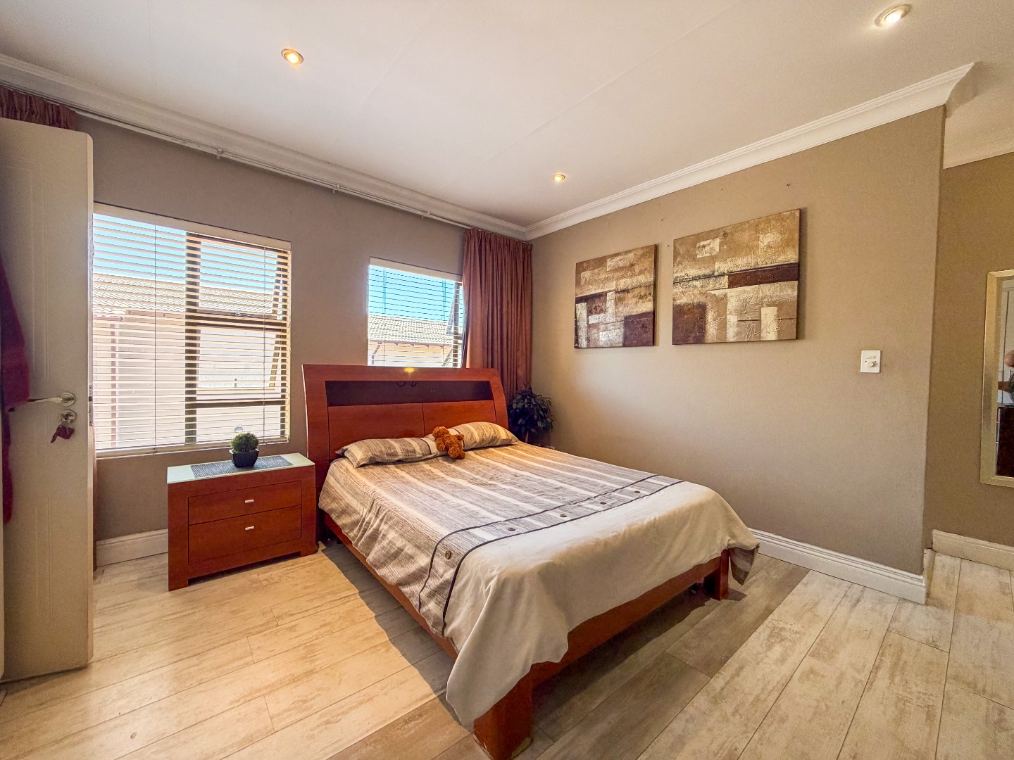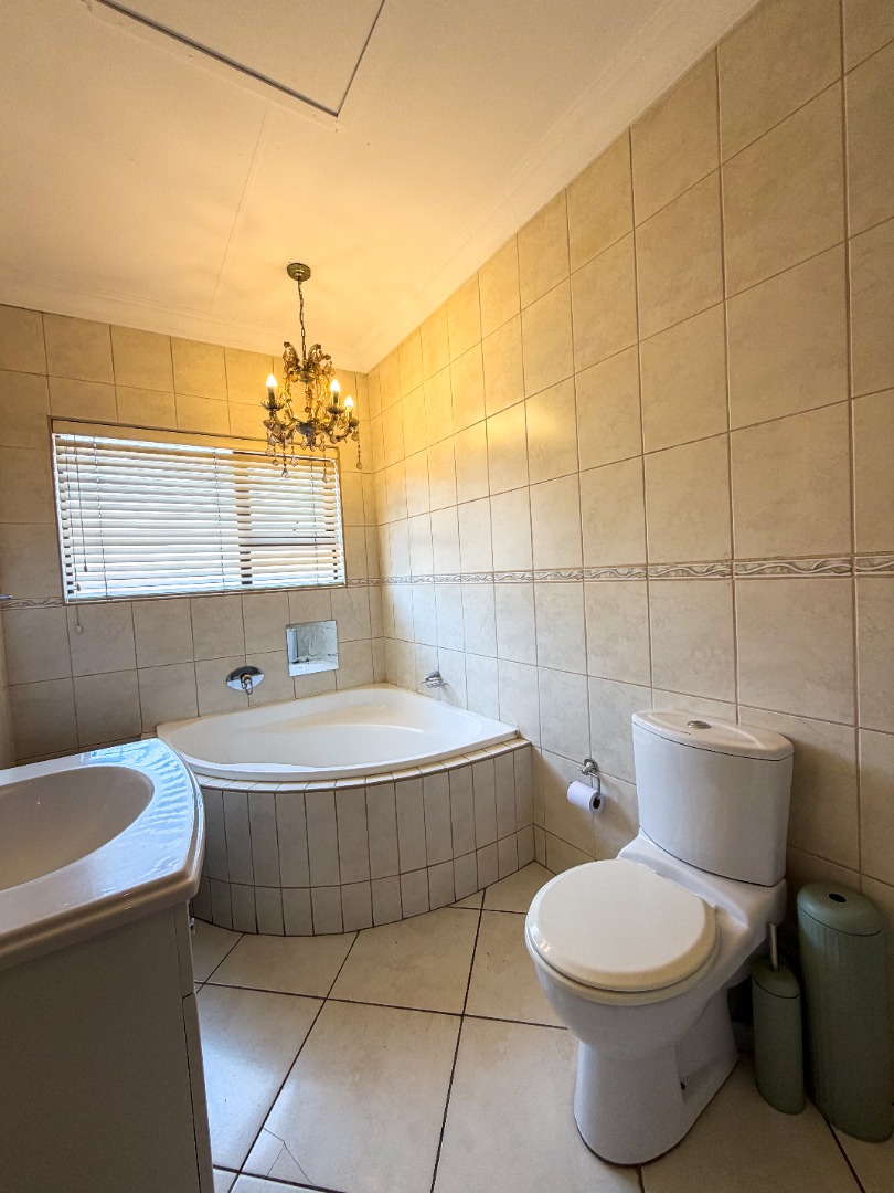 Upstairs, you’ll find three well-appointed bedrooms with built-in cupboards and elegant laminated flooring. The home includes two and a half modern bathrooms, featuring a combination of a bath, shower, basin, and toilet, as well as a guest toilet downstairs.