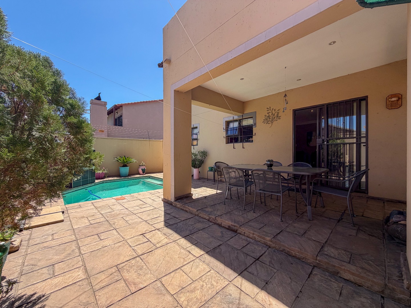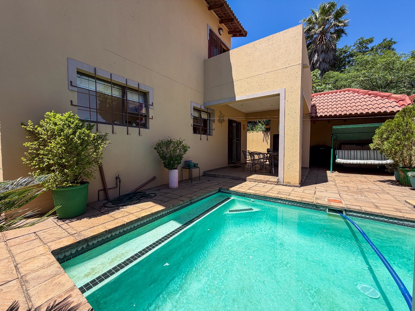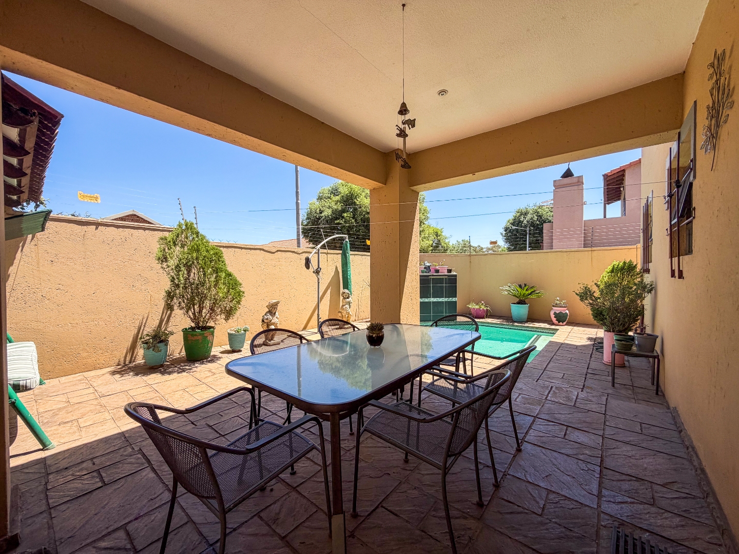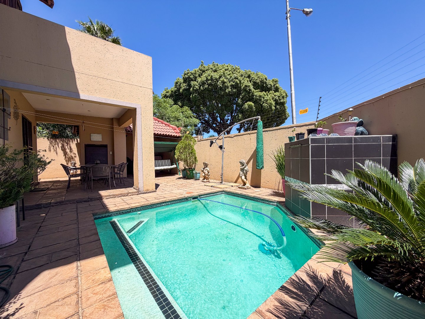 The lounge and dining areas are enhanced with stylish downlights, adding warmth and sophistication. Step outside to the covered entertainment patio, perfect for relaxing or hosting gatherings. The private, pet-friendly garden includes a sparkling swimming pool, offering the ultimate outdoor retreat.