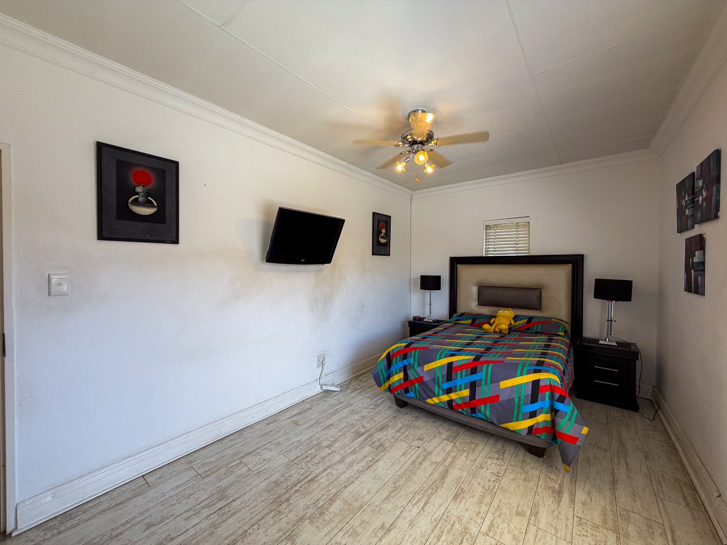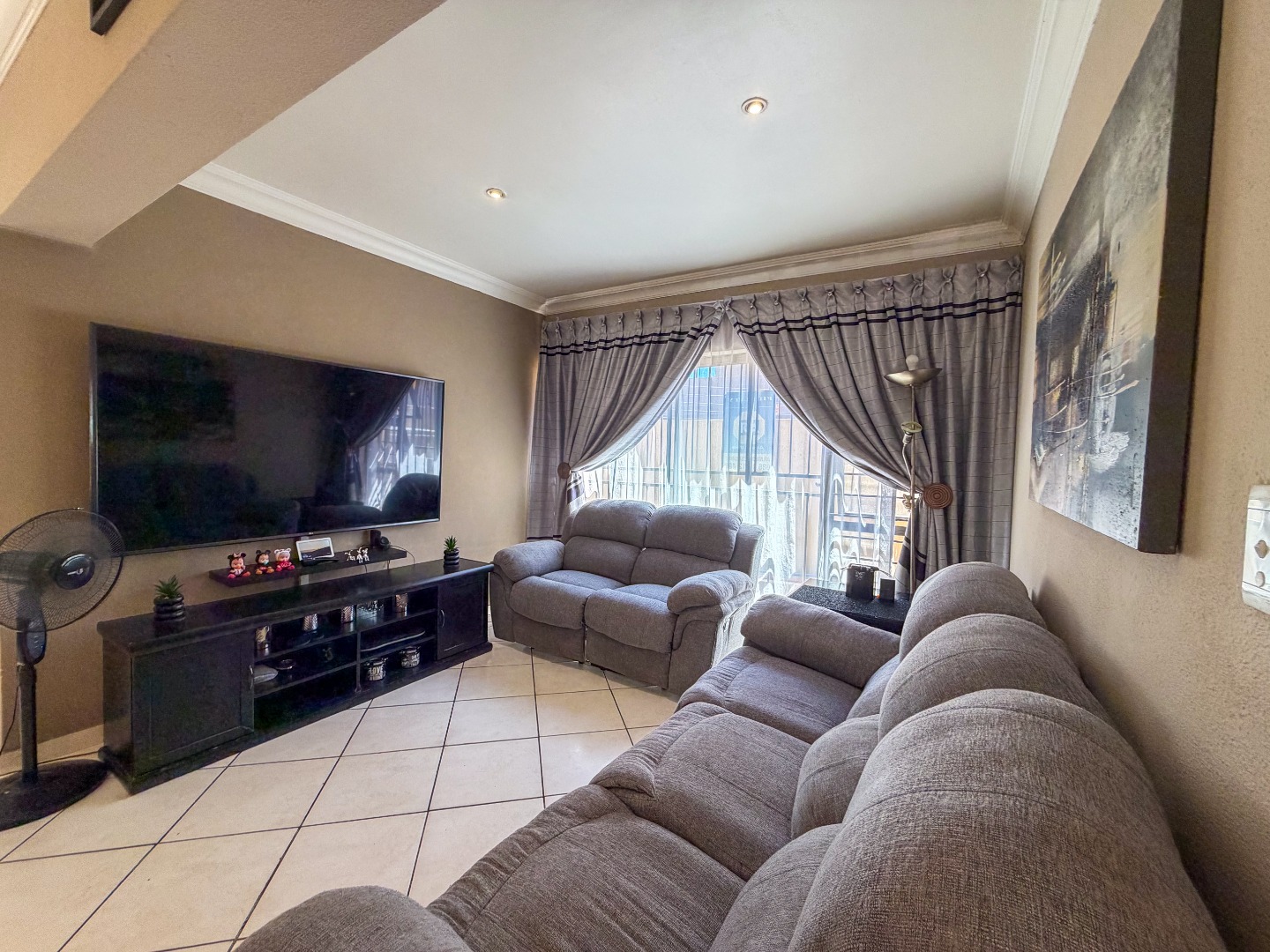 The spacious open-plan layout seamlessly connects the lounge, dining area, and contemporary kitchen, creating an inviting space ideal for both everyday living and entertaining. The kitchen features granite countertops, ample built-in cupboards, a glass hob, under-counter oven, and a separate scullery for added convenience.